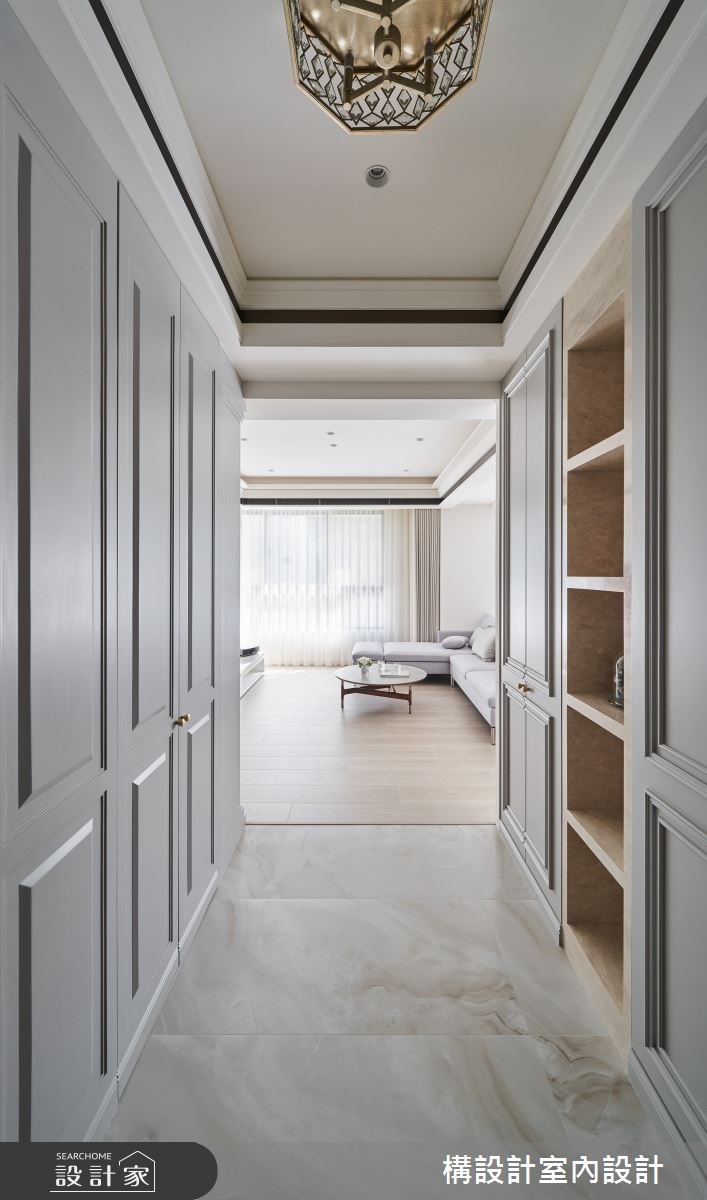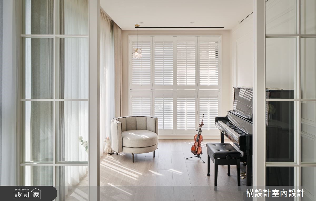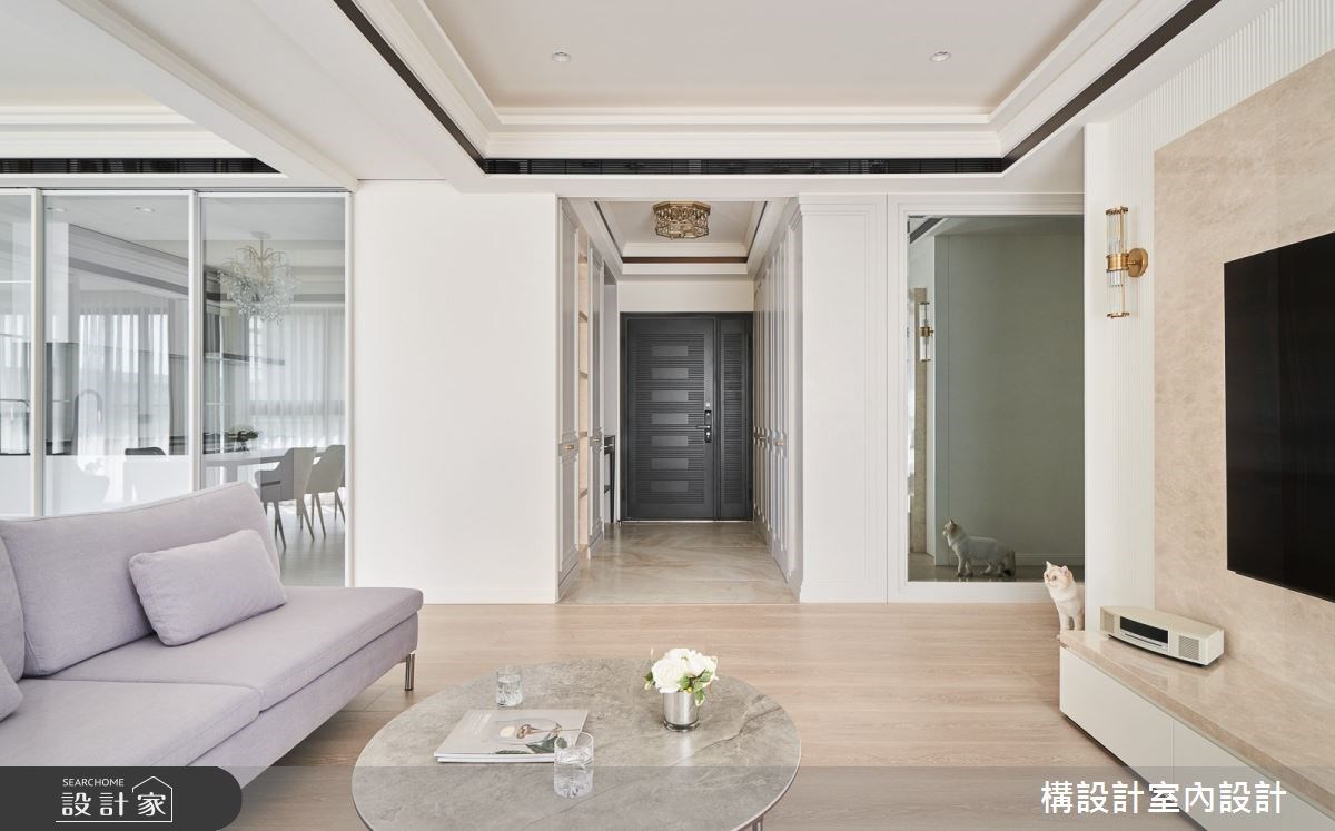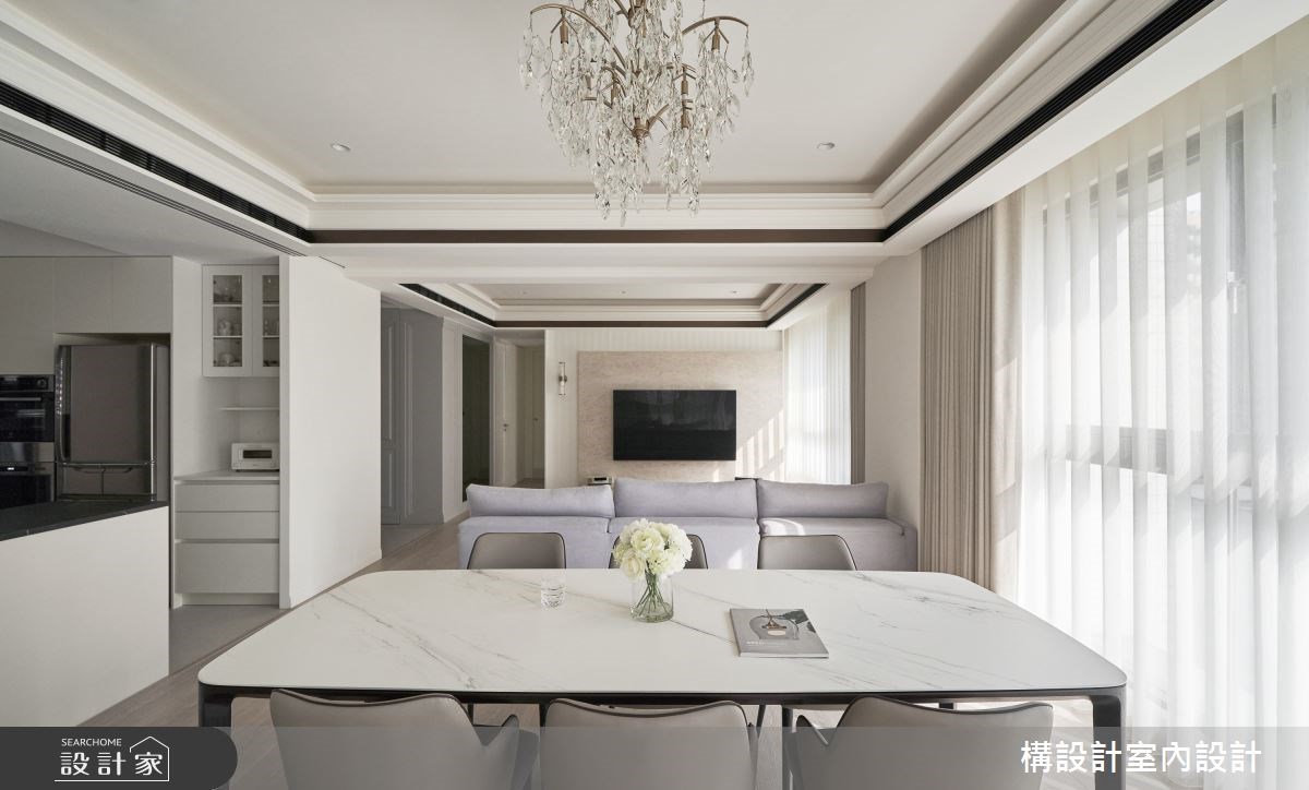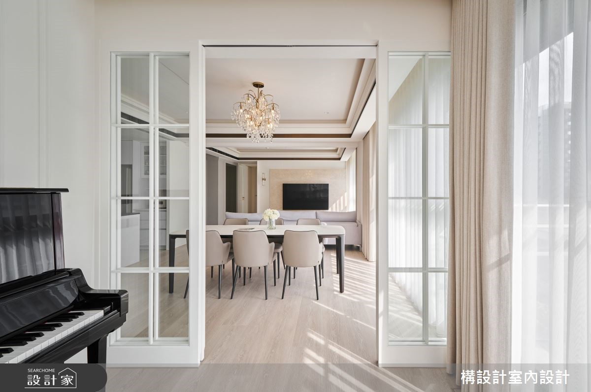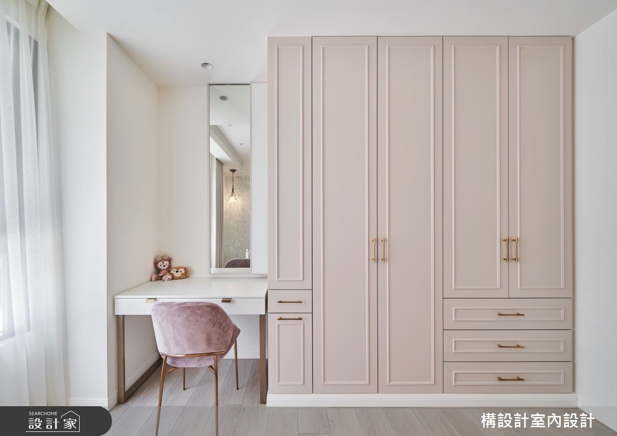 50 坪中古屋重整格局,拆除隔间後找回了坪数优势,腾出空间规划充足收纳和储藏室,原本恼人的住宅大梁成为客餐厅的暧昧分野,最後将原始隔间墙改为玻璃拉门,白百叶修饰了老屋铝窗,用浪漫的新古典语汇实践一家三口的梦想居所。 中古屋旧有格局分割使得空间较狭窄局限,构设计首先重整公领域,拆除不需要的实墙隔间,在玄关长廊两侧规划高身收纳柜与储藏室,优雅线板化收纳为空间端景。顺应公共区域横越的大梁,作为客厅与餐厅的分野,搭配天花板的造型勾边,营造客厅与餐厅的对称美学,而电视墙刻意不做满,用两种材质在平面上创造层次。三房中的练琴阅读区使用玻璃拉门让空间更为弹性,并加装白色百叶窗调节光线,让休闲空间沐浴满满阳光。封闭厨房改为开放式并加装中岛,升级公领域空间感外,更赋予一家三口舒适的烘焙料理环境。 小编的最爱 卧室空间也在格局上重新分配,扩大主卧空间植入独立更衣间,利用收纳柜当作墙面、畸零摆放矮柜增加收纳,也活化从睡眠区、更衣间到卫浴的动线。小孩房依循新古典语汇,在收纳柜上染上淡粉色,浴室则用白色大理石为主体,营造光亮宽敞的沐浴空间。