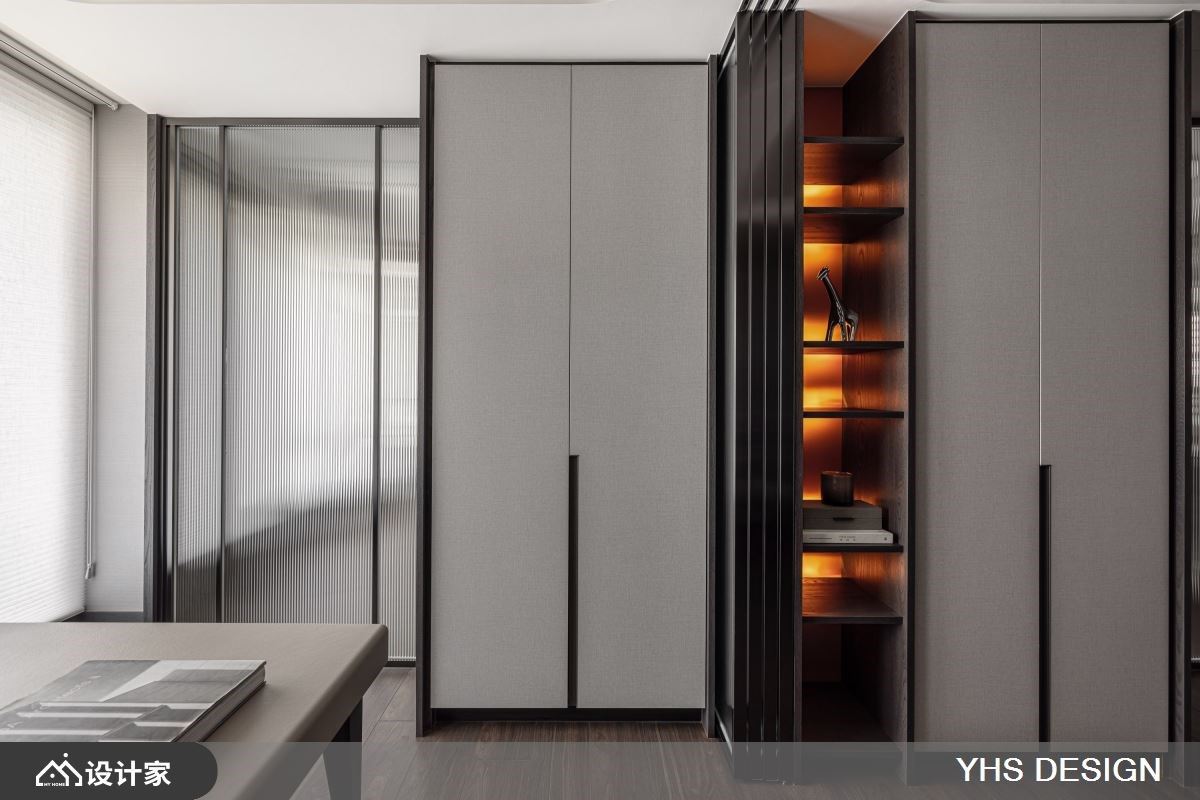 私领域位于沙发后方,透过拉门形塑高弹性的半开放式设计,增加空间的交流感,纹理丰富的壁纸点缀空间,在简约设计中增添内敛的层次,独立更衣间选用暖调更线与色彩建构,根据持有物品量身订制的柜体满足屋主收纳需求,若隐若现的黑玻门片消弭内容物存在感,同时兼具通透视觉。