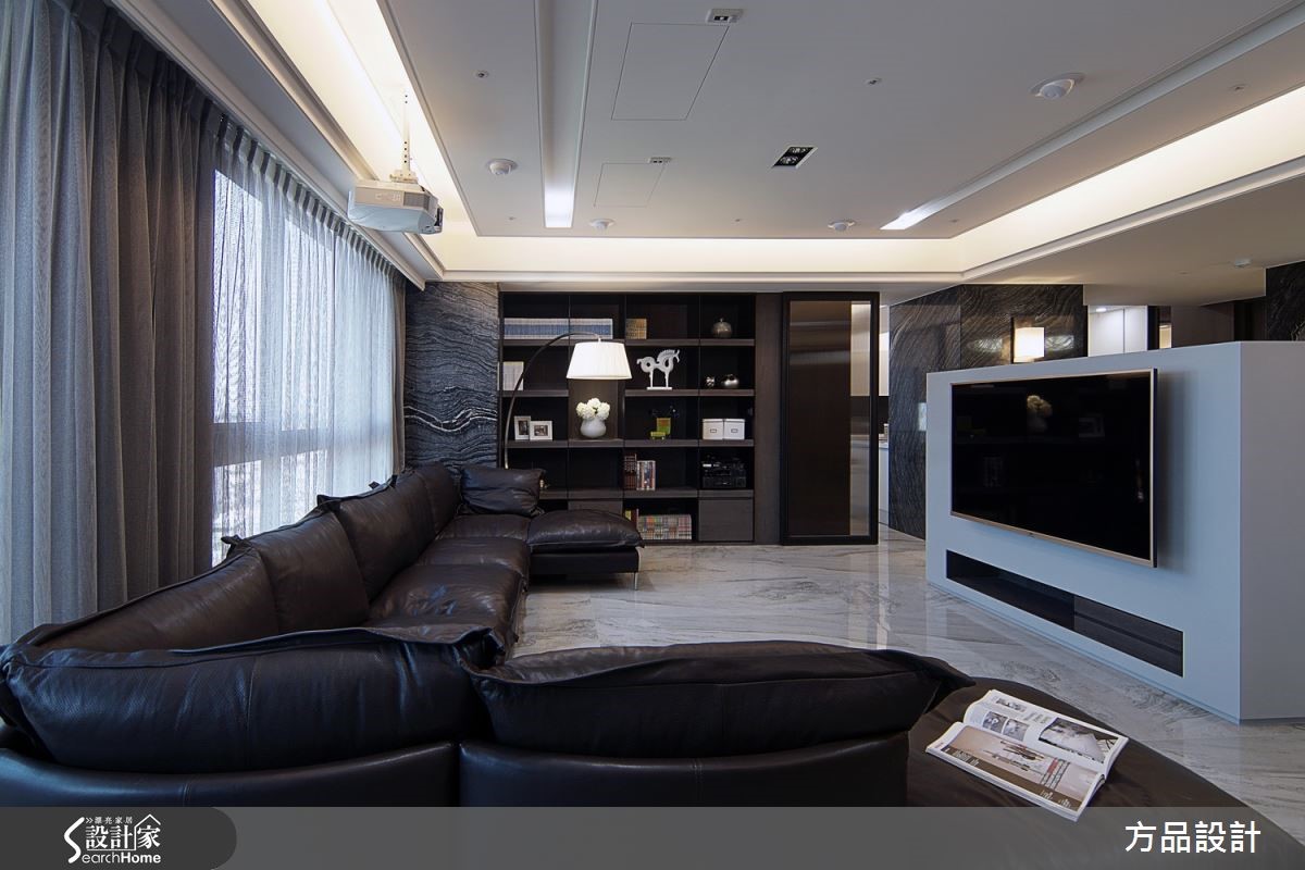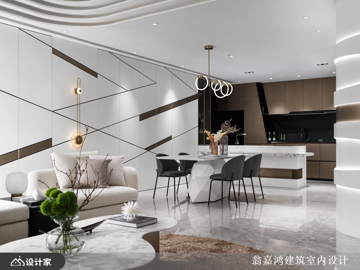 整体空间以简约元素铺陈,建构现代风利落的主轴,再透过线板、灯饰与石纹等元素点缀,利用层迭的手法丰富空间层次。