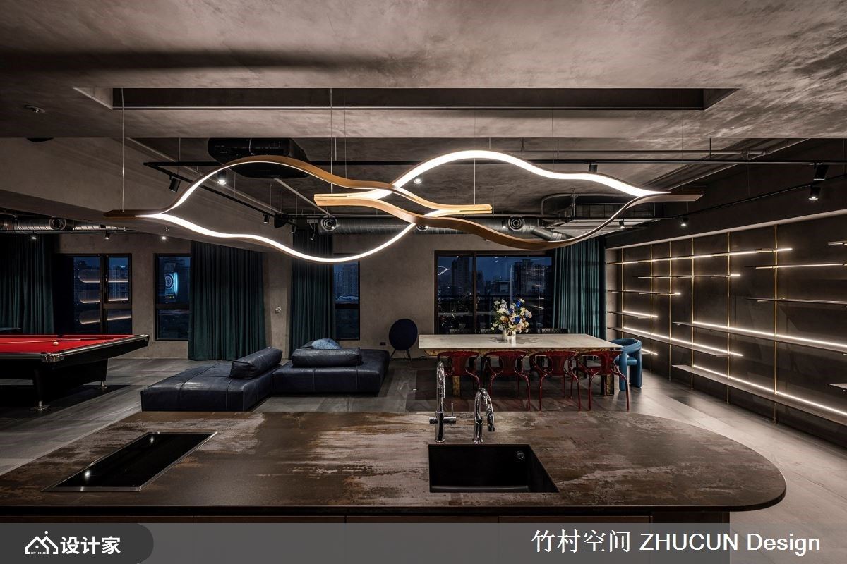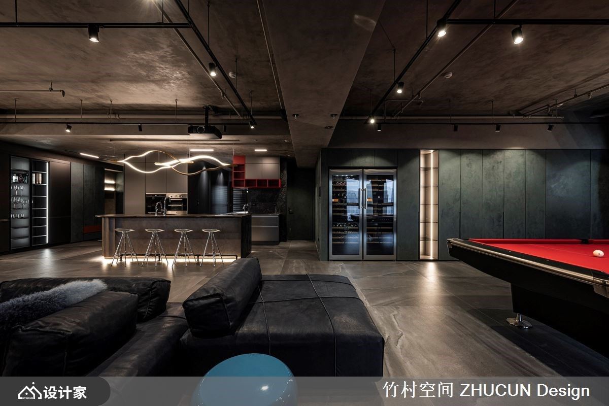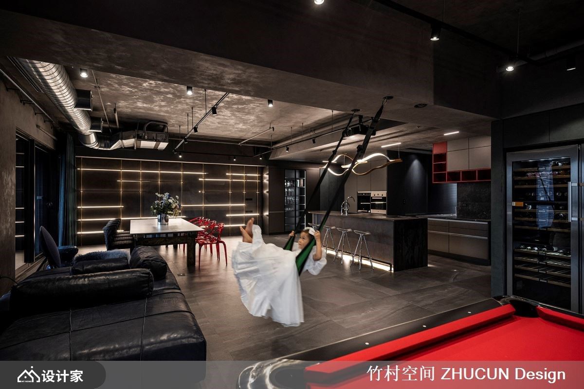 私人招待所是近年来的新兴趋势,不仅成为屋主招待亲友贵宾的场所,更能展现真诚态度及自身的时尚品味,本案位于高雄美术馆周遭的住宅大楼,为了临摹纽约中央公园旁LOFT阁楼的惬意与经典,竹村空间 ZHUCUN Design巧妙融合了现代风、工业风两种氛围,并将格局重新洗牌,塑造一所舒适大气的私人招待所。 由于私人招待所的机能与一般住宅迥然不同,设计师以敞开公共空间为主轴,同时纳入屋主期待的用餐区、小酌吧台、撞球桌及飞镖区等多元机能,让165平米空间尽显气派与舒适。入门玄关处以跳色六角砖划分落尘区,同时结合柜体造型及穿鞋椅,提供贵宾悠闲穿脱鞋履之处,并以爱马仕橘作为视觉亮点,打造入室后奢华细腻的第一印象,而矿物涂料漆面更在暖色光源的照映下,更显层次美感; 迈入公共空间,以活动式家具简单区分为:用餐区、小酌吧台区、休憩沙发区、撞球与飞镖等娱乐区,更由居宅原先的梁柱延伸出TRX,成就宽敞惬意的渡假氛围; 最后,空间色彩铺叙大面积的沈稳灰色调,暖色线性光源与刻意裸露的天花,让利落现代风与独特工业风达到最和谐的平衡点。