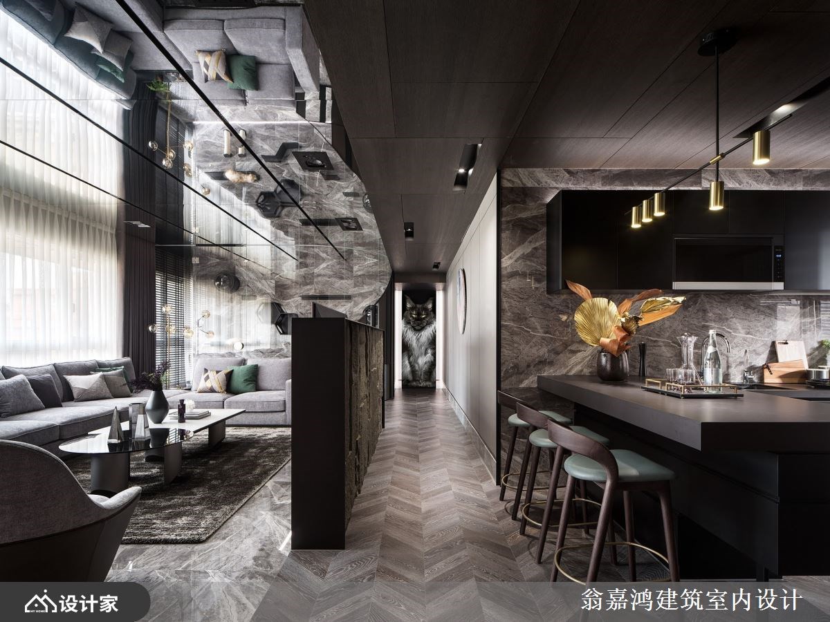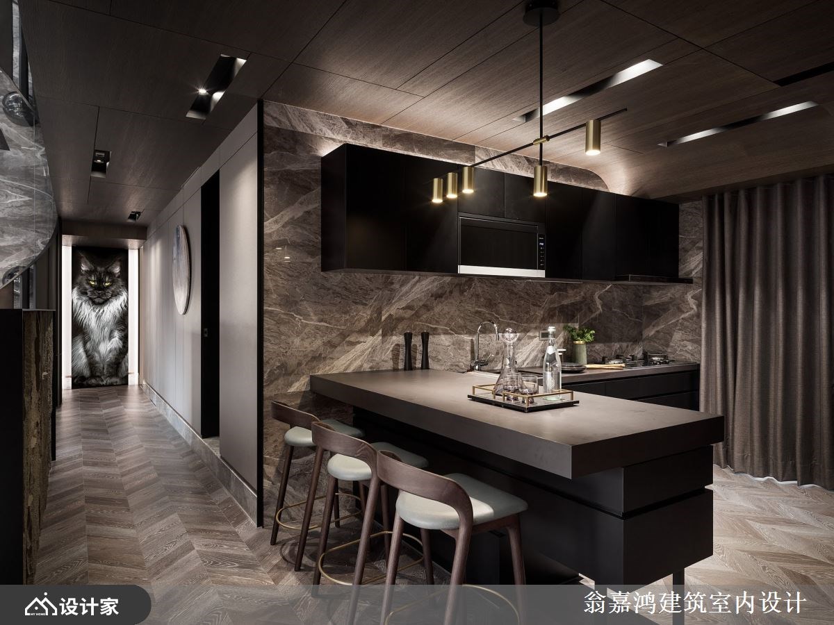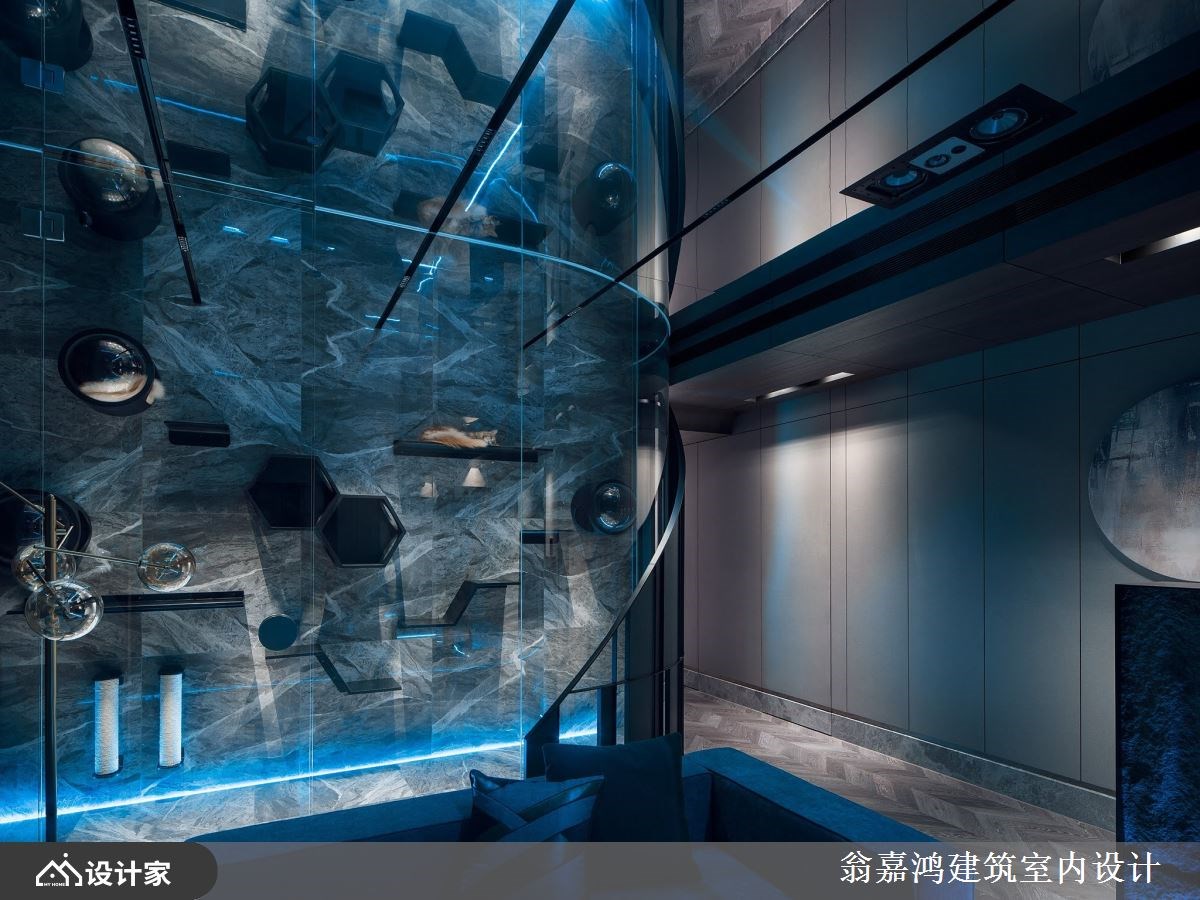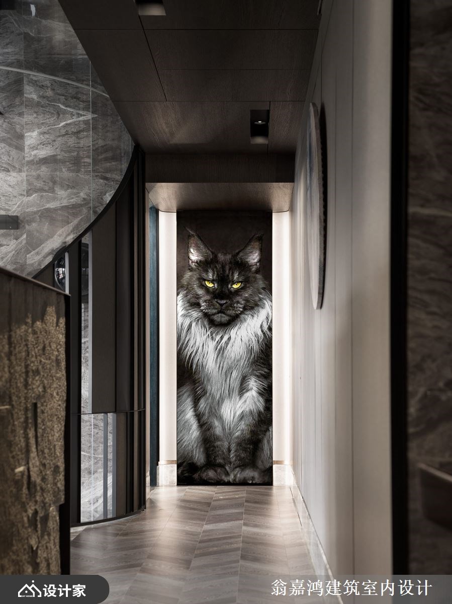 公领域采用大地色系为基调,挹注放松舒适的氛围,运用大理石、石材、镀钛金属、艺术涂料等层层堆栈出奢华大器的现代风华,半高石材电视墙围塑非凡气势,界定场域也创造回字型动线,天花镜面反射加乘屋高景深,创造挑高的豪宅气度,特别在长型客厅底端规划玻璃猫屋,客制化的圆弧玻璃区隔,墙面规划猫洞与猫跳台,满足猫咪的好奇需求,美观的弧形铁件栅栏亦具有实用功能,打开后让屋主可以限制狗狗在公领域活动,猫狗彼此不互相干扰,屋主在沙发上就能轻松看到宠物可爱的模样,轻松体验人宠共享生活,搭配LED多段色温灯带,营造变化丰富的居家风貌。厨房结合中岛创造L型的料理动线,用餐或饮酒小酌别具情调。廊道尽头挂上缅因猫画报,两侧灯光映衬,是屋内别致的端景。