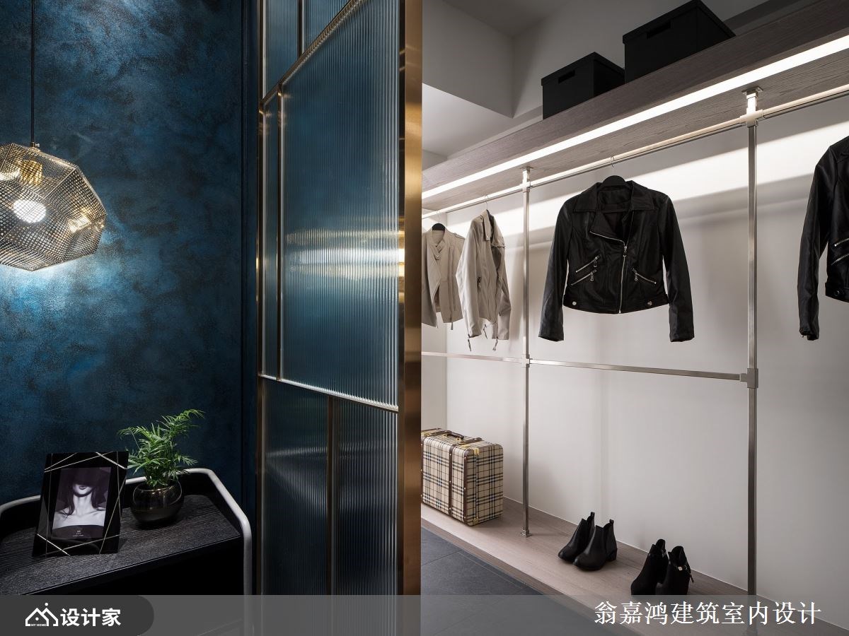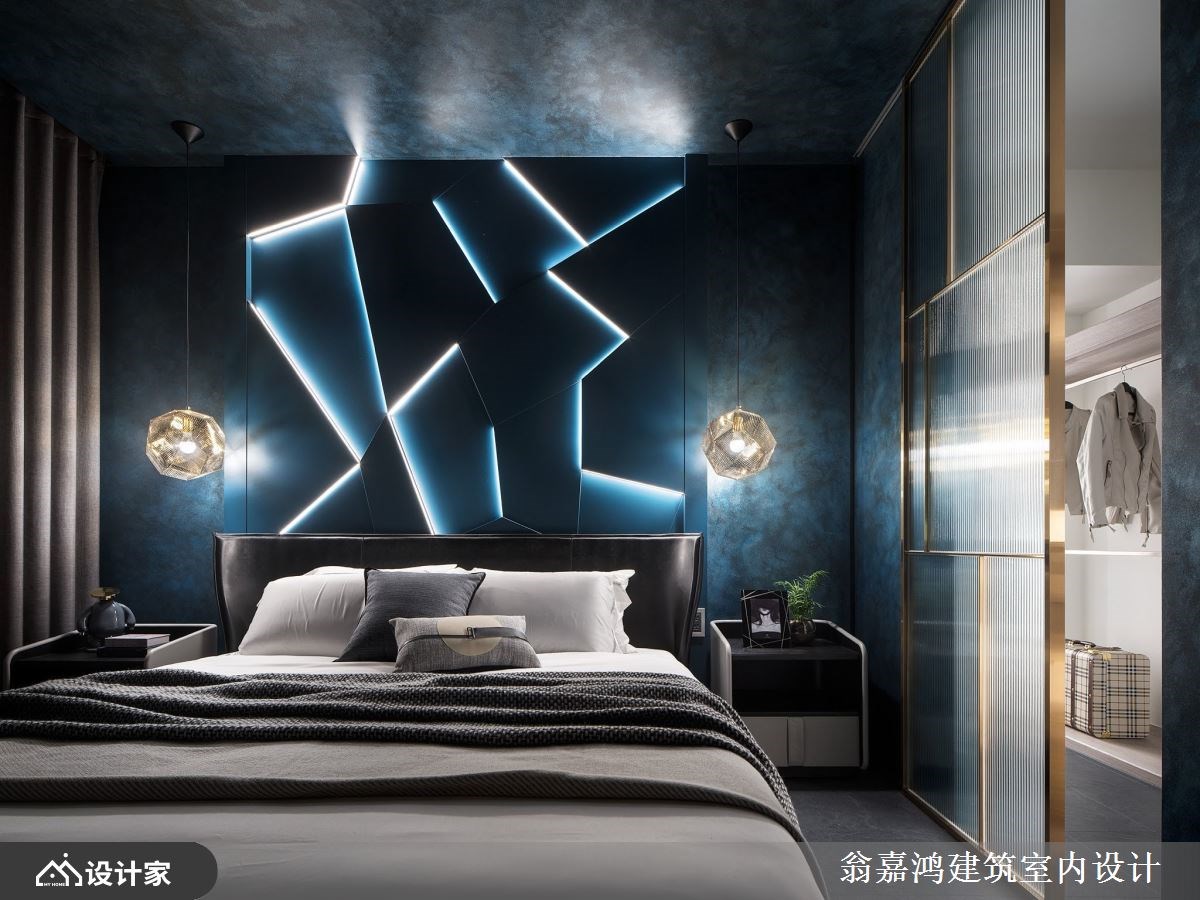 主卧墙面以蓝色调为基底,艺术涂料创造独特的纹理,搭佐光带与不规则的立体线性分割,塑造极具个性的视觉感受。独立更衣室规划开放式的双层展示架,高级精品质感不言可喻。浴室呈现透亮宽敞的舒适感,在窗边泡澡身心灵全面放松。