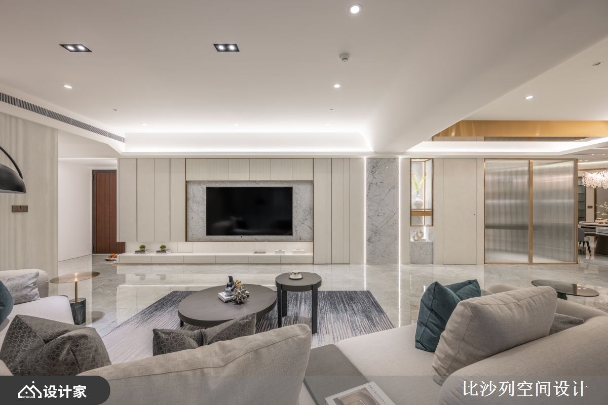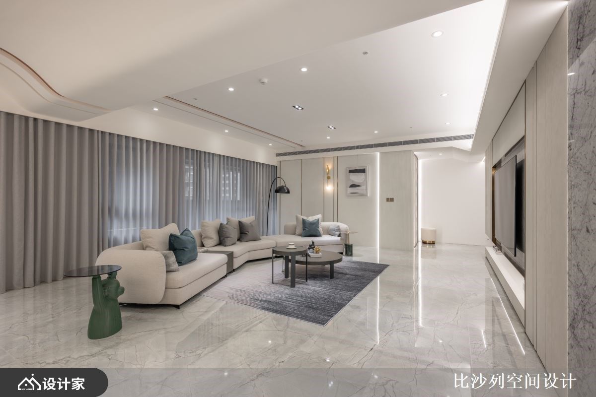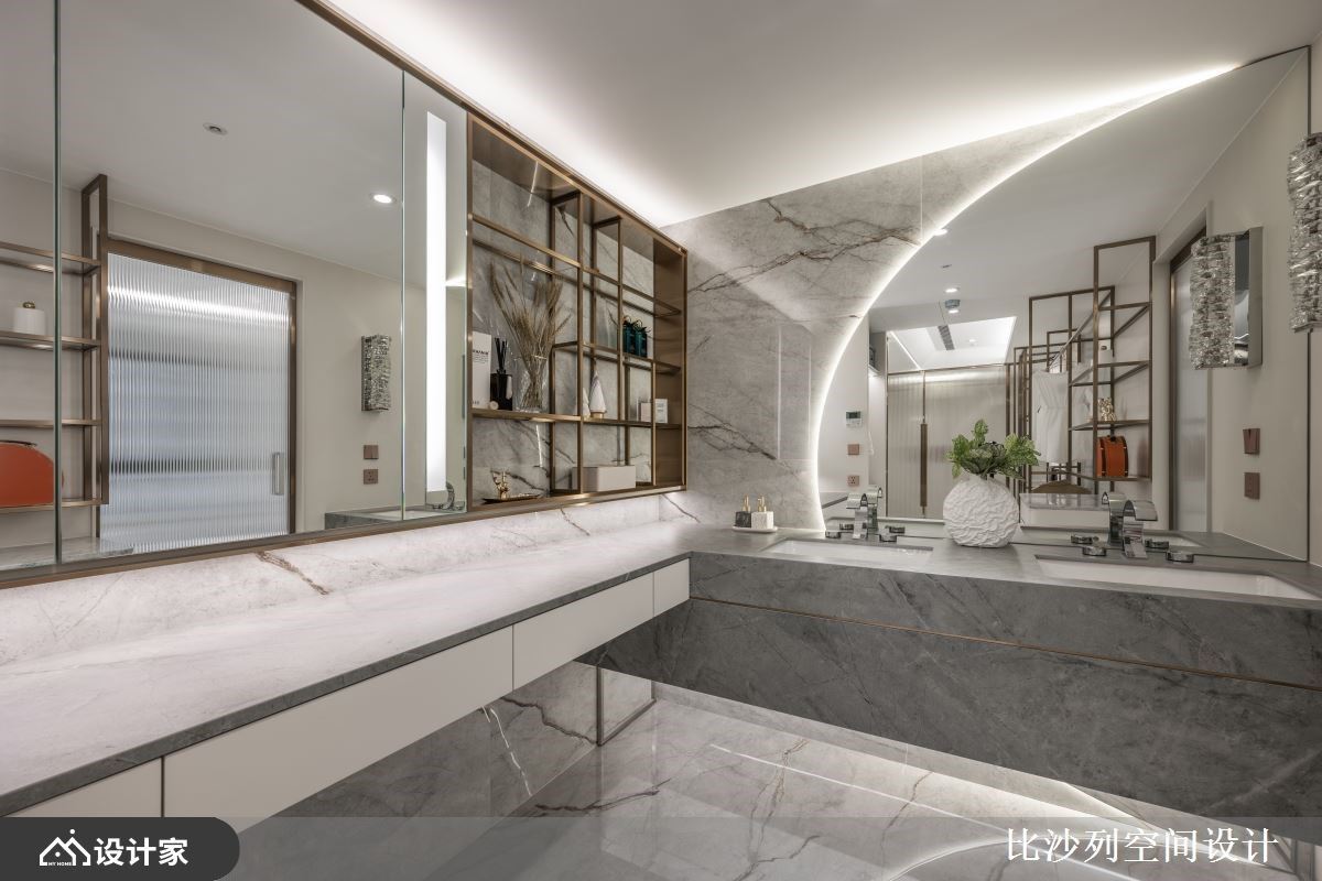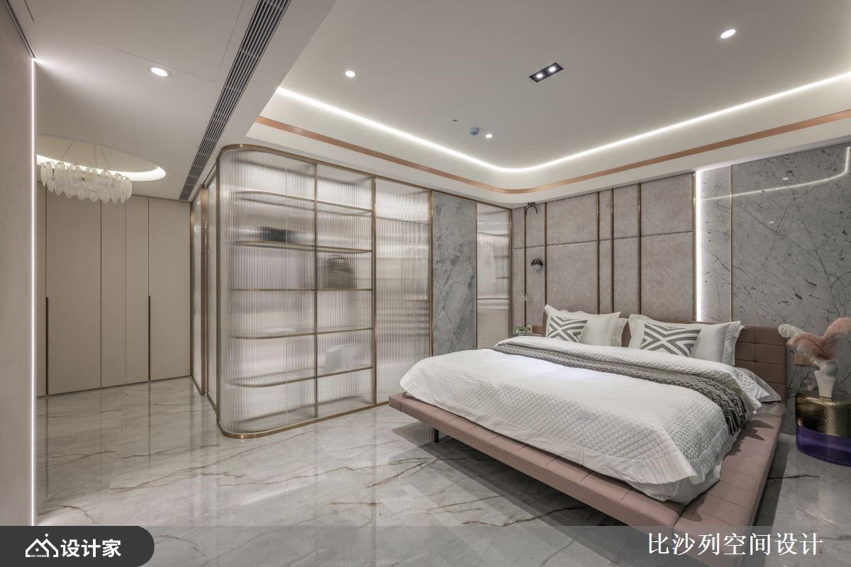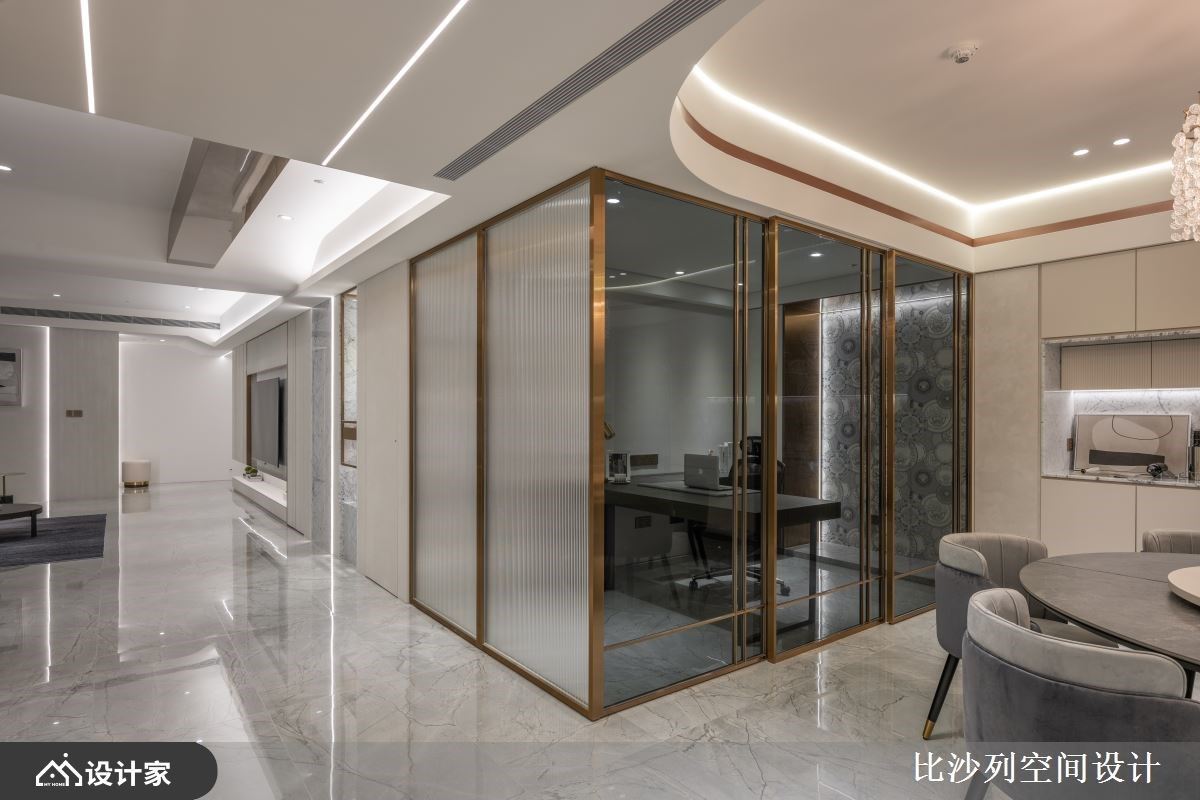 198平米平层用有二居室在设计概念上,融合了现代风中流行的设计元素,不仅能突显屋主的品味,也更彰显风格底蕴,整体空间以白色为基底,搭配大理石、镀钛、小冰柱玻璃,完成一处低调奢华、兼具时尚且高度自由的生活空间。 客厅区域突破电视墙既有的定位,保有完整的开窗面,让室内享有最开阔的采光,电视墙转向后整合公领域、弹性空间和行走动线等三条轴线,电视墙立面选用大理石和镀钛金属等异材质相搭,促使立面更显层次感。客厅和吧台相邻,使家人和来宾都可以在享受美食和饮料的同时增进情感,不用来回走动;而这个区域的装饰呼应整体空间的细节,以弧形吧台增加动线的流畅度,同时镀钛材料的运用则为整个空间增添了奢华感。 这空间的另外一个亮点,是用小冰柱玻璃与玻璃材质创造出的书房区域,以弹性隔间的做法,创造一个可以根据需求随时变化的生活空间,让居住者在不同的时刻和场合中根据需要进行调整,从而实现多样化的居住体验。 小编的最爱 卧室空间以安静简洁的方式规划,延续公领域的大理石与镀钛语汇,结合绷皮质材,增加精致与细节,利用小冰柱玻璃围塑的弧形更衣室,则是为居住者提供了一个方便的更衣空间,同时也增添了空间的摩登时髦感。