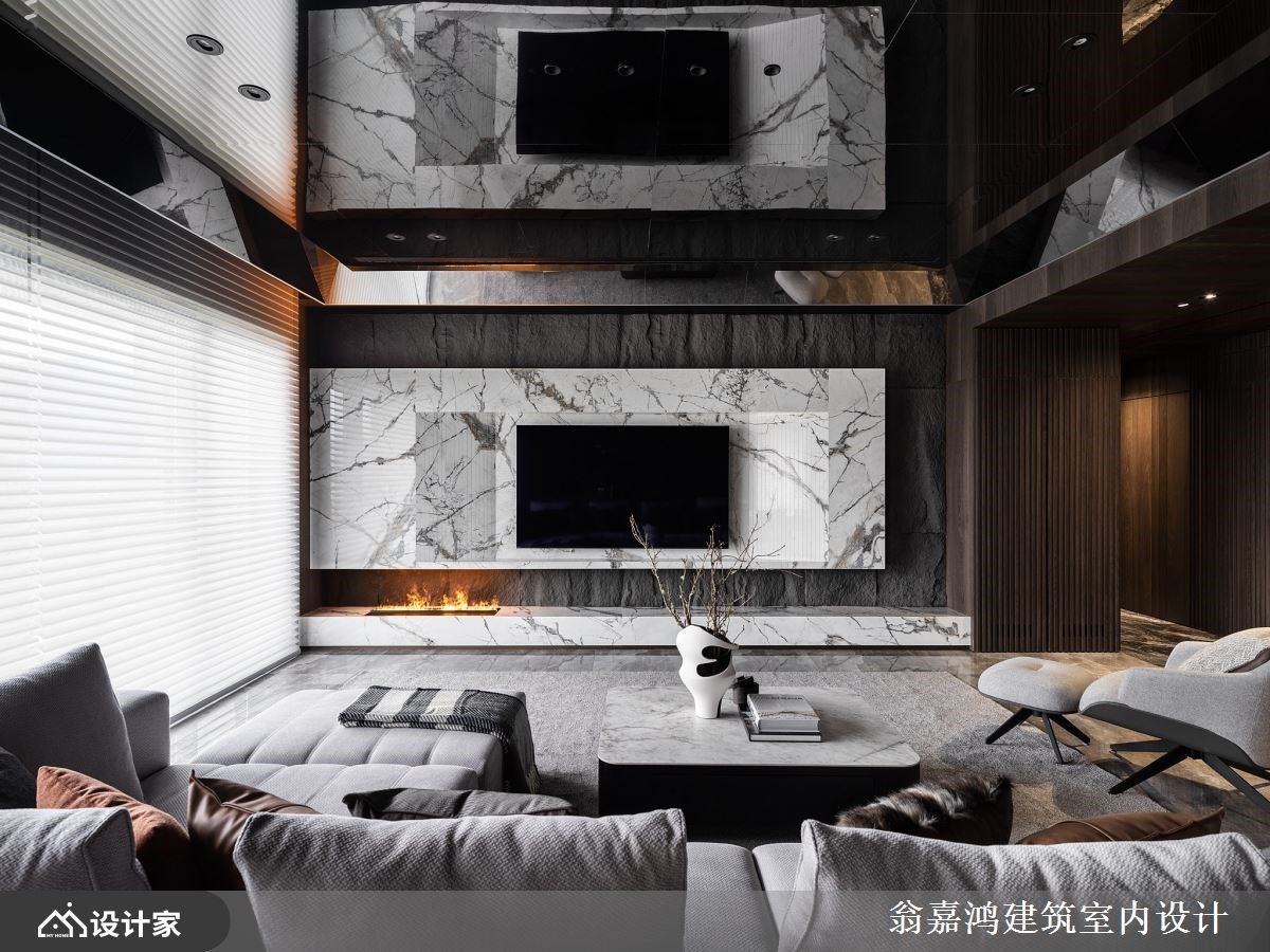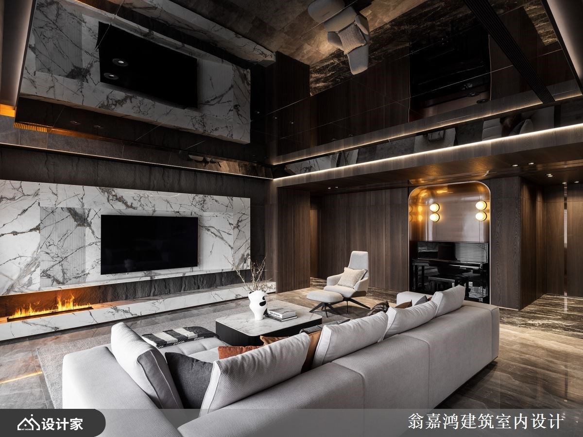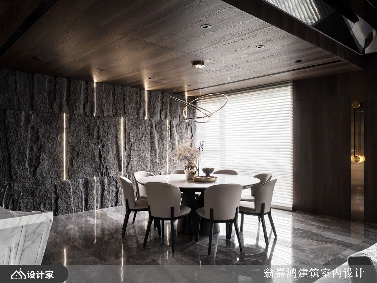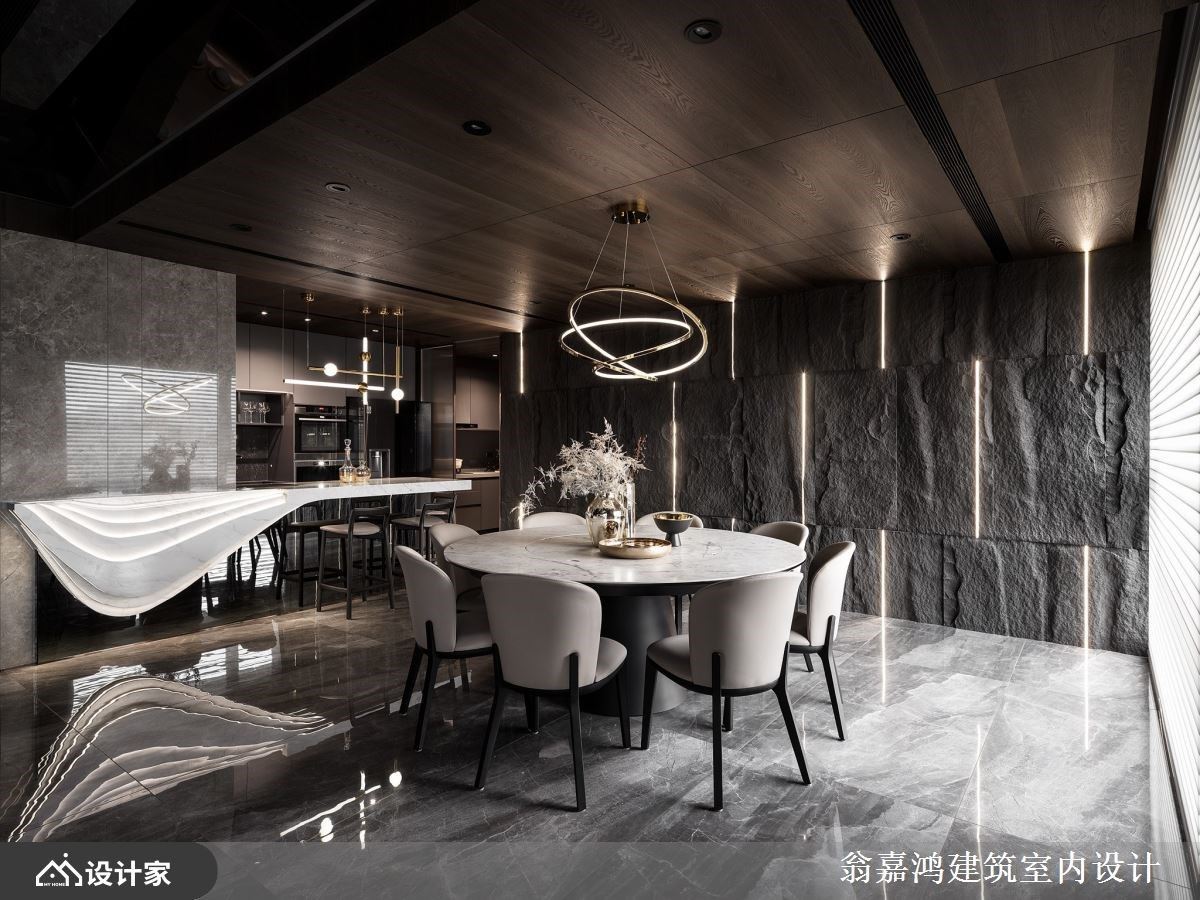 玄关设计层次丰富,一入室便可感受到居者独到的美学品味。宽敞的公领域选择以复合媒材拼接,并透过深色调和,打造异中求同的效果,犹如极致的视觉飨宴,走道木质天花具包覆性,而客厅镜面天花则将空间感拉高,再搭配上电视墙壁炉更是大器不凡。餐厅以圆桌为中心,隐喻团圆与交流,而后方石板墙以线灯勾边,粗犷中又带有细腻的质感,开放式厨房以中岛与墙体相接,而优美的有机曲线勾勒顺畅的过度,既是烹饪与轻食空间,更是演绎生活及艺术的美学场域。