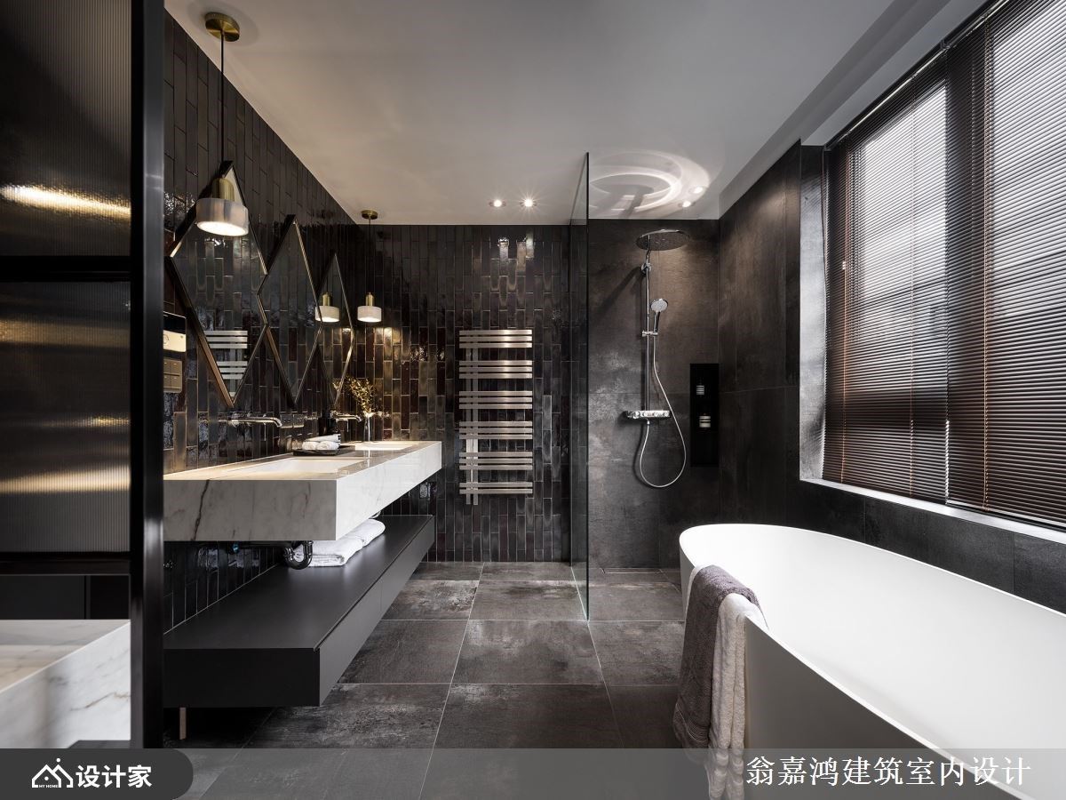卫浴空间以黑灰色为主调,再透过多元材质的拼接,挹注趣味性,宽敞的双洗手台将生活动线分流,生活仪式感满分。