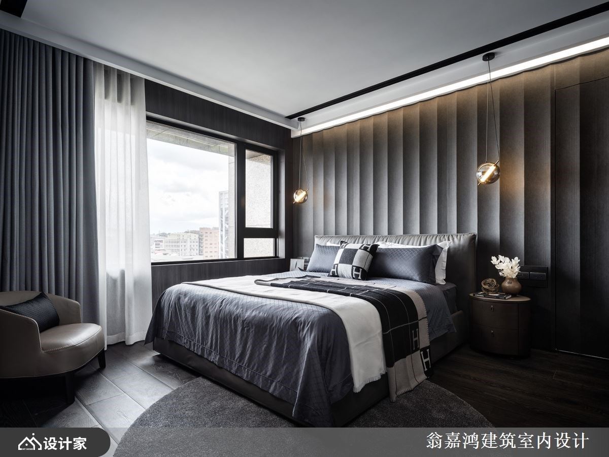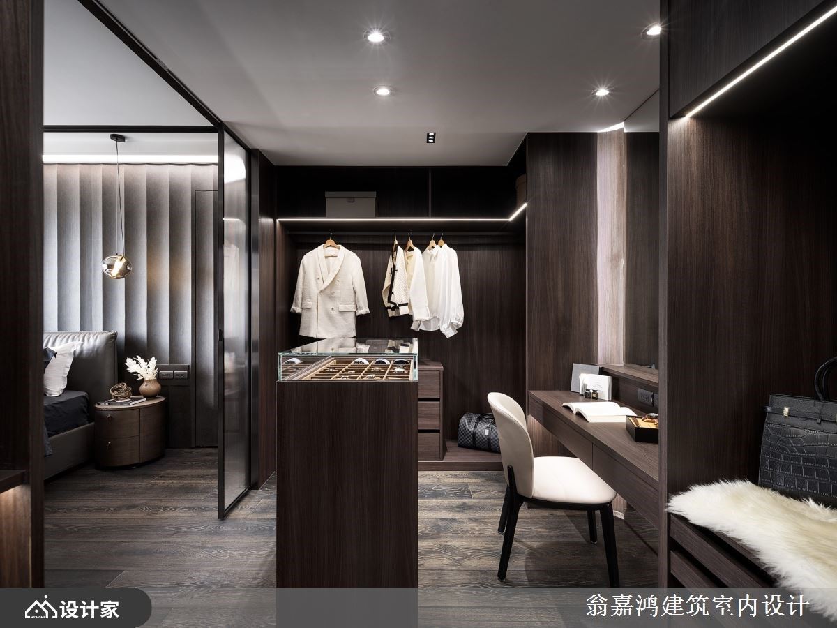 多功能空间为公领域进入主卧室的缓冲,既可确保隐私,又可满足品酒、影片鉴赏等休闲机能。主卧室以白色为天,深色为底建构沉稳又挑高的空间感,而在灯光配置上选择以间接光设计减少视觉刺激,整体氛围更内敛沉静。更衣间以长虹玻璃与铁件组成的拉门遮掩,内部空间以饰品柜为中心,并沿墙面规划衣柜与梳妆台,强大的机能与大器的设计犹如精品展间般奢华。