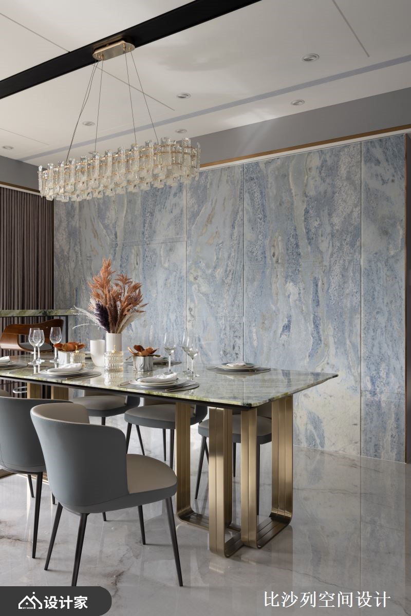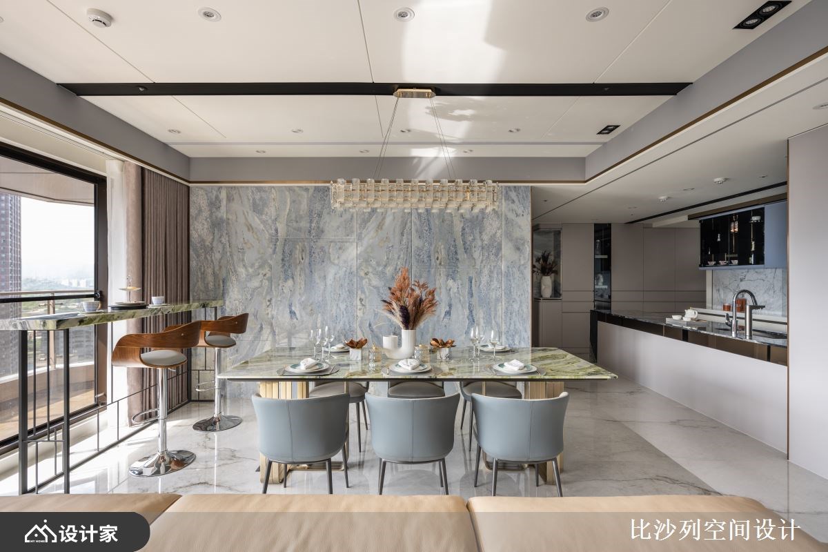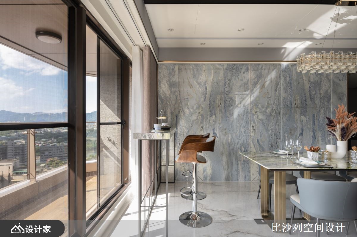甫进门踩踏在质地坚硬的花岗岩上,色泽纹理独特,尊荣感立即涌现,前方端景展示台则以透澈的白金琉璃烘托艺术品的精致细腻,大面柜体镶嵌镜面与镀钛金属,大器的迎宾系玄关令人惊艳。开放式公领域串联客厅、餐厅、吧台与厨房,无论在家中哪个角落,都能享受到大面落地窗外开阔的自然景观,浅色的公领域地坪与弧形天花板,让人自然而然的聚焦于窗外的视野,精心设计的天花板四周以金属边框勾勒,结合隐藏梁柱与机器设备的弧形天花,巧妙连结各空间。电视墙选用饱和度低的银彩石英石为背景,与保留色彩的餐厅背墙海洋之心石材相互辉映,尤以海洋之心采用不等距的切割方式保留色彩,加乘设计美感,在餐厅吊灯的映照下,犹如画作般的悠远意境,型塑居家端景墙。开放式厨房防溅板与餐厅背墙呼应,创造视觉延伸,中岛让料理台面使用更充裕,柜体结合艺术作品展示,围塑华美的备餐区。
