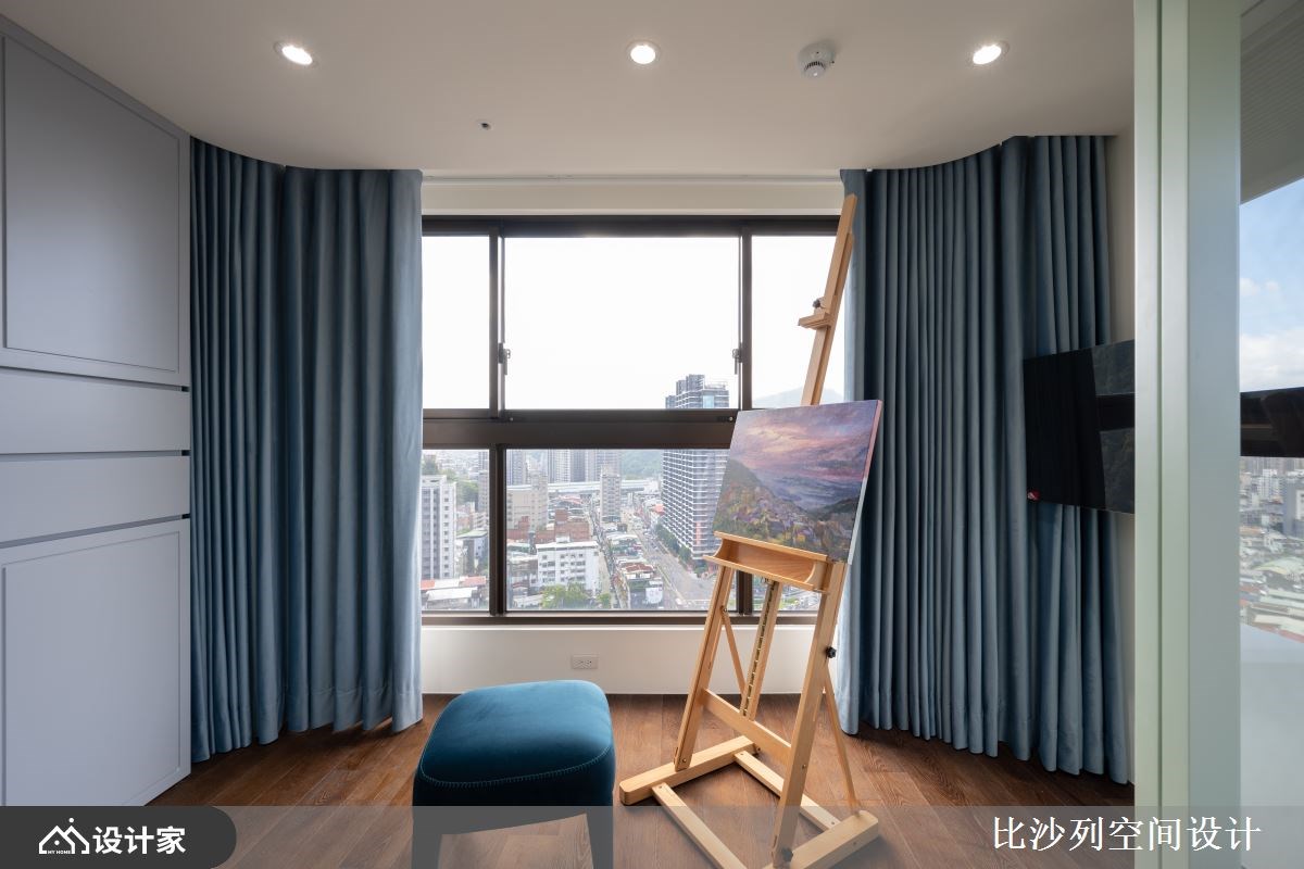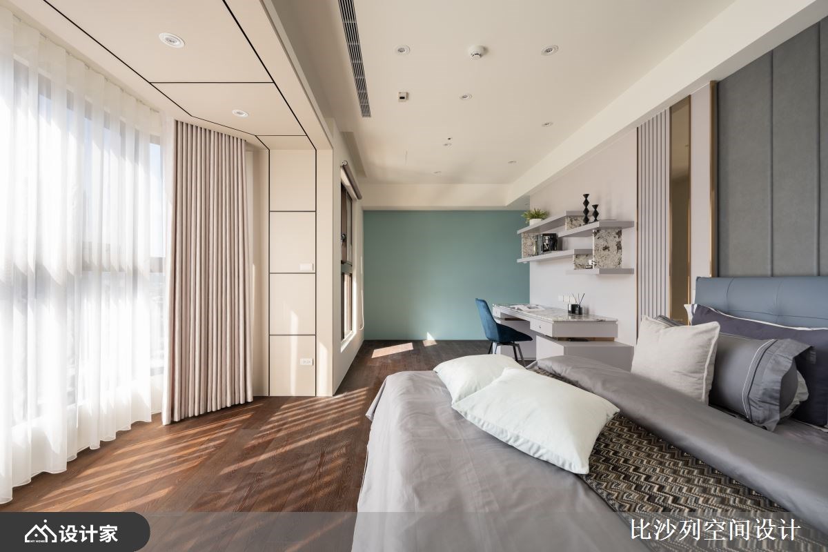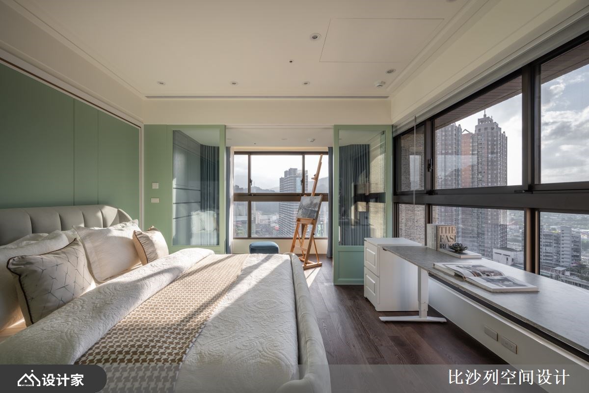女主卧以优雅的绿色为基调,衬托女主人高雅的气质,空间划分为更衣室、寝卧区及工作室,玻璃拉门界定场域视线不受阻碍,于工作画室的天花藏有负压设备,有助空气随时保持清新。男主卧书房结合运动器材收纳,传递洗炼的现代都会生活态度。