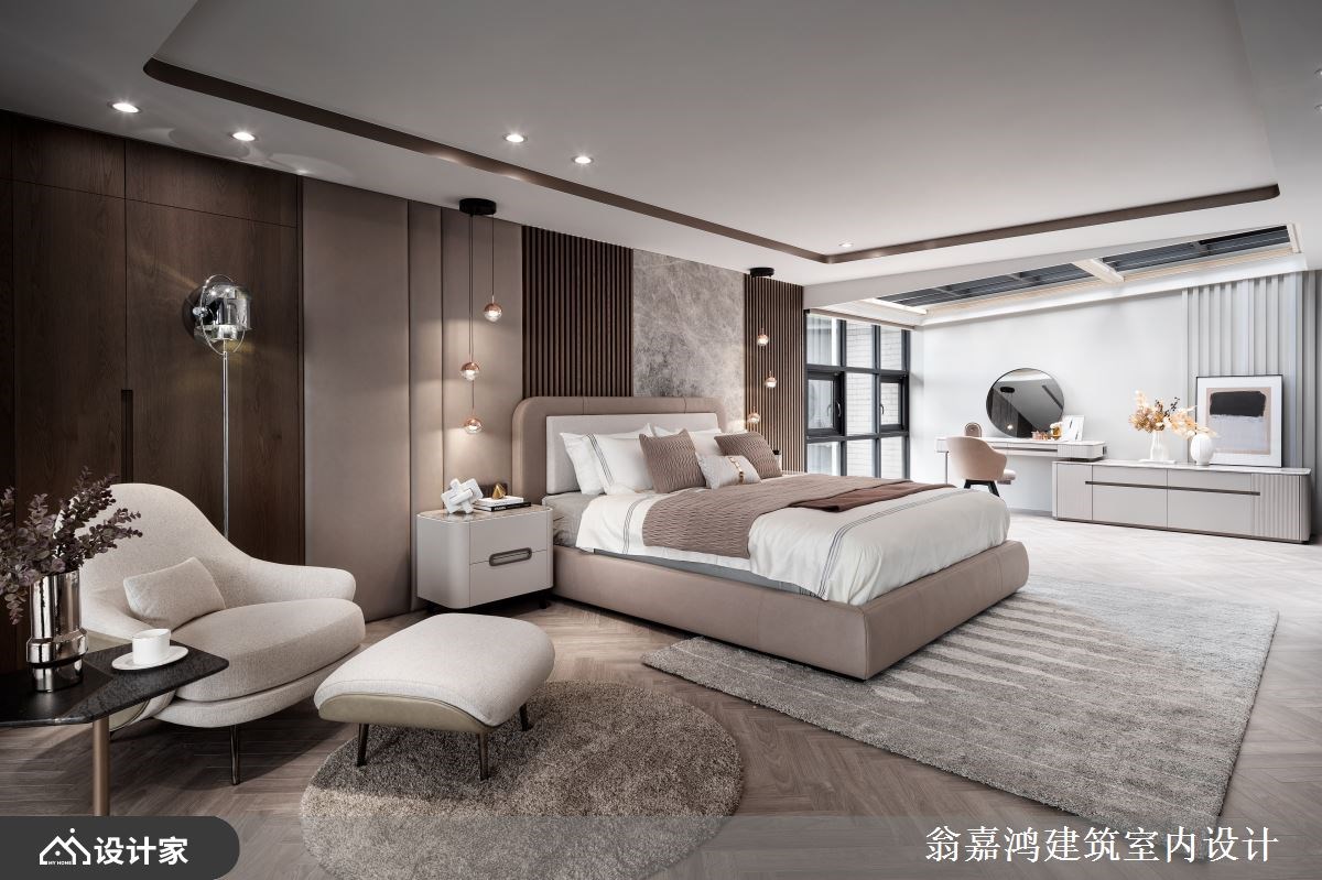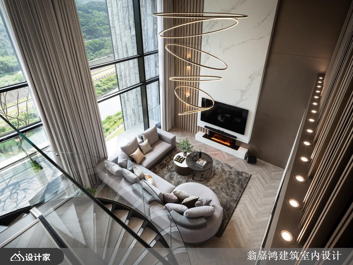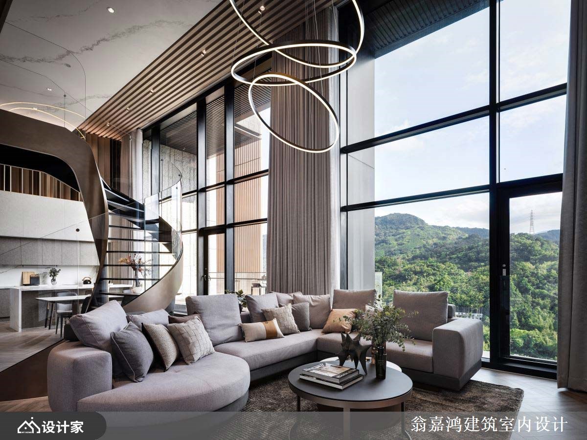 扭转百坪挑高豪宅以男性居住者为主的设计视角,这间 396 平米挑高楼中楼专为服务女性而生。由毛胚屋开始订制,客厅以人字纹木地板铺陈温润的地坪,天花板镀钛结合白色大理石设计营造豪宅风范;镀钛玻璃旋转阶梯宛如厅区的大型装置艺术,以柔美精致的姿态围塑出带有女性魅力的精品饭店风格。 镀钛旋转梯自然地创造开放式厅区的回字动线,客厅休憩区摆放大地色造型沙发与地毯,透过材质与色调给女性最温暖的呵护;而高耸电视墙则以镀钛和大理石延续饭店风精致格调,镶嵌电子壁炉将智能科技带入生活之中。客厅与玄关的分界以一座铁件与大理石订制的屏风展架,替休憩空间带来充足隐私性。订制的大中岛、齐备的厨店设备,以及能容纳六人以上的用餐长桌,迎着挑高落地窗景让落日豪宅里的梦想餐厨幻化成屋主日常。挑高复层豪宅坐拥大坪数露台厨了是户外瑜伽空间外,更打造吧台休憩区饱览自然景致,以及将女性最爱的SPA泡脚池融入豪宅设计中,将镀钛金属与大理石的阳刚以曲线方式呈现,感知复层豪宅大器中的温柔美学,让女性成为豪宅主角。 小编的最爱 沿着镀钛旋转楼梯通恿二楼私领域,以长型精品更衣间作为过渡空间,ㄇ字吊挂与矮柜搭配中岛柜设计打造女性梦想中的精品橱窗更衣室。主卧预留超宽敞坪数,色调延续公领域优雅的大地暖棕,寝具置中分流梳妆区与休憩区。梳妆区的玻璃帷幕由立面延伸至天花,打造天井引入优越采光;另一侧摆放主人椅与茶几营造刻意留白的休憩空间。床尾的卫浴以玻璃帷幕区隔,配置双洗手台并细腻划分淋浴区、便座与泡澡空间,从材质、色调、空间布局到机能规划上缜密的设计思维,颠覆传统思维体现呵护女性的女性设计主义。