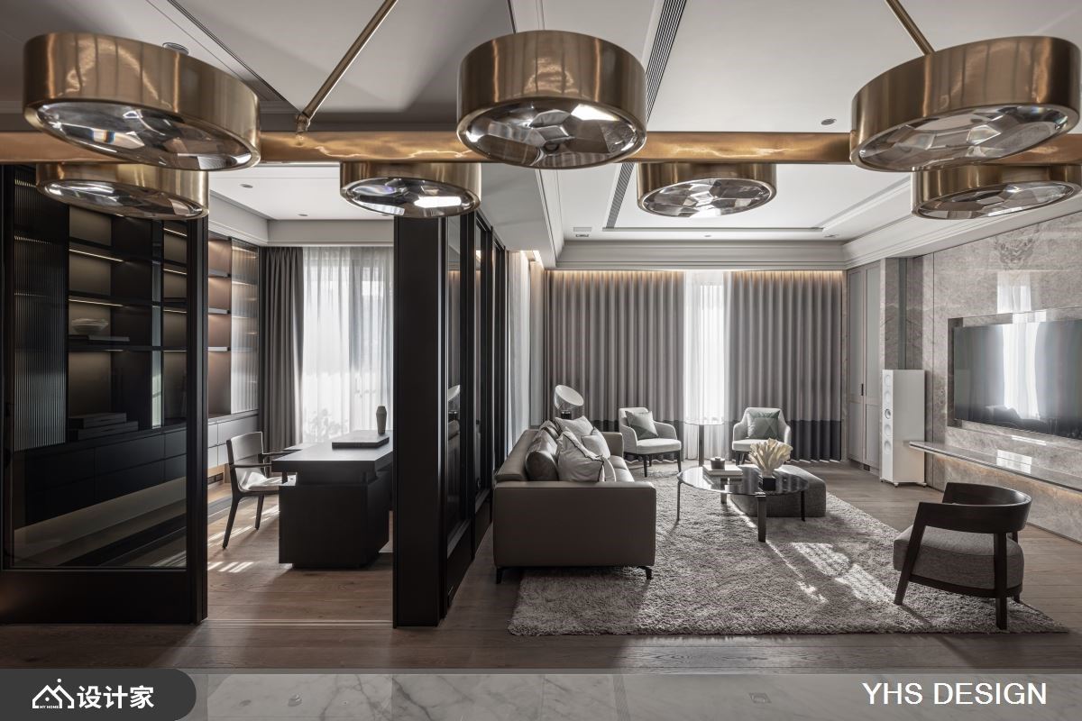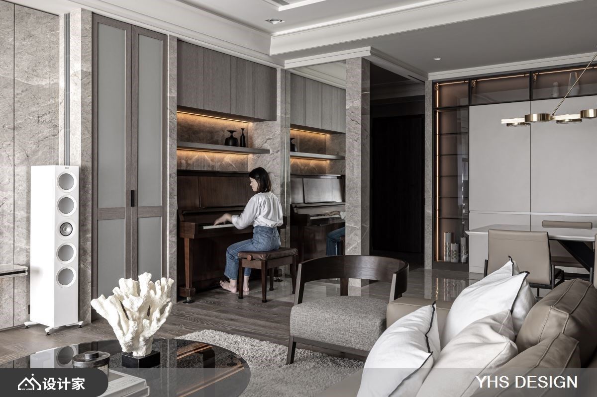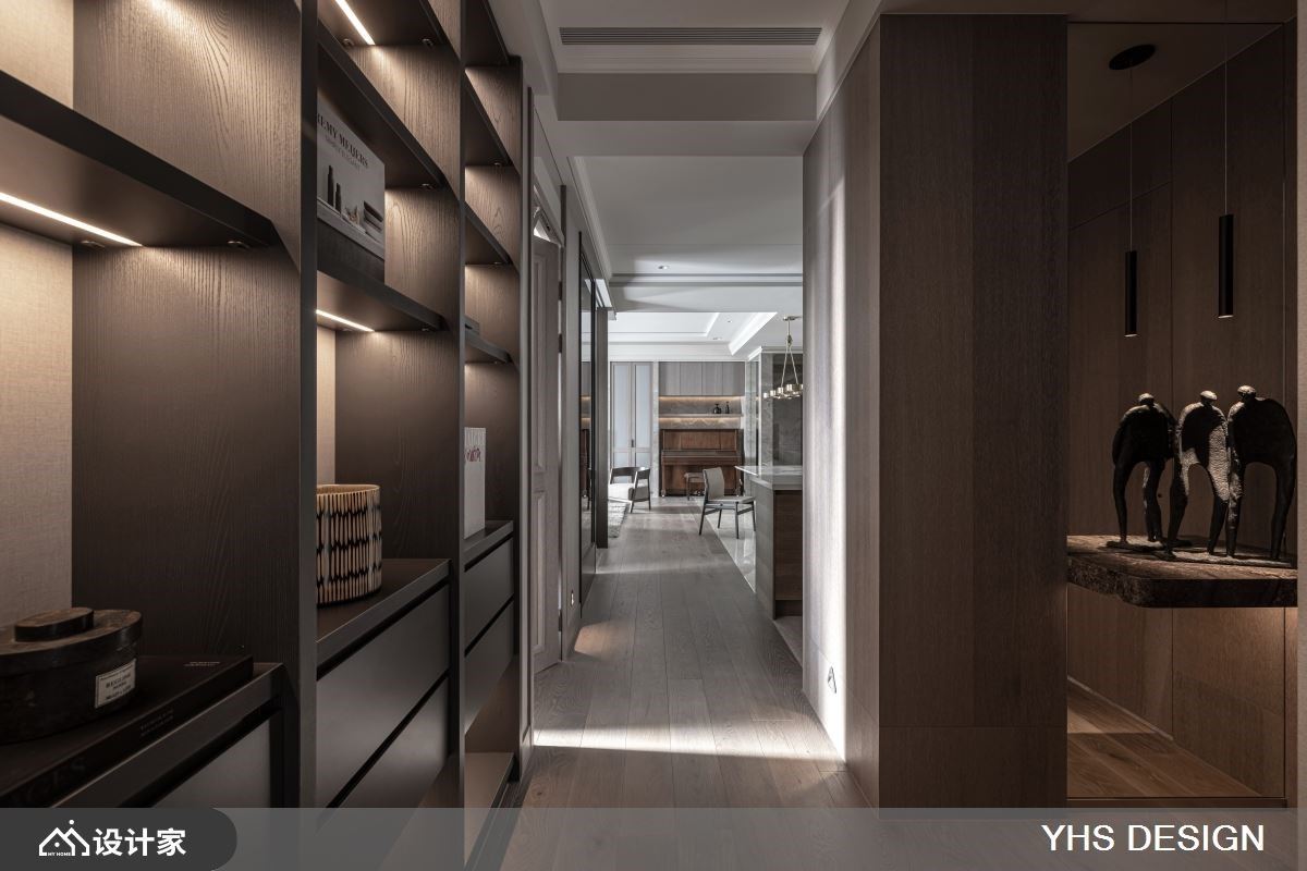 位处北市中心的200平米新成屋,不仅拥有便捷交通、邻近学区的地理优势,更拥揽都会景观及山峦绿意,居住成员为退休父母与儿子,此空间更是儿子送给妈妈的礼物,希望打造一个安全舒适的居住空间,同时能容纳下宴客聚会时的亲朋好友的欢聚空间,快跟着小编一起来看看,与时俱进的YHSDESIGN设计事业如何规划吧! 空间风格上选用女屋主锺爱的温婉内敛为调性,发挥质材最原始的面貌,透过细腻语彙传递居者一家的向心力;其次,格局规划以渐进式设计,导引居者由外部的公领域迈入居宅中心的私领域,入门玄关处以转折廊道消弭风水疑虑,端景牆更选用质感灰色大理石,奠定迎宾的沉稳气派感受,而石材也沿用至电视主牆,无形中昇华了场域间的对话,书房以黑玻及金属围塑静谧的阅读空间,更兼具视觉通透感,弹性拉门也保有未来生活的变动空间;最后,考量到一家三口皆有阅读及收藏艺术品的习惯,在廊道上规划展示层架,作为收藏品的最佳舞台,搭佐间接灯源打造宛如艺术迴廊的氛围。