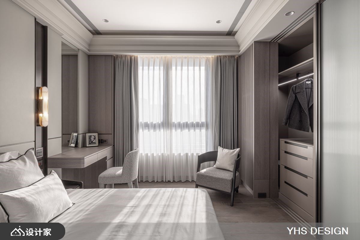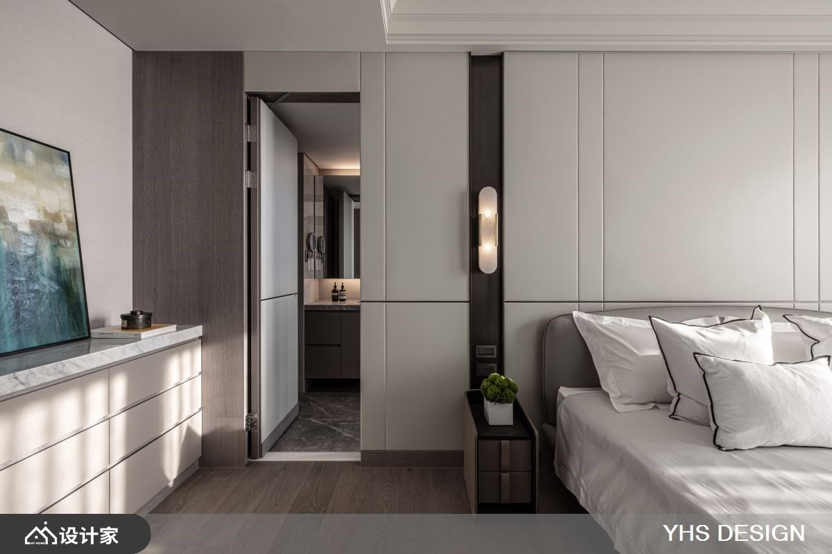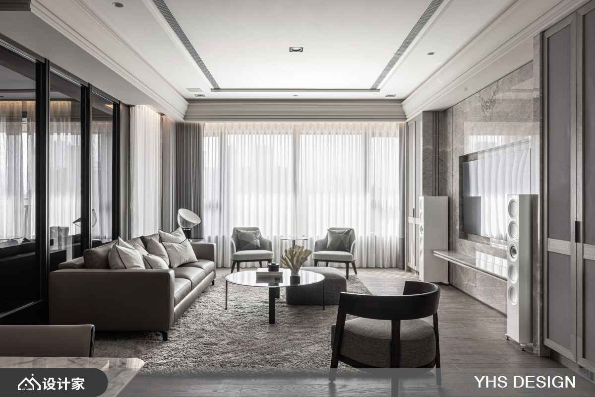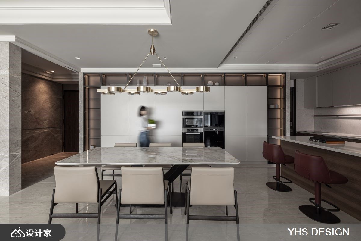 位处北市中心的200平米新成屋,不仅拥有便捷交通、邻近学区的地理优势,更拥揽都会景观及山峦绿意,居住成员为退休父母与儿子,此空间更是儿子送给妈妈的礼物,希望打造一个安全舒适的居住空间,同时能容纳下宴客聚会时的亲朋好友的欢聚空间,快跟着小编一起来看看,与时俱进的YHSDESIGN设计事业如何规划吧! 空间风格上选用女屋主锺爱的温婉内敛为调性,发挥质材最原始的面貌,透过细腻语彙传递居者一家的向心力;其次,格局规划以渐进式设计,导引居者由外部的公领域迈入居宅中心的私领域,入门玄关处以转折廊道消弭风水疑虑,端景牆更选用质感灰色大理石,奠定迎宾的沉稳气派感受,而石材也沿用至电视主牆,无形中昇华了场域间的对话,书房以黑玻及金属围塑静谧的阅读空间,更兼具视觉通透感,弹性拉门也保有未来生活的变动空间;最后,考量到一家三口皆有阅读及收藏艺术品的习惯,在廊道上规划展示层架,作为收藏品的最佳舞台,搭佐间接灯源打造宛如艺术迴廊的氛围。