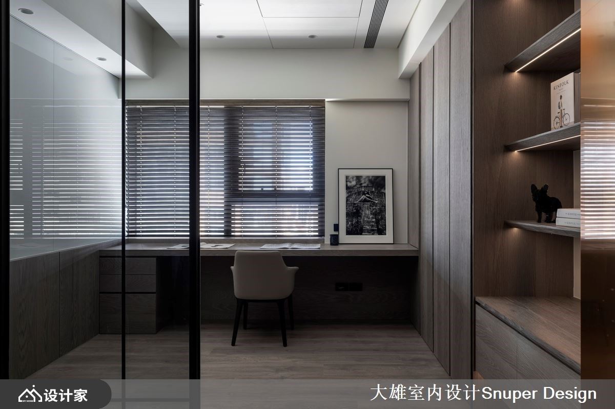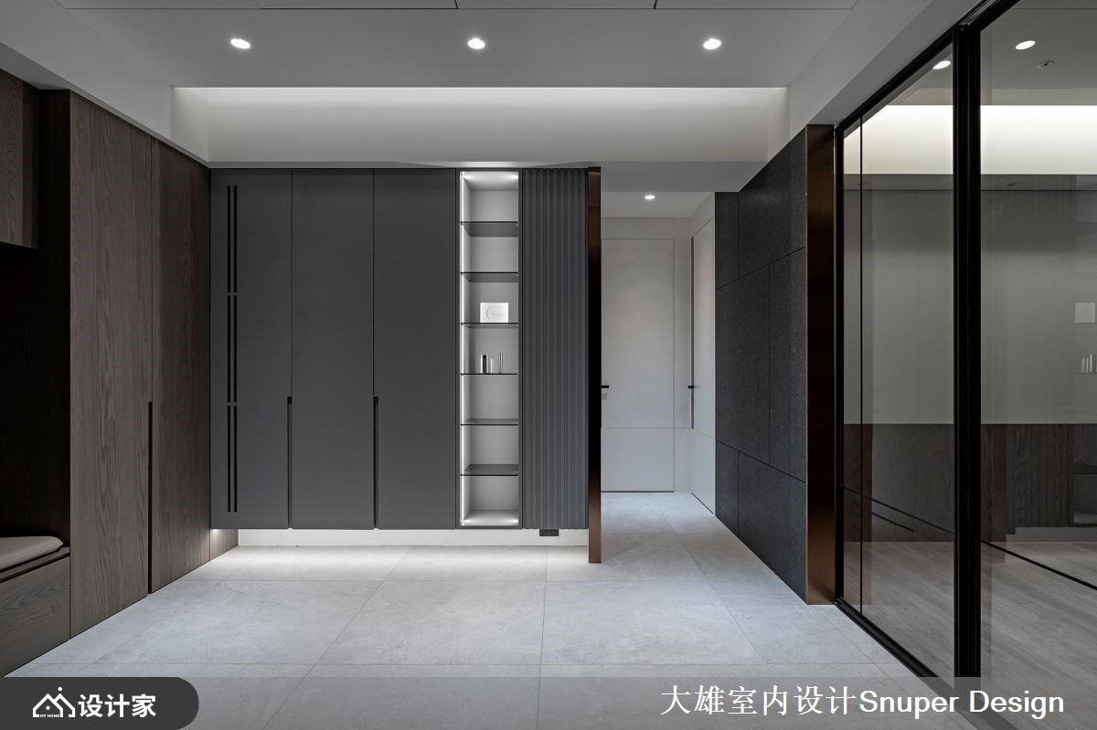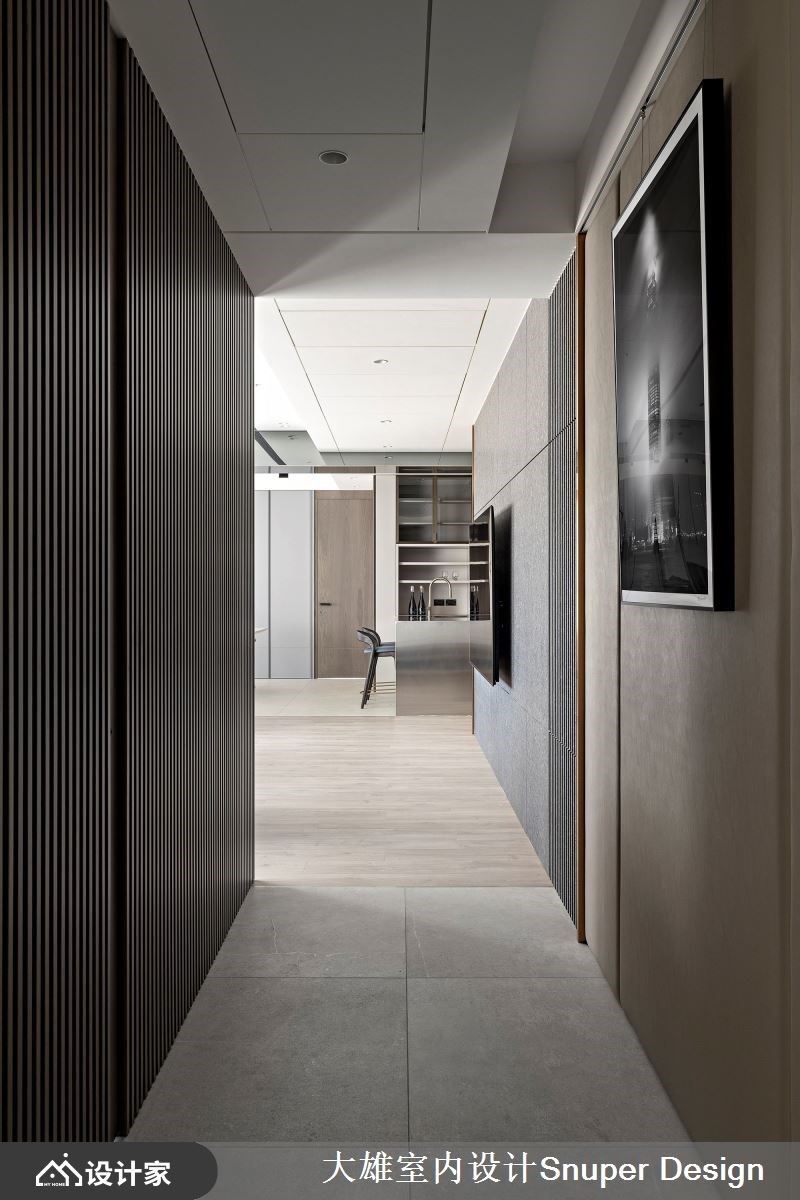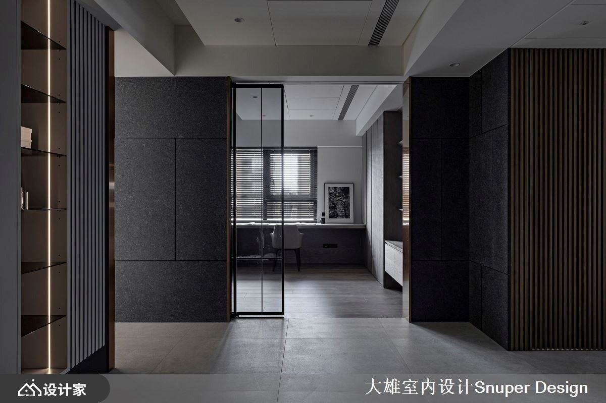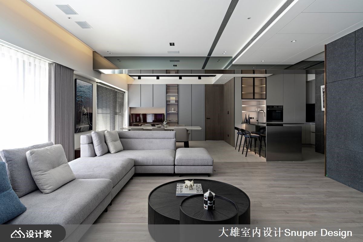位处城市中心的172平米新成屋,坐拥高楼景观及充沛採光,大雄室内设计Snuper Design 林政纬设计师,巧用异材质的拼接互动堆叠丰富的美学层次,同时透过空间轴线的相互串联及对话,步步刻画生活痕迹,打造都会城市内的品味现代居所。 迈入居室,以灰蓝色及木质调为基调,描摹都会时尚的场域氛围,入门处以穿透式隔间巧妙串联玄关及静谧书房,沿着廊道走向公领域,牆面上以摄影作品作为视觉亮点,公领域以开放式设计为主轴,藉由动线规划、家具配置,形塑穿透且开阔的视觉飨宴,沙发侧边的理性蓝调收纳展示柜,更内嵌暖色光源,将生活美学遍佈每一隅,餐厨空间设置大型中岛,兼顾休憩吧台及延伸烹饪檯面的机能,更化身餐厅、厨房两处的衔接媒介。 最后为了化解原先居宅大樑横亘的压迫感,大雄室内设计擅长铺贴镜面材质,将劣势扭转为优势,不仅明确客厅及餐厅的场域分野,更在无形中延伸了开阔感。