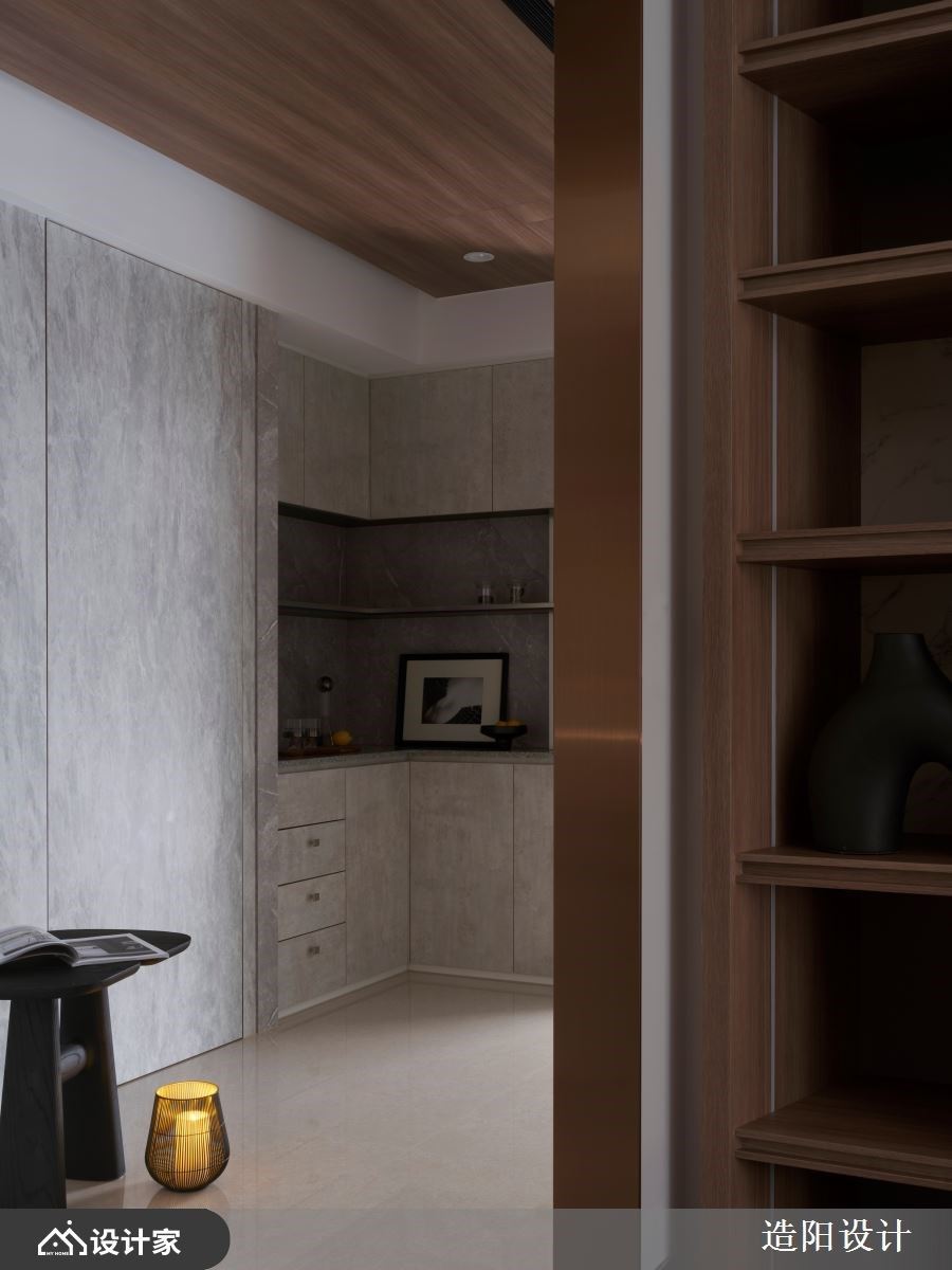 入门玄关处以挑高天花造型,辅以几何光带勾勒,画出时尚现代的场域界线,旁侧黑镜拉门后,蕴藏充沛的收纳机能,也映照出加倍放大的空间感。延续玄关屏风的石材语汇,电视主墙以横向延展浅灰大理石,创造气势十足的大宅印象,并运用内嵌造型,将镀钛展示架沿墙铺设,随手摆上屋主的精心搜藏,便体现出不凡的艺术品味。同时,不管是在柜体内部、上方,都以间接照明手法,彰显质材本身的奢华质感,也弱化量体本身的沉重视觉。餐厅场域维持精致却简约的风格,将收纳机能整合于同一平面,透过不同质材的巧妙相遇,让寻常立面化身美型端景。长型大理石餐桌上,选用设计感十足的镀金吊灯,更为用餐时光提升仪式感。