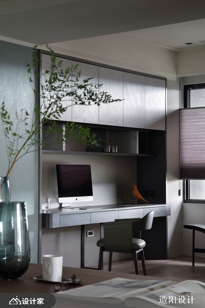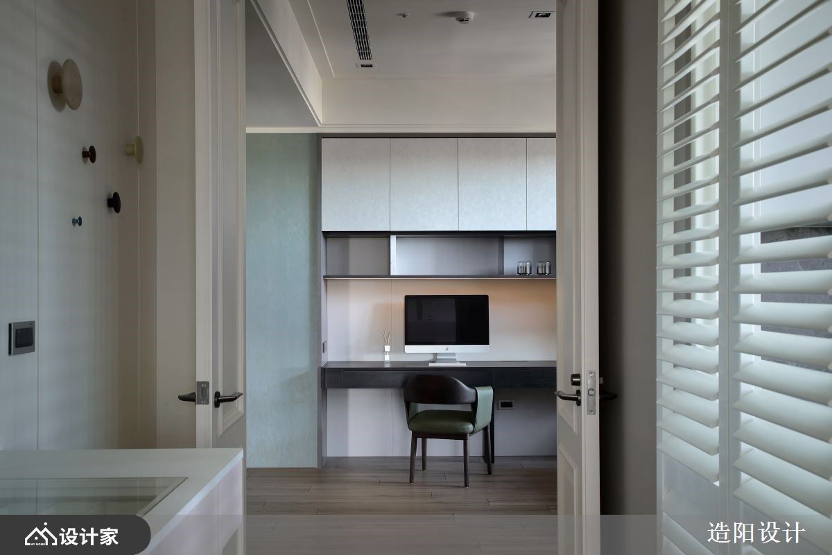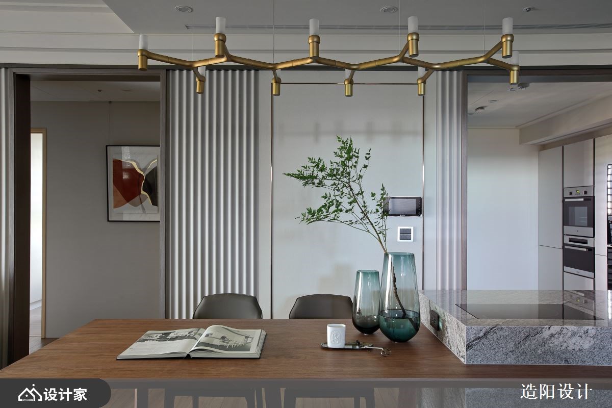 「执子之手,与子偕」象征着两人相互扶持,一同面对世间冷暖的感情写照,临近退休的屋主希望打造一个梦想中的「家」作为礼物赠予相守半辈子的妻子,将坚忍的情感烙印在居家空间中,待人生的后半场拉起序幕,一同携手面对未来种种。 宽敞的公领域以减法设计为主轴,舍去过多的装饰,将空间适度留白,搭配大面落地窗景,引景入室,勾勒出沉静恬淡的氛围,通透的空间感,让夫妻二人更容易留意对方状况,安全性大大提升。白色大理石电视墙以自然纹理将视觉集中,提升视听效果,一旁深色木质柜体大小错落,让屋主多年藏品被妥善展示。客厅家具、柜体选用弧形导角设计,消弥锐利棱角,避免长辈碰撞的危险。沙发背墙以多元材质拼接而成,视觉层次丰富。木质地坪一路延伸至书房,将空间串连,宽敞的书柜跨越两堵墙体,提供居者展示毕生成就与荣耀的空间,大面书桌设于采光处,利用优势营造舒适的工作空间,中央留白空地还可作为日常运动做瑜伽的多功能空间,许给夫妻二人能恣意发展兴趣爱好的多功能场域。 居室室选用木百叶与花卉墙纸勾勒优雅调性,过筛后的光线可随需求调整,使用上更加便利,考虑到退休后的需求,选择将床铺两侧过道加宽,为生活增添弹性。 小编的最爱 身为地质学系教授的屋主亲自为中岛吧台挑选一块名为「白蒙卡」的石材,利用两侧自然形成的鲤鱼纹路,象征夫妻感情犹如鲤鱼般永不分离,为居家空间增添耐人寻味的故事性。