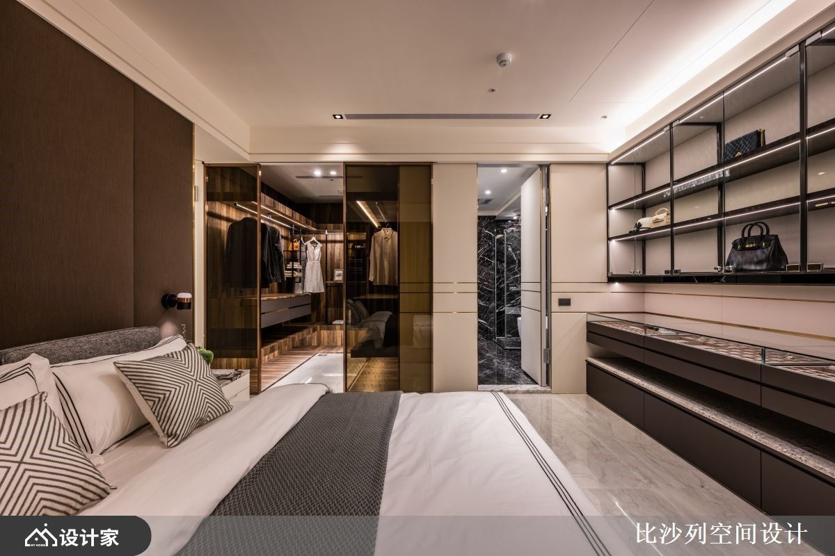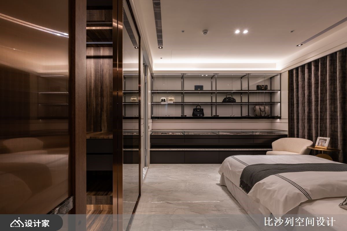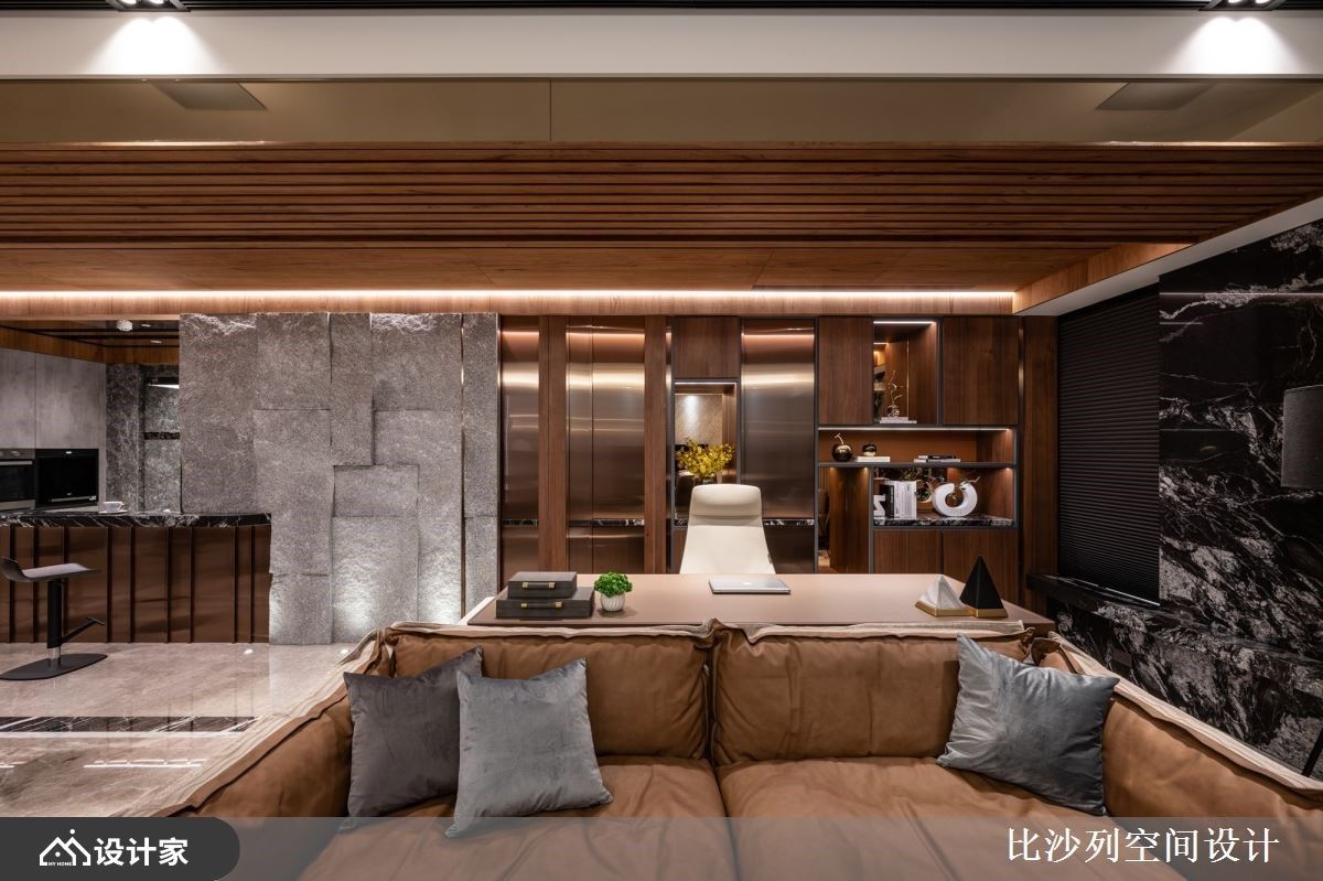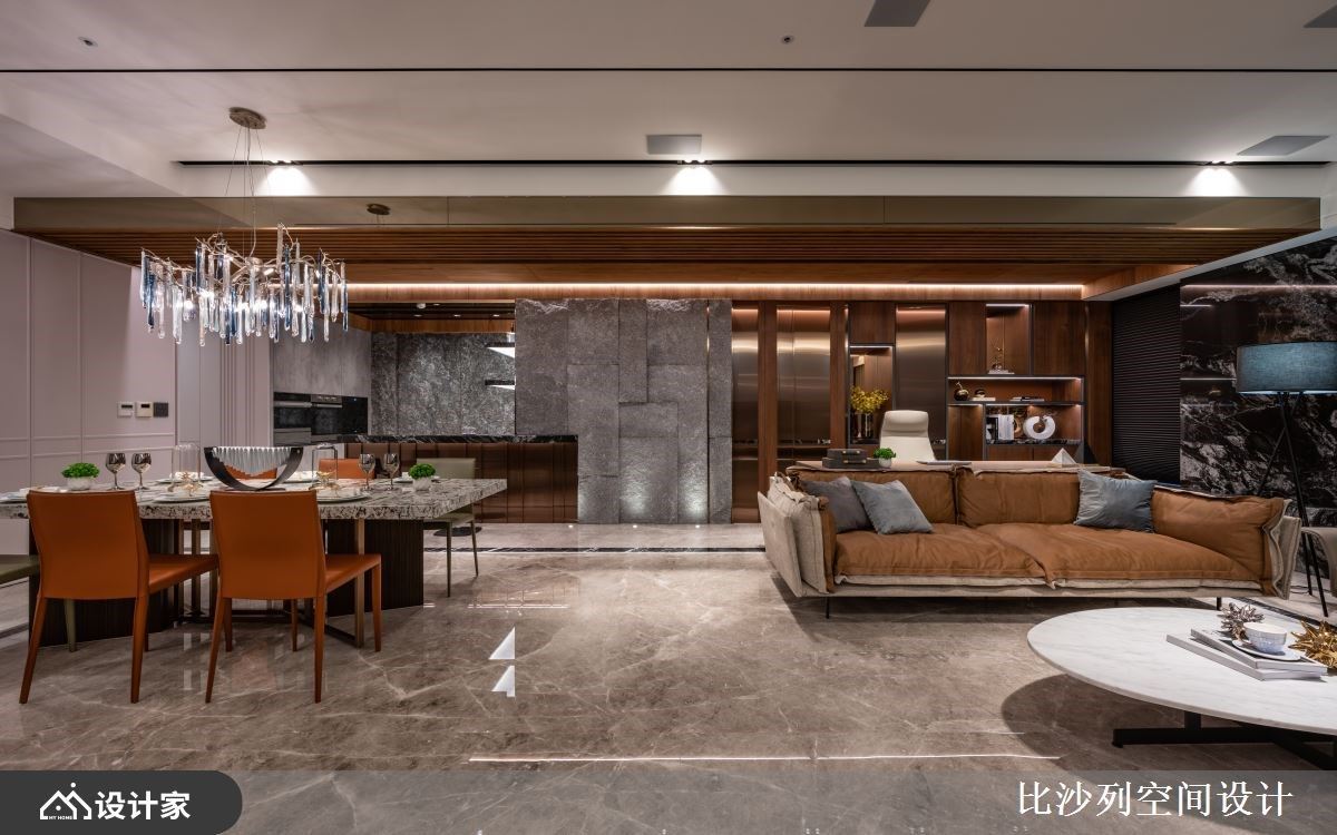165平米的毛胚屋有3居室1厅,将生活场域与休憩场域分区,生活场域开放紧邻,为人与人、人与物之间创造触手可及的密切尺度,而休憩场域则独具居住者的特质,融收藏、生活仪式感于其中,制作型于上的奢华,让家更有品味。 整体空间以发挥建材本色,通过设计的精湛编排,让木质、大理石、花岗岩、金属的质感表述低奢现代风的魅力。公领域中,客厅、餐厅与书房连贯,横向轴线的拓展使空间更为开阔,从进门处以繁复的花岗岩作为起始,接下来则为开放、封闭兼具的展示和收纳柜体跃动,延伸而下则为平整的大理石作为电视墙,以建材和设计手法缜密交织而开展的立面层次,成为空间中的视觉焦点。转向后,粗犷大块的岩石成为不经意的聚焦处,镶嵌入钛金饰条与光源,洗出大自然赋予的状况魅力,同时不失精致质感;而沙发后方紧邻开方式书房,运用镀钛金属与木皮创造独特而有魅力的立面,其中规划有进入主卧室的隐藏门扇,各种丰富的隐藏细节,更是家蓬荜生辉的关键。 小编的最爱 主卧室以地毯铺叙地面,宛如入住五星饭店的奢华感,订制一字型的精品展示柜,及机能丰富的更衣室,让居住者进入主卧空间,便能看到自己的精品收藏,营造个人特质及让身心灵一起满足!