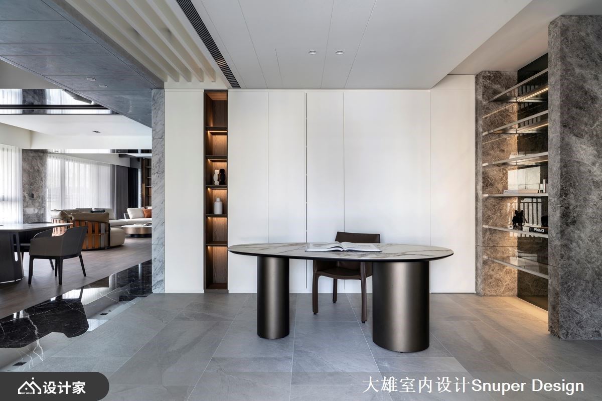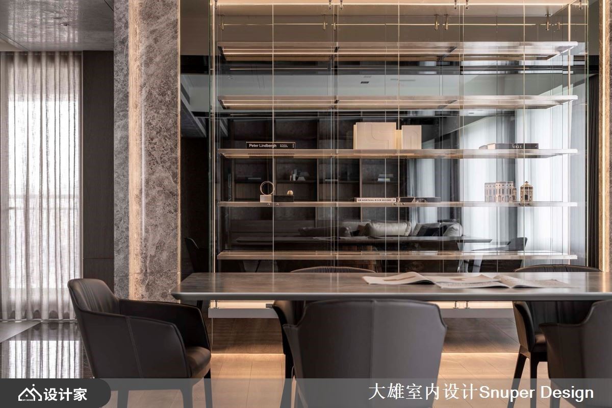 坐拥河岸第一排壮丽景观的264平米中古屋,大雄室内设计 林政纬设计师掌握绝佳的视野条件及开阔景致,空间配比上将公领域极大化,并引入四季更迭及窗景绿意,化身全家人天然的居家景深,感受无所不在的生活之美! 迈入公领域,以开放式设计为主轴,获取更加辽阔的视觉飨宴,同时善用居宅原先的梁柱延伸,及石纹与木质地坪的衔接转换,细细阐述着优雅的轴线尺度,更导引着居者的行走轨迹;餐厅后方设置大面展示空间,作为屋主丰富的书籍收藏的最佳舞台,更细细叙说居宅的独特魅力之处,其次,餐厨空间以深色系擘划,与浅色系的休憩客厅相比,隐喻着场域间的转换及衔接,同时透过卡拉拉白大理石、水磨石、灰镜等丰富元素,佐以镀钛金属线条,描绘鲜明的空间表情更堆叠时尚都会的视觉层次;最后,将书房规划于公、私领域的转折处,打造居者走入私密空间的仪式感。