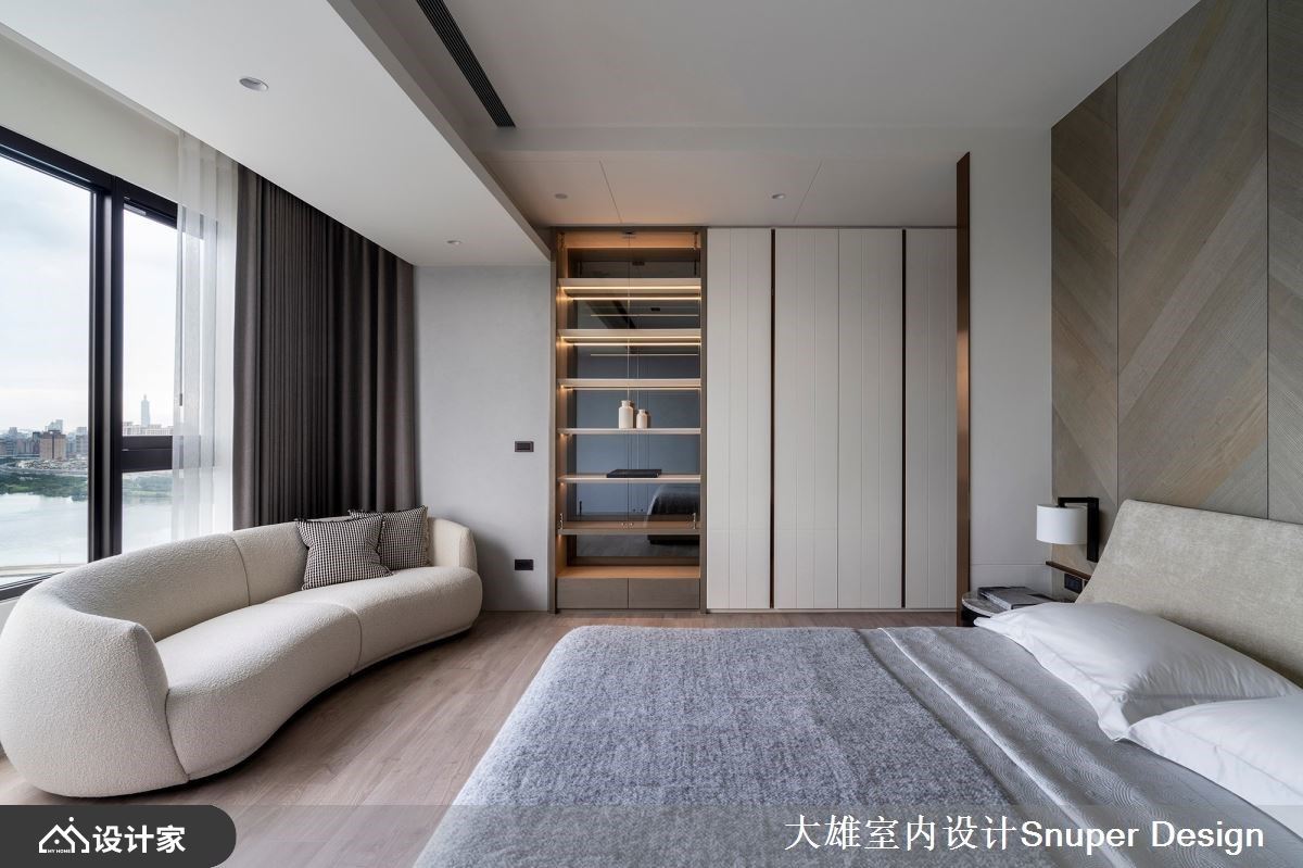 主卧房以五星饭店规格为圭臬,大面的河景绿意成为最自然的生活背景,摆设三人坐沙发,让夫妻俩在私密空间也能保有舒缓身心的休憩角落。