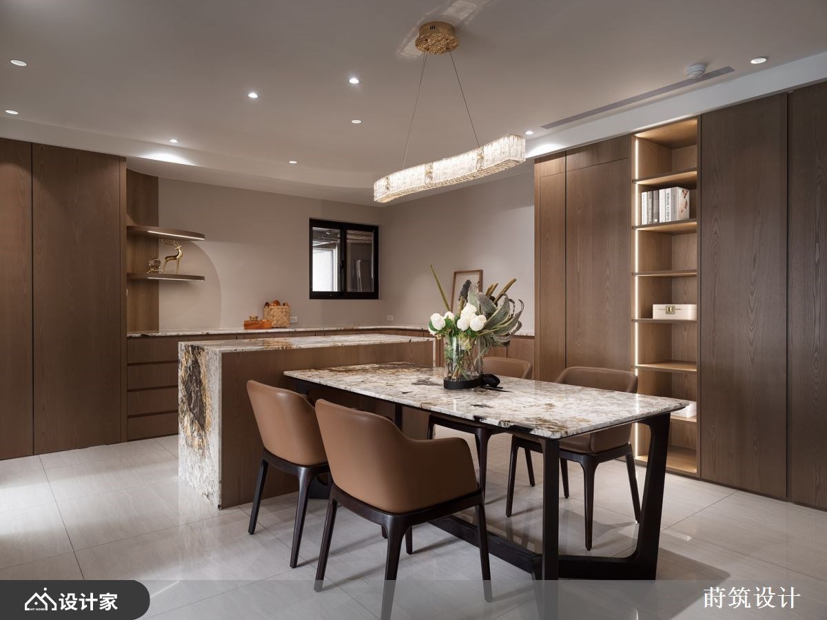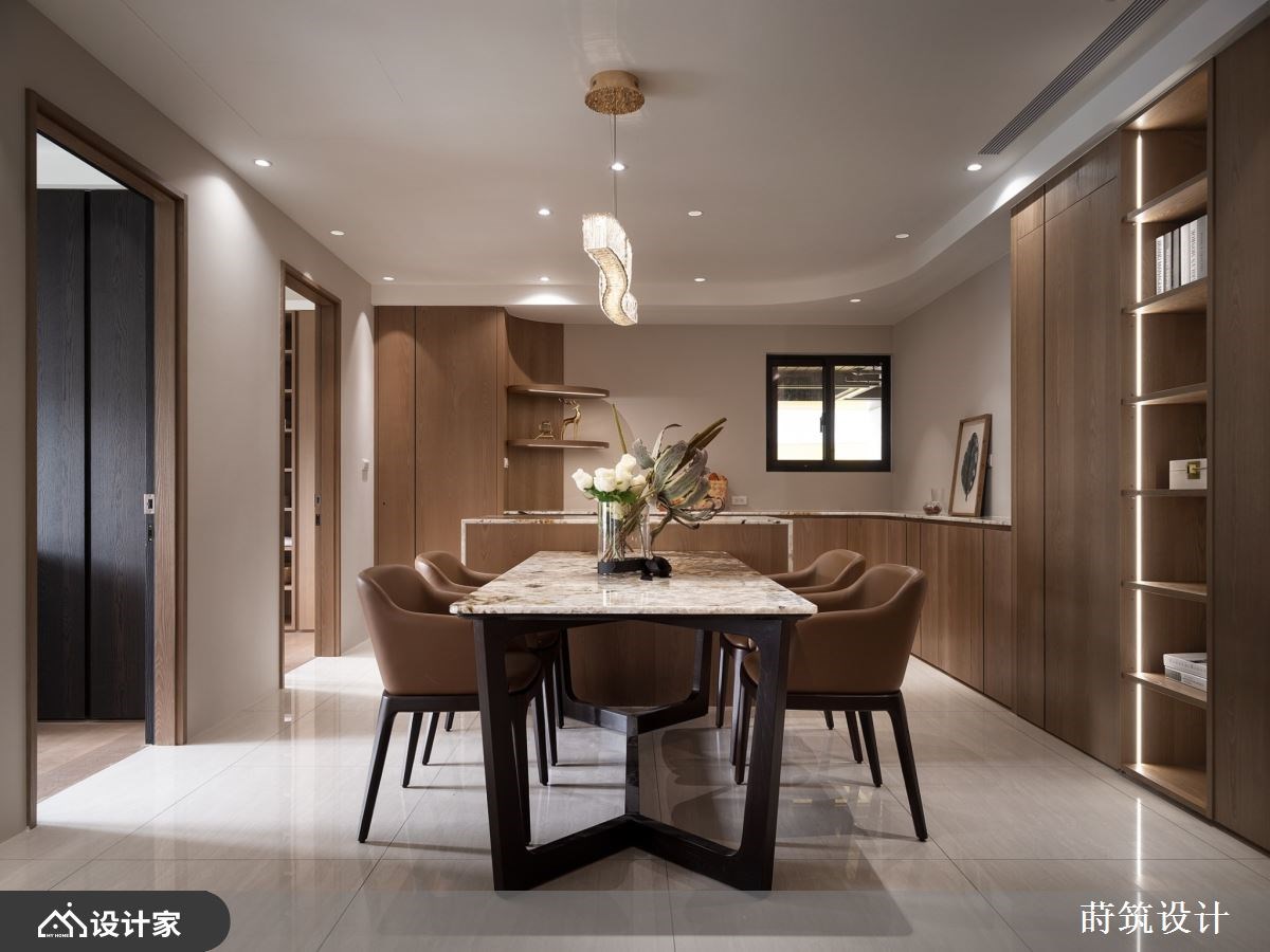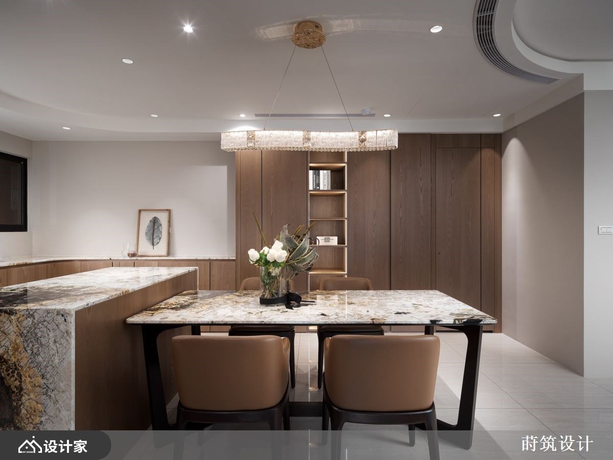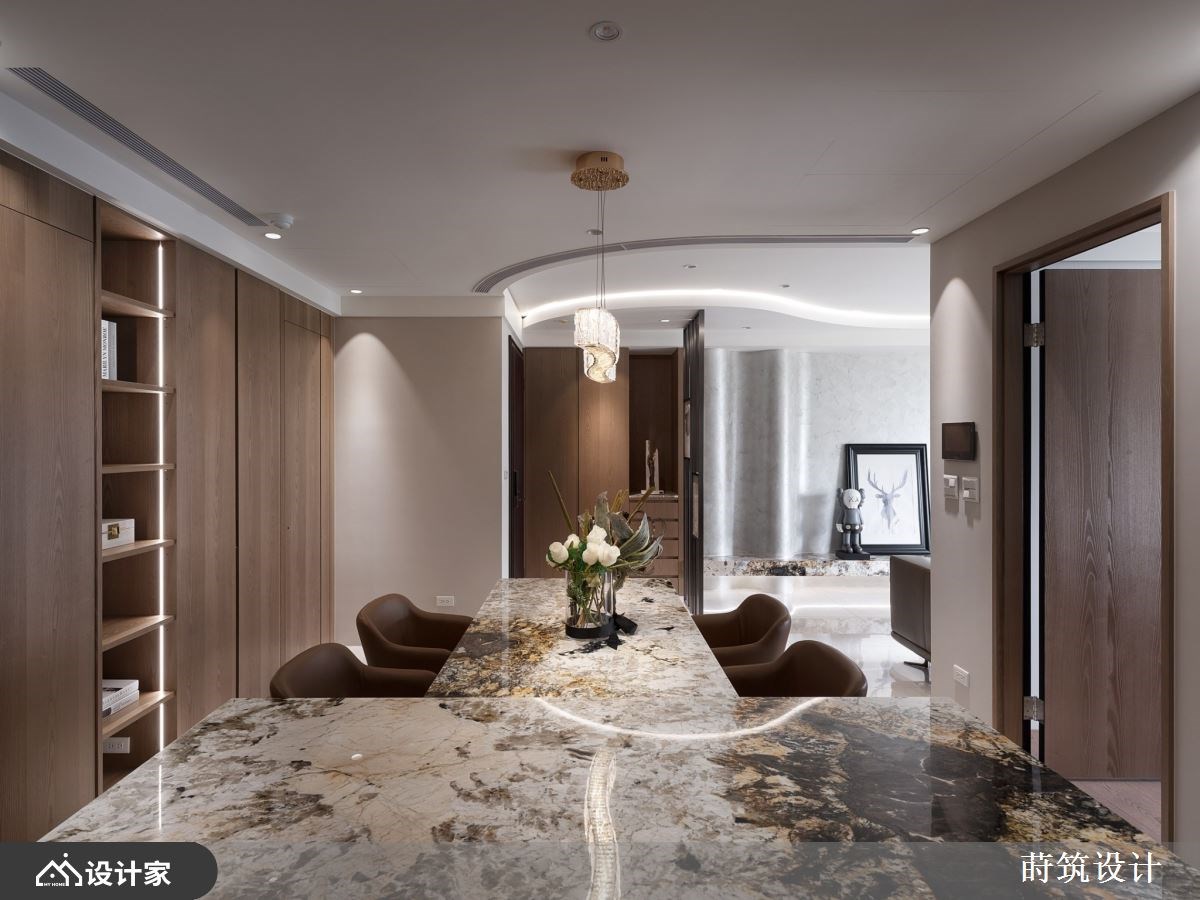 “对于退休后的生活,你有什么想像?”辛苦了大半辈子,新家风格设计除了要是自己最喜欢的模样,规划的机能要以住起来最轻松自在为主。99 平米退休宅椅沉稳木皮、内敛石材和质朴的矿物漆作为主题,玄关温润的木质鞋柜满足鞋履收纳,铁件与长虹玻璃组建的屏风,镶嵌纹理别致的石材,打造兼具美型与机能的玄关端景。 电视墙移植山峦的波浪,透过矿物漆诠释自然纹理;由玄关绵延至客厅的造型天花呼应主墙设计,让客厅呈现悠然宽敞的宁静氛围。顺着天花板弧形设计将动线引领至开放式餐厨,暖棕木皮堆叠的餐厨空间,搭载带金宗色的大理石台面,透过异材质堆叠出退休宅富有底蕴的气质。大理石的应用由客厅电视墙、茶几到中岛台面与餐桌,形塑别具整体感的人文风情。空间内也特别着重灯饰搭配,由客厅流动的线灯,到辅助全室照明的嵌灯,以及点亮餐厅空间的水晶吊灯,配合著优越的自然采光,呈现出能感知时节变化、悠哉生活的退休宅邸。 小编的最爱 主卧延续暖木设计,地坪由磁砖转为温润木地板,床头墙面以皮雕板和特殊涂料做出浮雕层次,床尾对称衣柜中间特别设计及腰矮柜,地板运用同样的大理石才创造别致主卧端景,打造收纳齐备、风格自然又易于清洁维护的空间。