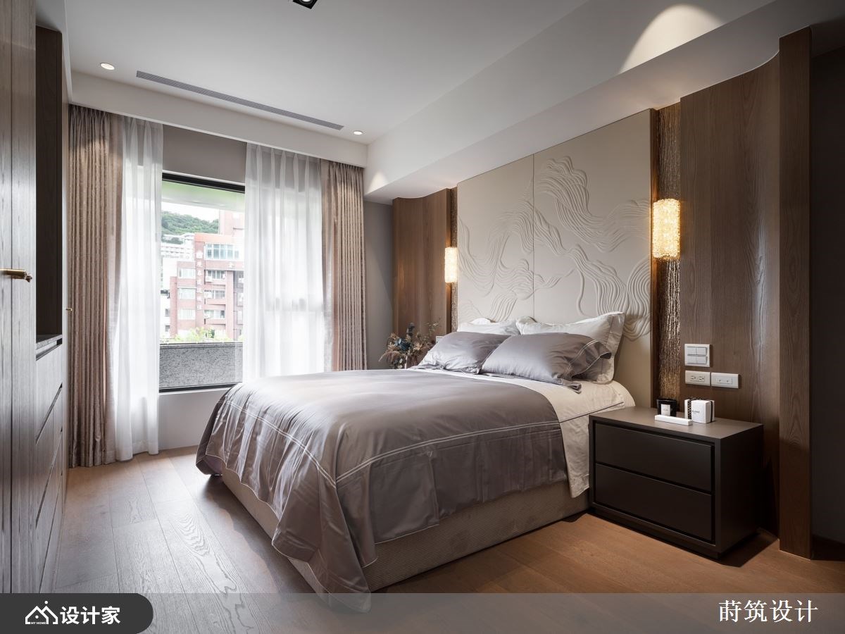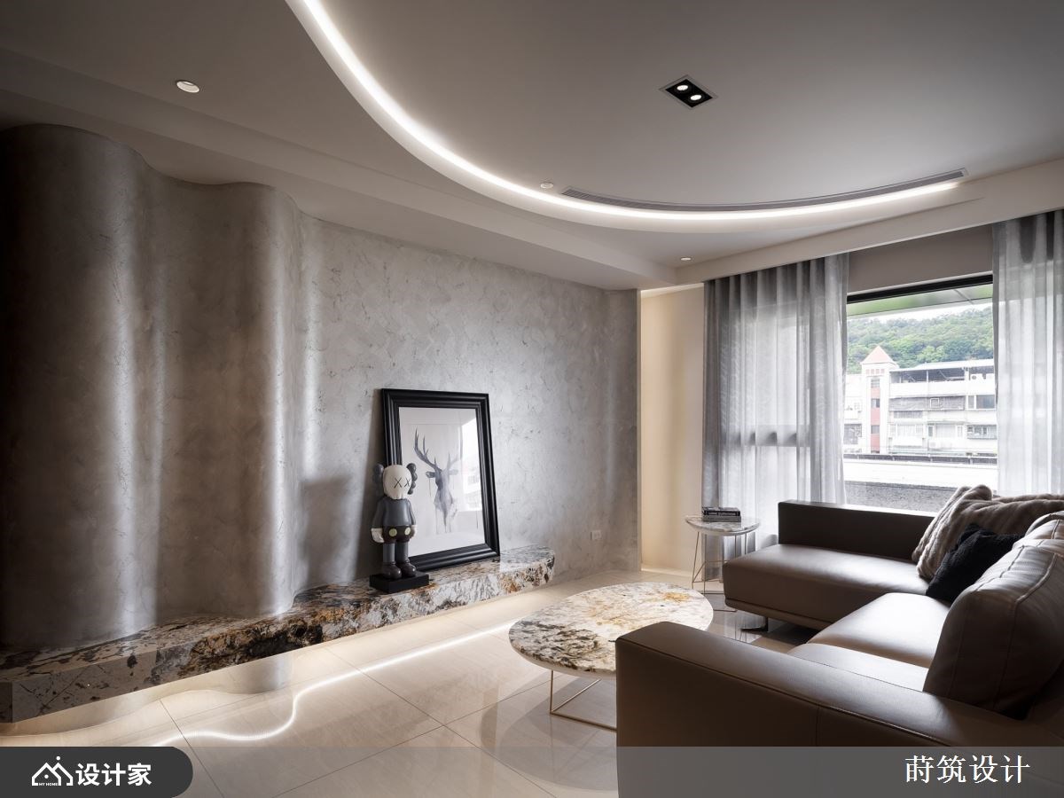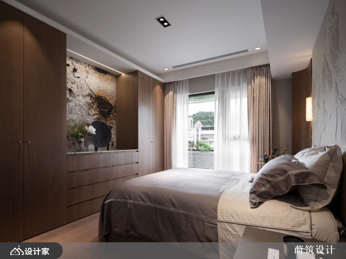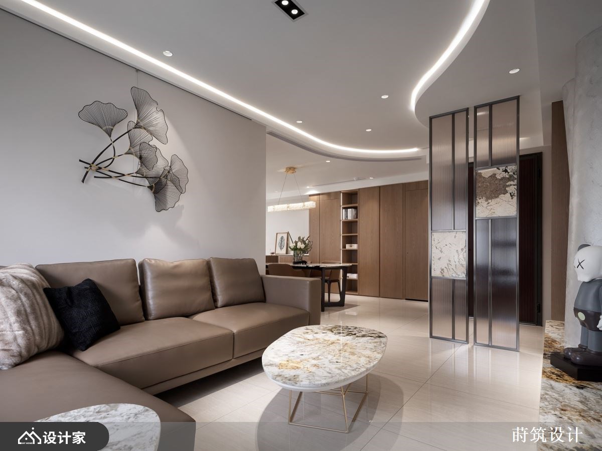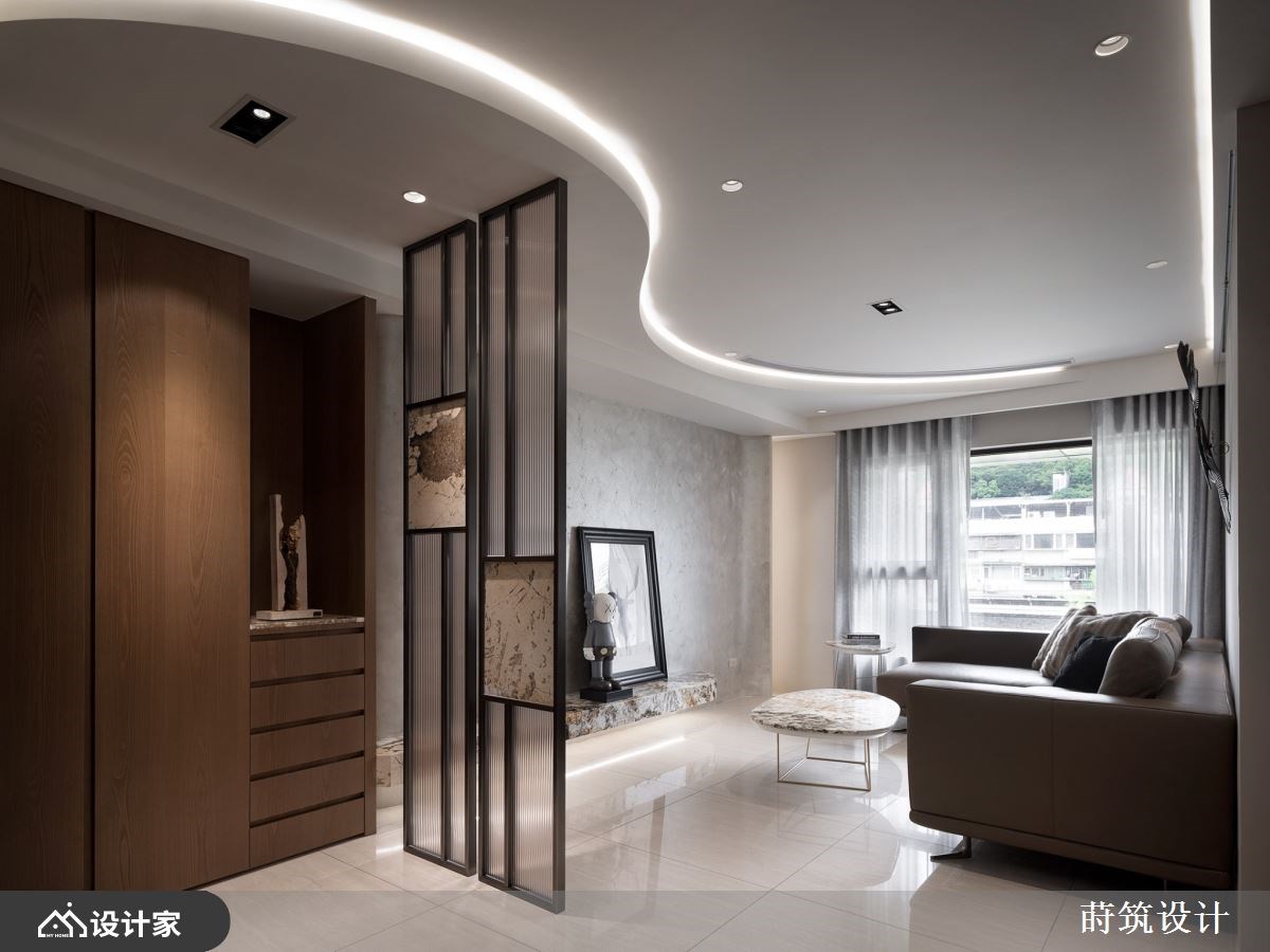“对于退休后的生活,你有什么想像?”辛苦了大半辈子,新家风格设计除了要是自己最喜欢的模样,规划的机能要以住起来最轻松自在为主。99 平米退休宅椅沉稳木皮、内敛石材和质朴的矿物漆作为主题,玄关温润的木质鞋柜满足鞋履收纳,铁件与长虹玻璃组建的屏风,镶嵌纹理别致的石材,打造兼具美型与机能的玄关端景。 电视墙移植山峦的波浪,透过矿物漆诠释自然纹理;由玄关绵延至客厅的造型天花呼应主墙设计,让客厅呈现悠然宽敞的宁静氛围。顺着天花板弧形设计将动线引领至开放式餐厨,暖棕木皮堆叠的餐厨空间,搭载带金宗色的大理石台面,透过异材质堆叠出退休宅富有底蕴的气质。大理石的应用由客厅电视墙、茶几到中岛台面与餐桌,形塑别具整体感的人文风情。空间内也特别着重灯饰搭配,由客厅流动的线灯,到辅助全室照明的嵌灯,以及点亮餐厅空间的水晶吊灯,配合著优越的自然采光,呈现出能感知时节变化、悠哉生活的退休宅邸。 小编的最爱 主卧延续暖木设计,地坪由磁砖转为温润木地板,床头墙面以皮雕板和特殊涂料做出浮雕层次,床尾对称衣柜中间特别设计及腰矮柜,地板运用同样的大理石才创造别致主卧端景,打造收纳齐备、风格自然又易于清洁维护的空间。