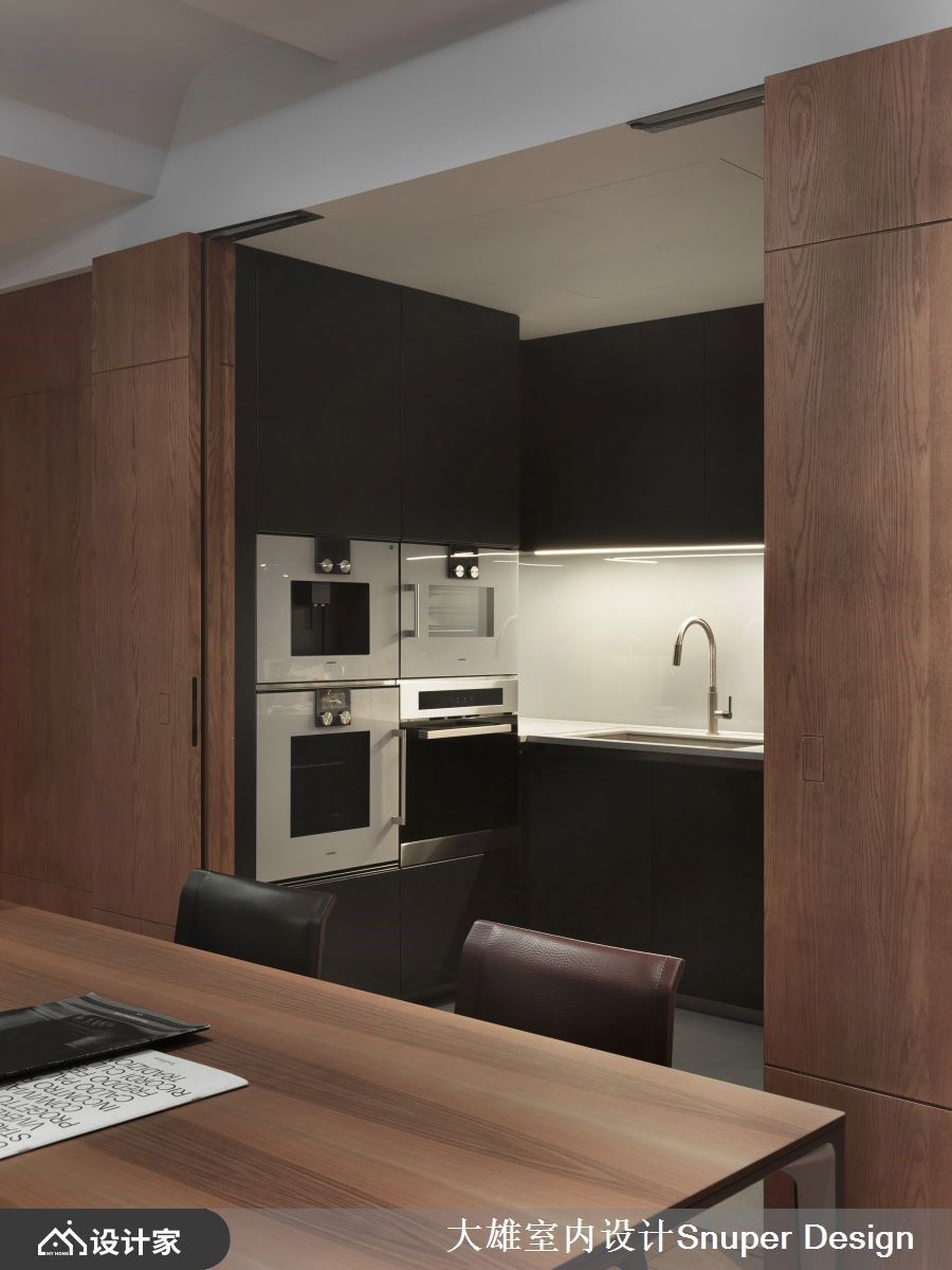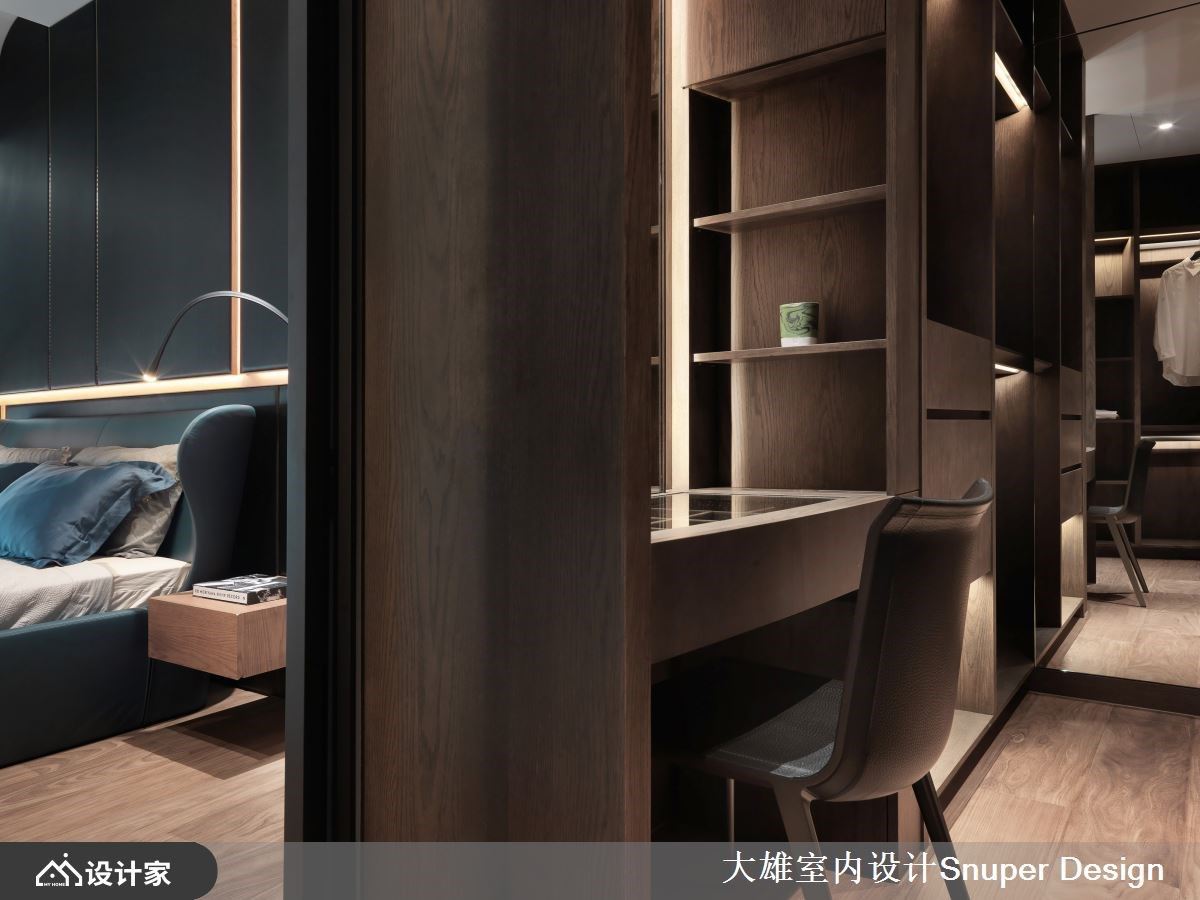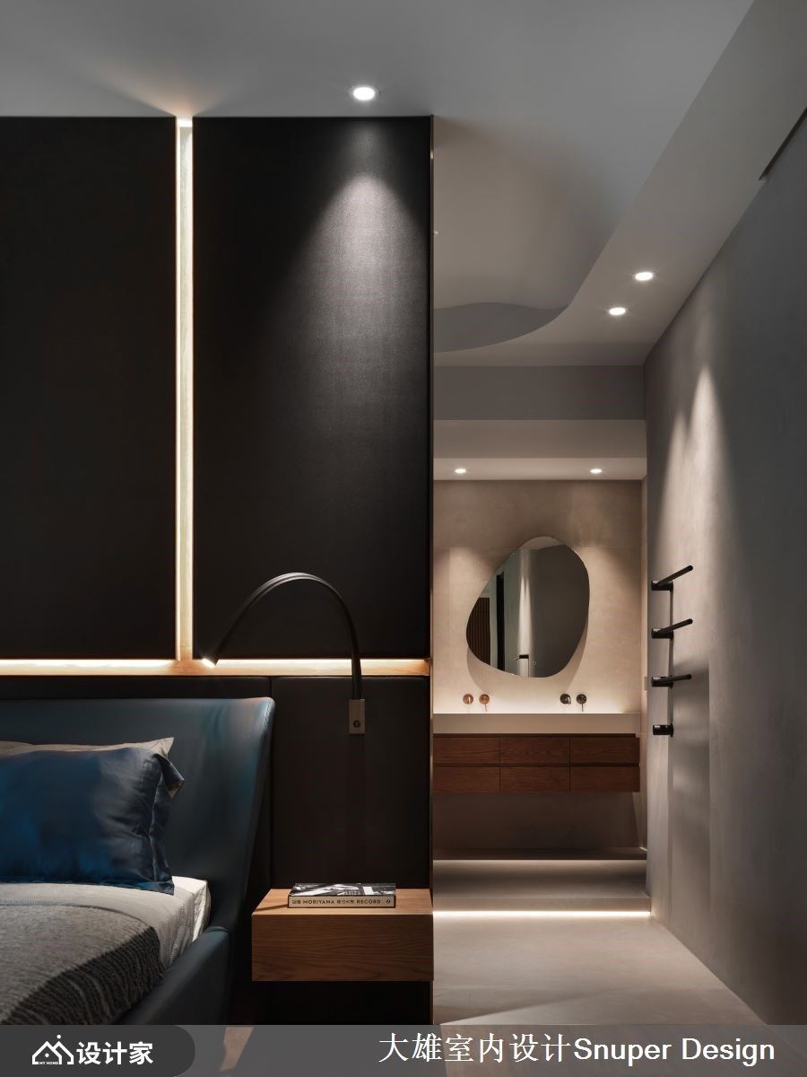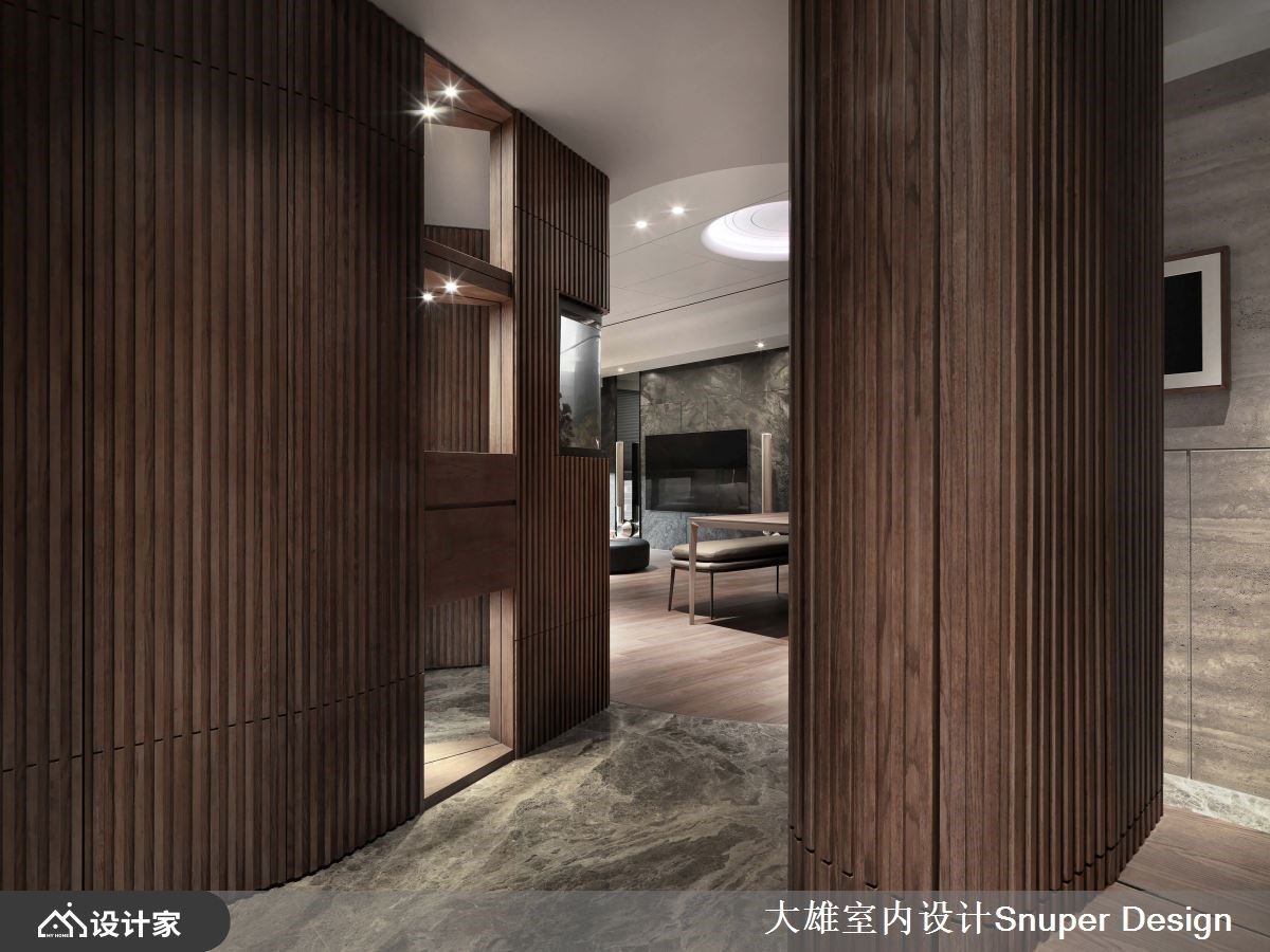 建筑是生活的容器,容纳喜怒哀乐,及人们对生活的期许。林政纬设计师将巧思与艺术融合展现创新思维,运用现代精随规划142平米居宅空间,透过木质、石材与弧线,在考虑到空间功能性的同时,将细节注入其中,通过弧形、弹性隔屏消弭边界感,也给居住者带来了更多的交互活力和选择自由。 空间以现代精奢为中心主题,玄关过道透过木格栅的量体为空间破题,并选用大理石地坪以水波纹路打造自然山水意境,当人门穿过幽微并具有指引性的玄关信道,空间的结构与轮廓就此开展。 进入公领域,客厅以深色调呈现内敛稳重氛围,天花与壁面以圆弧收尾,转化直角与梁柱的锐利,成为场域中柔软的一面,既是坚固的避风港,也是舒适之地。客厅后方以木质的造型推拉门分界出公私领域,门片结合玻璃等异材质元素,延伸出通透的空间感。开放式餐厅则与中岛结合,将内厨空间纳入隐藏门,吻合屋主日常的使用习惯。书房位于厨房旁侧,从透明拉门进入后,其中的弧形规划具有包覆性的安全感,其中的开放柜位则于背板贴上亮面石材,各材质相互对话交织家的独特语汇。 小编的最爱 卧室在设计上巧妙运用具有造型的床头背墙,将睡眠区和卫浴空间区隔开来,床尾的墙面延续了电视墙的现代美感,赋予了休息区更深刻的休憩体验。更衣室利用灯带创造出精品质感,营造出高质量的氛围,不仅实用而且美观。卫生间的部分则选择了不规则的圆形镜子,为空间增添了优雅的氛围,并融合了木质和石材等元素,营造出宛如汤屋般的舒适感。让居住者回到家中,便能立即享受到这种精致且放松的空间氛围。