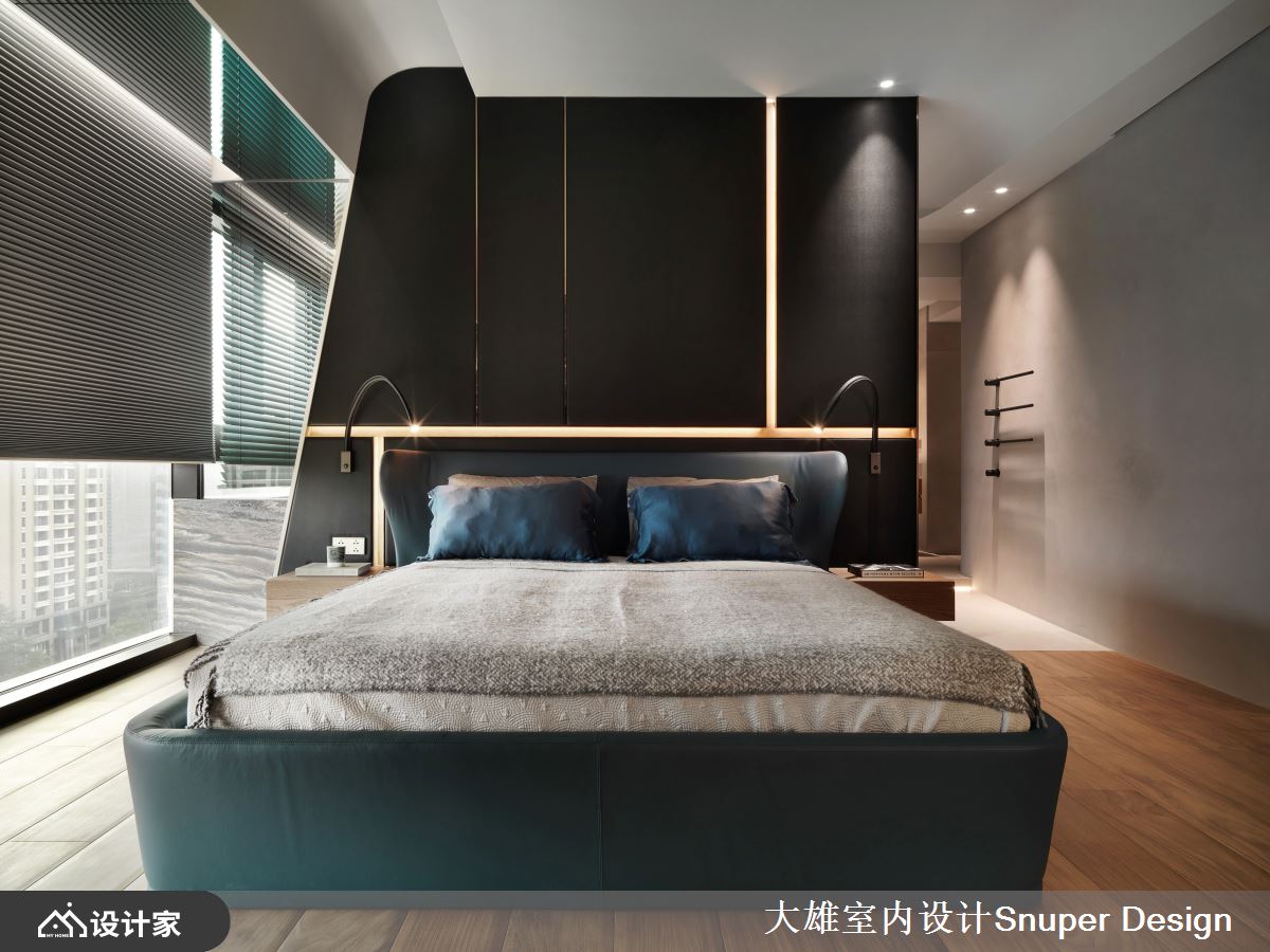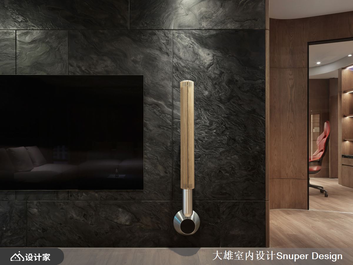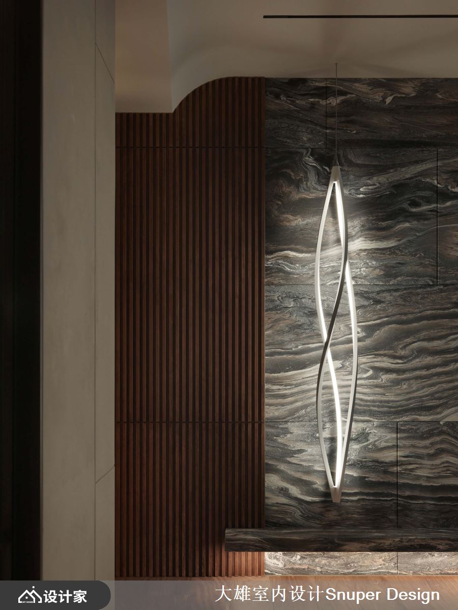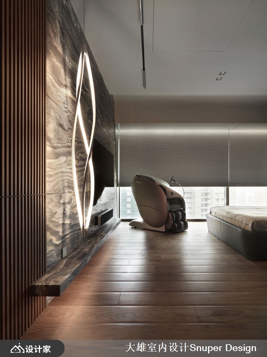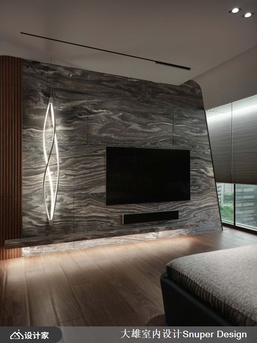 缓步迈入私密主卧,木质格栅作为公私领域的衔接媒介,而鲜明石纹的大板砖塑造电视牆,侧边装设流线造型灯饰画龙点睛。