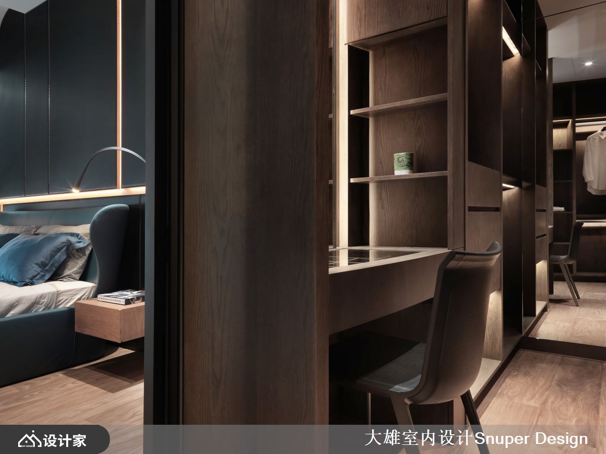 以简约俐落的造型床头背牆,区分睡眠区及沐浴场域;更衣间善用灯带光源形塑五星饭店的精品质感。
