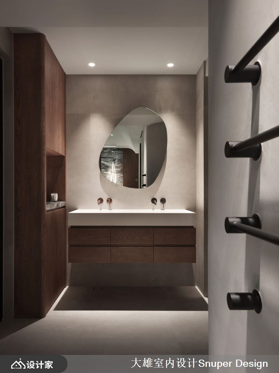 主浴配置不规则圆形镜面,为沐浴时光增添一丝柔和、优雅,而木质及石材的搭衬,更打造了日式禪風感的汤屋氛围,映入眼帘便是精緻放松的格调空间。