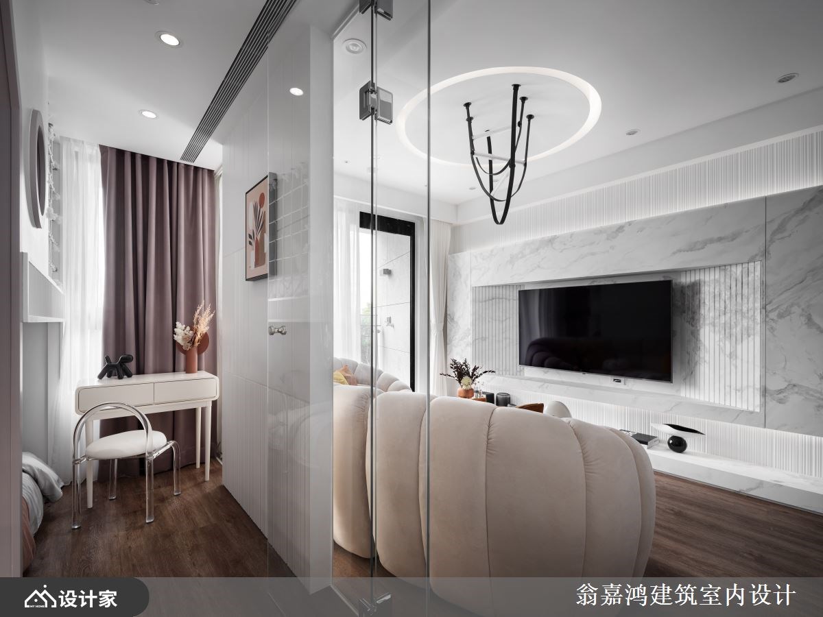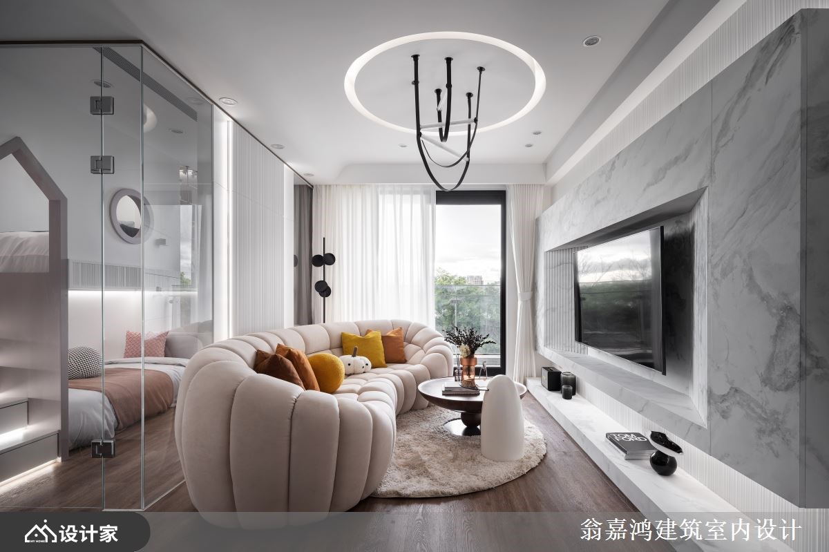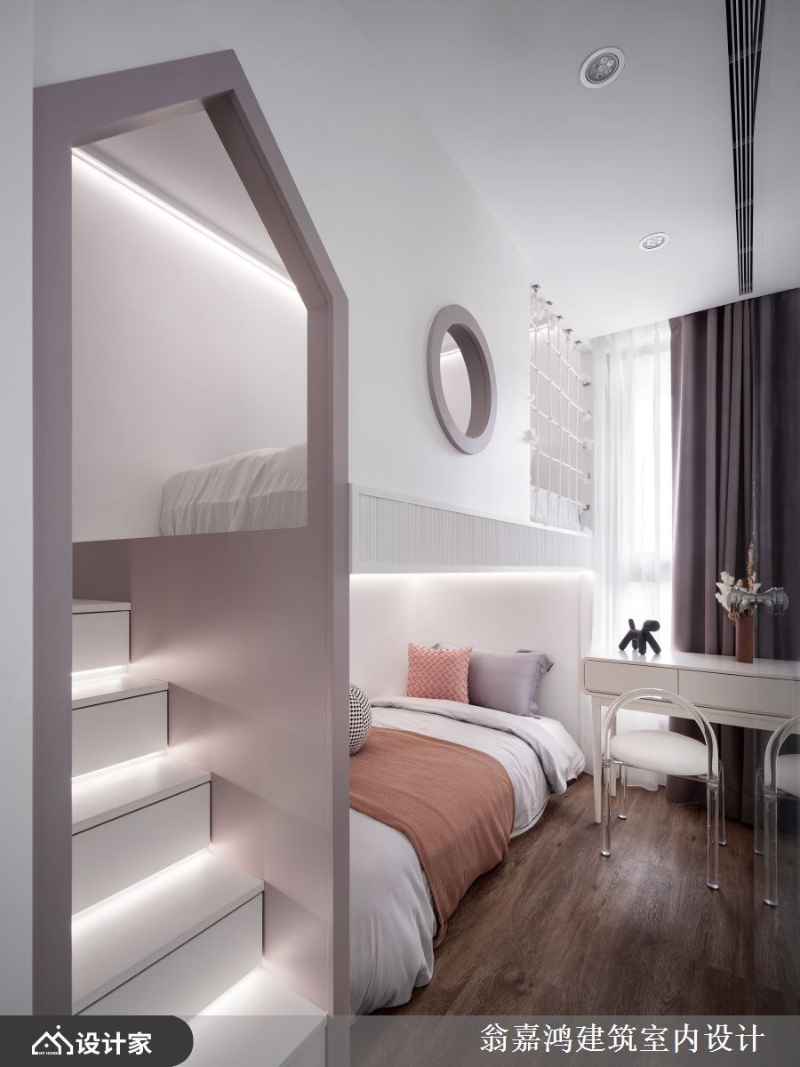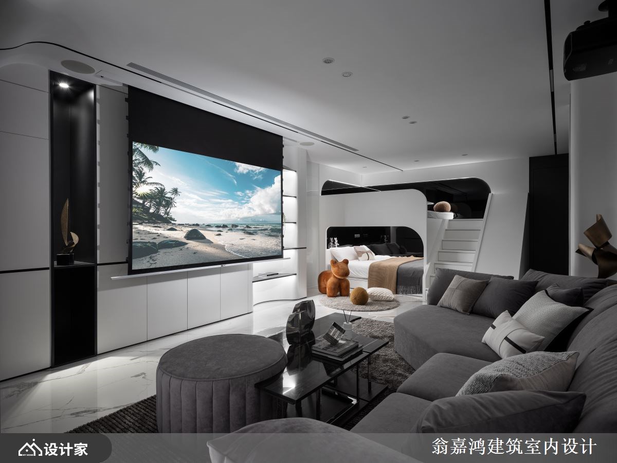 个性独立自主的小儿子希望能拥有自己专属的空间,是屋主将十年中古透天进行全面翻新的起因。198平米规划的每一间卧室都以套房概念设计,打造完整独立的生活场域;公领域以拉门区隔不同情境的休憩空间,并以沉稳的色彩包裹空间,镀钛金属勾勒出别墅应有的质感,跟上现代家庭能齐聚交流又能独立享受生活的住宅模式。 一楼客厅区域以沉稳的深棕色调铺陈墙面,沙发则选择米色皮革平衡空间色温,天花板金属反射空间垂直延展客厅尺度。客厅以及卧室空间以一扇活动拉门做区隔,创造出公私领域间的弹性;由镀钛金属边框和长虹玻璃组成的活动门呼应整体低调奢华的设计,又同时兼具风格、隐私与空间灵活度,创造一个互不干扰却又没有隔阂的生活场域。一楼主卧与电视墙在造型上有延伸性设计,开放式吊挂营造精品橱窗感,搭配整套卫浴设备满足独立生活的使用需求。二楼起居空间转为黑白俐落的现代简约设计,风格跨越年龄、能陪伴孩子成长;简约的色彩搭配弧形曲线增添空间造型感。起居室规划了视听影音和阅读沙发区,以投影布幕取代电视,超大荧幕游戏电竞区让孩子享受极致生活体验;空间墙面也许多磁性烤漆玻璃提供孩子涂鸦记事,养成有纪录计划的好习惯。依照孩子的喜好订制上下铺并在卫浴配置大浴缸,除了父母陪伴儿子亲子时光外,有时儿子的同学或亲友小孩来家里时可一同玩乐、泡澡与睡觉。 小编的最爱 三楼为了屋主姐姐偶尔回娘家时打造的短居空间,全层以淡雅的粉色调为主轴,木质地板搭配灰白电视墙打造舒适的阳光客厅。客厅后方以玻璃帷幕区隔出寝居空间,同样也运用上下铺设计让姐姐与小孩回来时能有各自舒适的空间,造型门扇带着女性可爱童趣感。