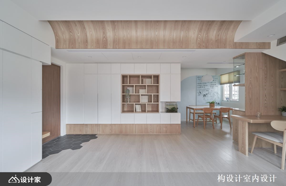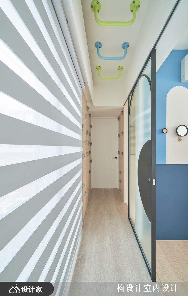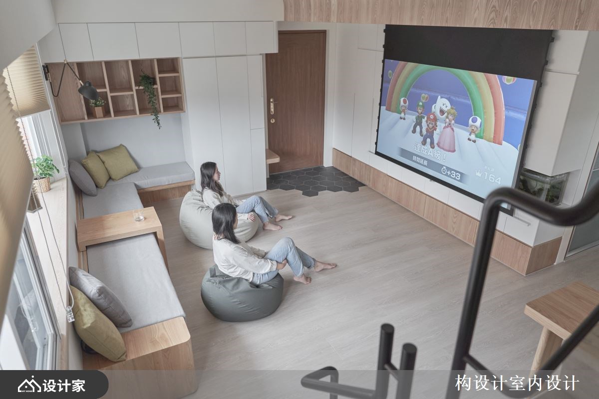 这座位于市区的双层公寓曾是屋主新婚时的爱巢,但随着家庭添丁,原本的空间已不敷使用。面对家中有三位学龄中的孩子,设计团队特别将105.6平米复层中古屋跳脱传统住宅配置,加入童趣设计、以更弹性多变的空间运用,让一家人能够聚在客餐厅的开放空间中,共度亲子时光。 以“创建一个适合亲子共处的全新场域”为核心理念。客厅区域选择使用布幕和投影机来替代传统电视;配置了一个长形的飘窗和活动桌板取代沙发,让客厅保有充分的弹性,孩子们可以尽情翻阅故事书,或在任何位置自由游玩。创造一个希望透过随性且不受拘束的空间布局,为孩子们带来更丰富和有趣的日常体验。天花板特别以木皮做圆弧收边弱化大梁存在,客厅收纳统整于同一个立面满足收纳机能但又不影响生活动线。善用梯下空间规划私人阅读空间,让开放式住宅里能有不同机能的休憩角落。卧室以北欧风经典的浅木与白为基底,在不同房间都选了轻柔的粉紫、粉绿替空间带来更多童趣感;简约的设计上在墙面添加洞洞板,能满足孩子自己布置收纳个乐趣。 小编的最爱 考虑到小朋友们平日喜爱攀岩,我们在二楼的走廊上安装了蓝色和绿色的吊杆和攀岩墙,这不仅满足了孩子们的运动需求,也为亲子互动创造了主要场所。