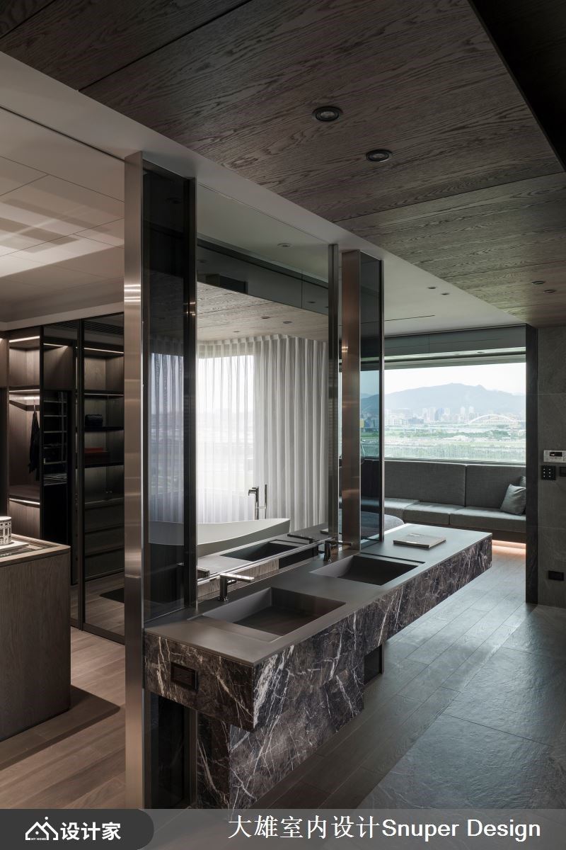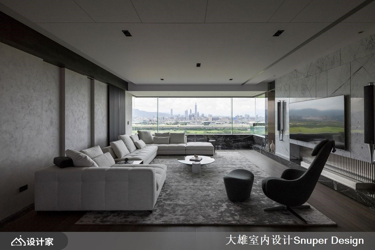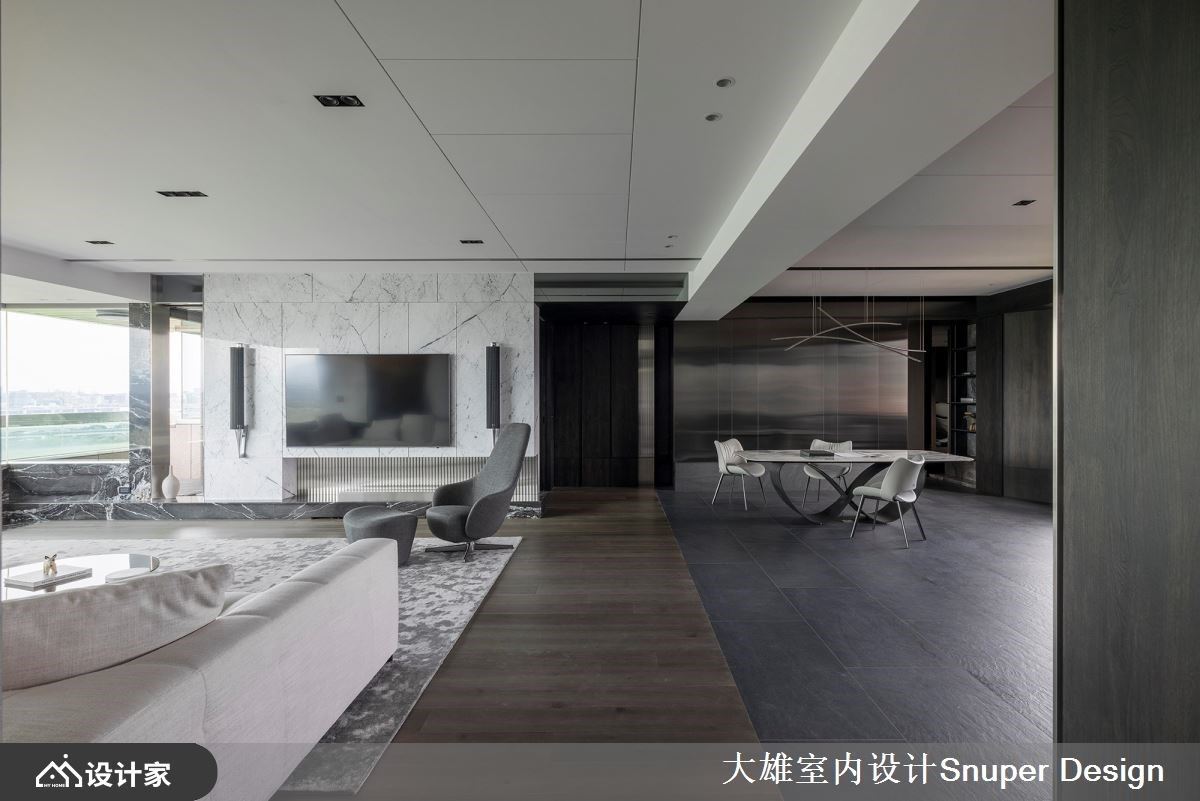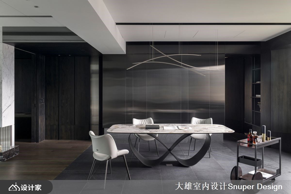 迈入231平米中古屋,居宅坐落于机场及河景绿意旁,在家便能眺望101大楼以及山川起伏的壮阔景緻,大雄室内设计于此案设计层面上,特别着重于空间与景观串连,透过将繁华的都市景色引领入室,并适时加入居者的独特品味,让屋主一家在忙碌的生活步伐内,也能保有一丝宁静、惬意。 公领域铺叙沉稳灰色为基调,温润木质地坪奠定居住空间的暖度以及静谧气息,建材堆叠上选用凋刻白天然石材点缀敞亮厅区,临窗处的深色石材则化身居家框景,将四季更迭之景色框成一幅迷人画作,更于无形间形塑层层堆叠的视觉层次,而餐厅空间添抹深色镀钛金属点缀,于现代时尚氛围内植入冷酷的鲜明个性;格局规划上,以开放式空间获取更加开阔大气的视觉飨宴,善用异材质地坪界定场域的分野,保留适度的留白语彙,打造弹性充裕的行走动线与悠然慢生活的呼吸频率,其次重新解构隔间的定义,一道电视牆界定了书房与厅区之分界,而静谧书房亦化身公私领域的衔接媒介与过渡空间,透过动线的循循转折,创造若隐若现的暧昧地带,无形昇华了人与空间的情感温度。