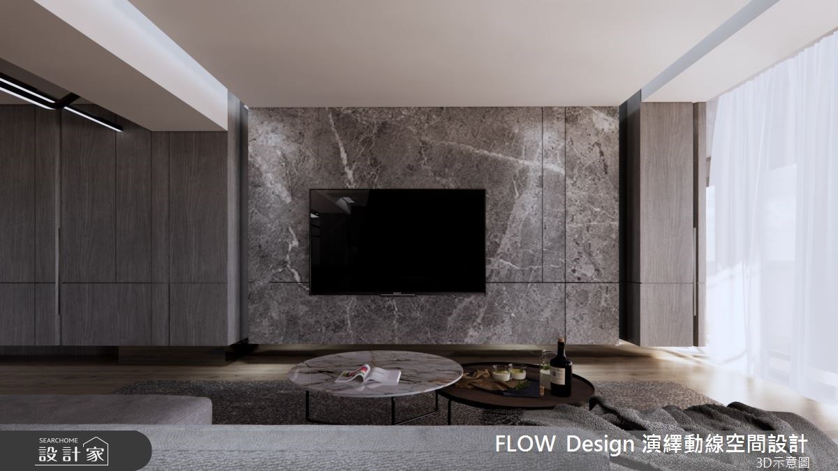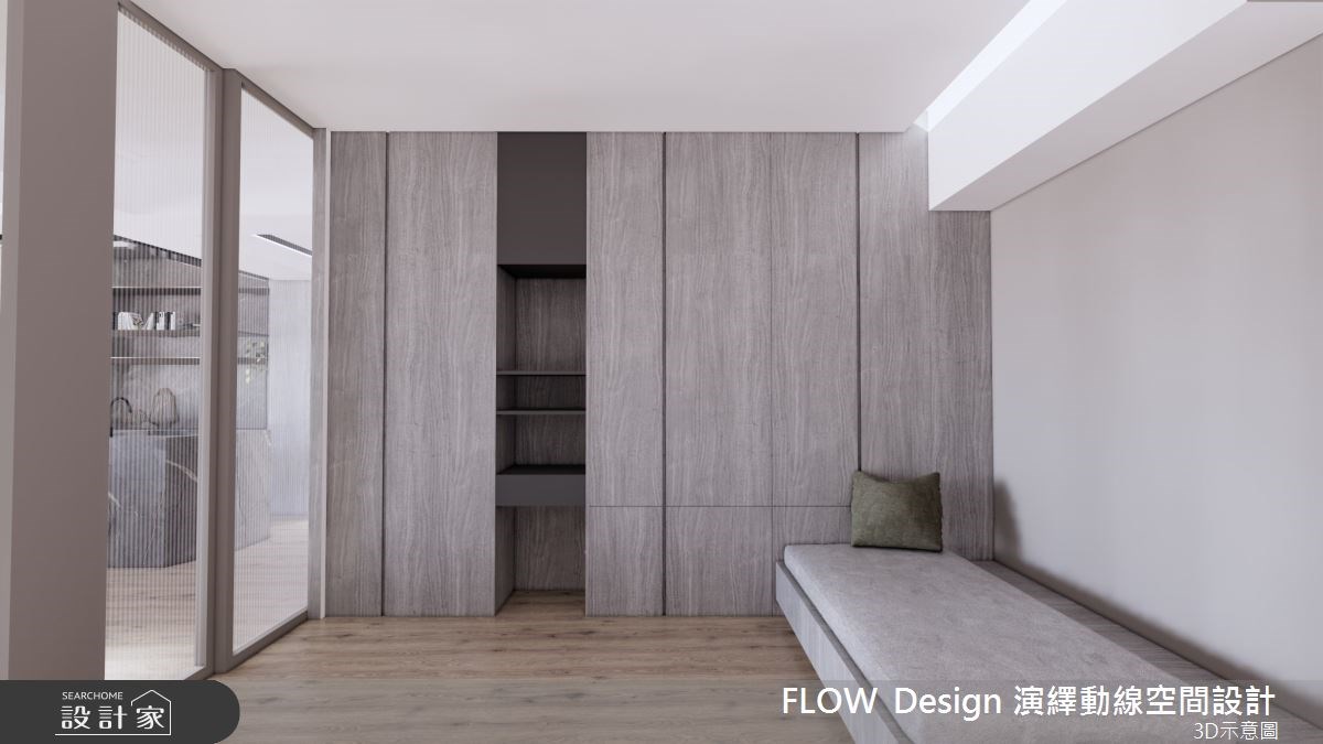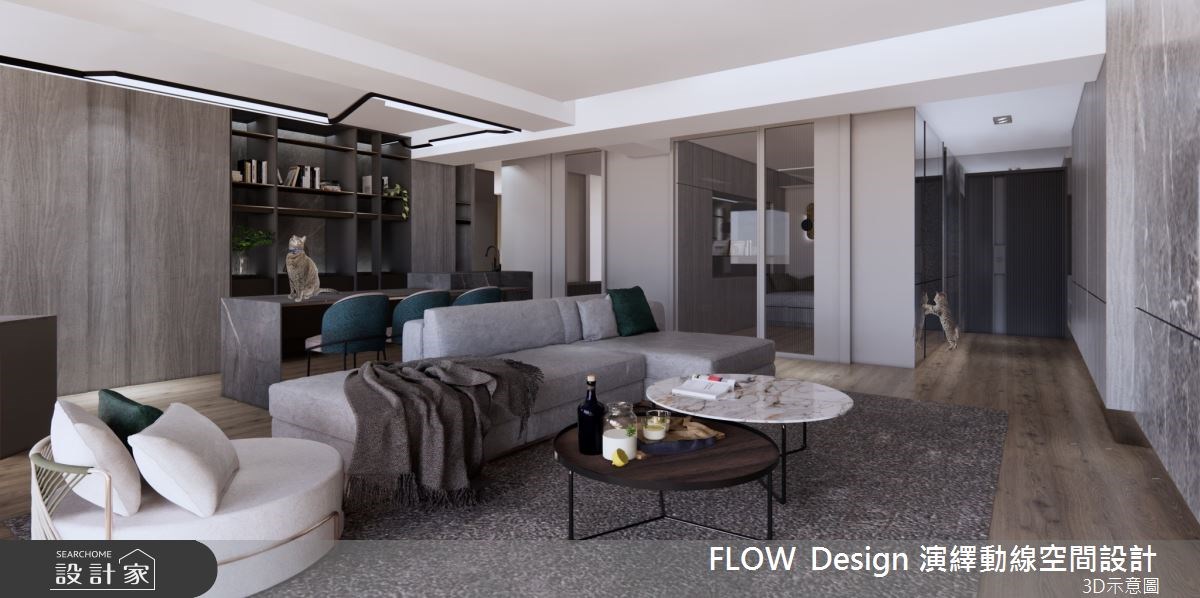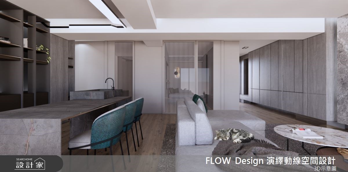 屋龄21年的老屋为长形格局,并具有动线不佳、水电管线老旧等问题,无法满足屋主的生活期待,以及猫咪的日常活动。因此设计师将隔间打开,重新调整公、私领域的配置,不仅有效放大空间感,更连结了居家和猫咪的生活互动。 重新规划後的客厅,享有宽敞舒适的大尺度,纳入中岛餐桌和开放式书房机能,并将猫咪动线延伸至柜体和天花板处,满足猫咪对於垂直空间的探索好奇心和活动量,也成为居家中的特色亮点。色调安排上则以俐落简约的灰调为主题,运用柜体、石材的分割线条,赋予现代时尚气息。私领域则依据不同的使用需求,结合多元的材质、色彩、机能,划分出多元的寝卧个性和休闲氛围。 小编的最爱 公领域旁的多功能室,既可以满足丰富的收纳机能,也利用卧榻设计作为客房或休憩的弹性延伸;并采用可穿透的门片设计,打开了空间的宽敞舒适感。