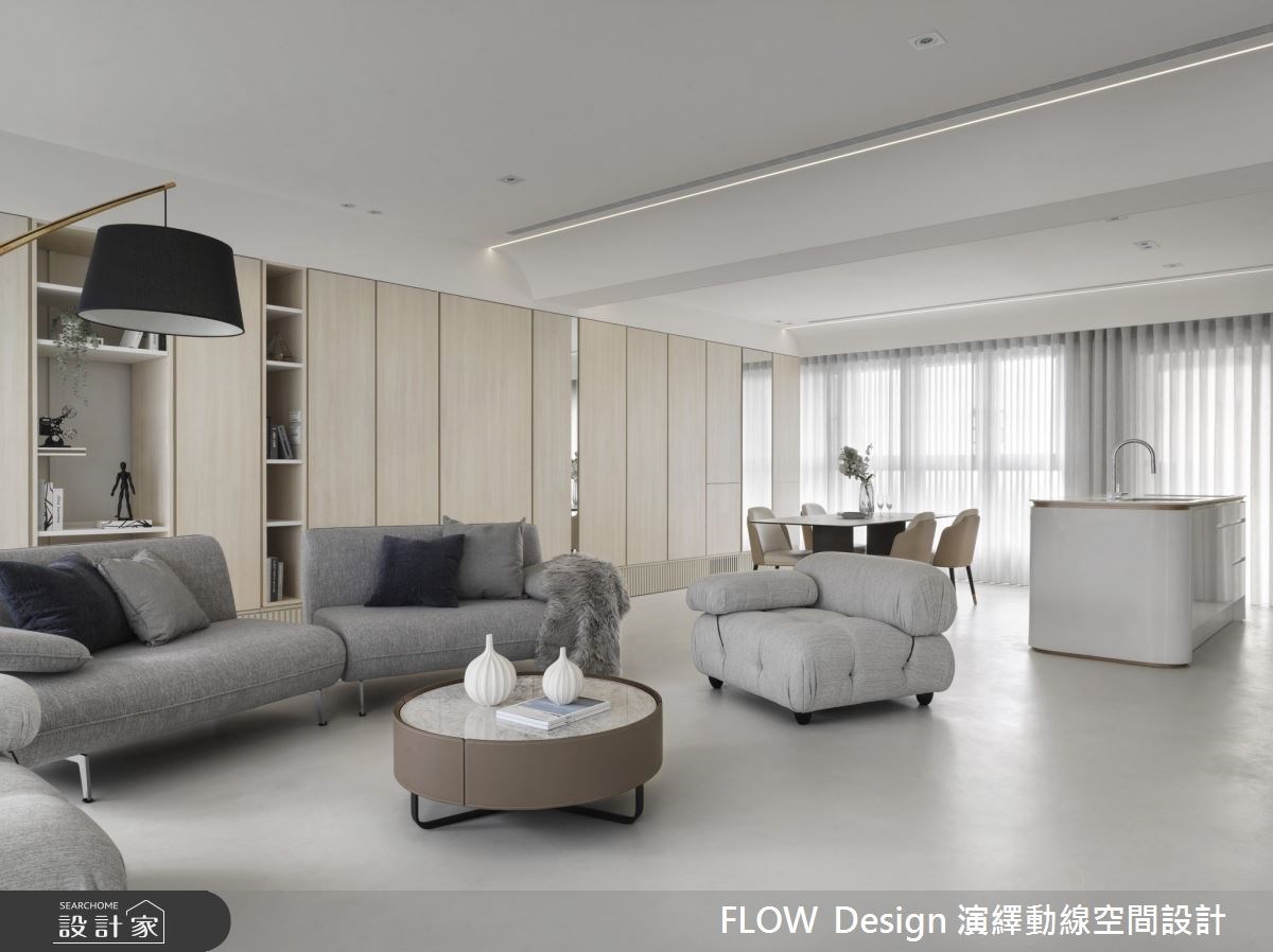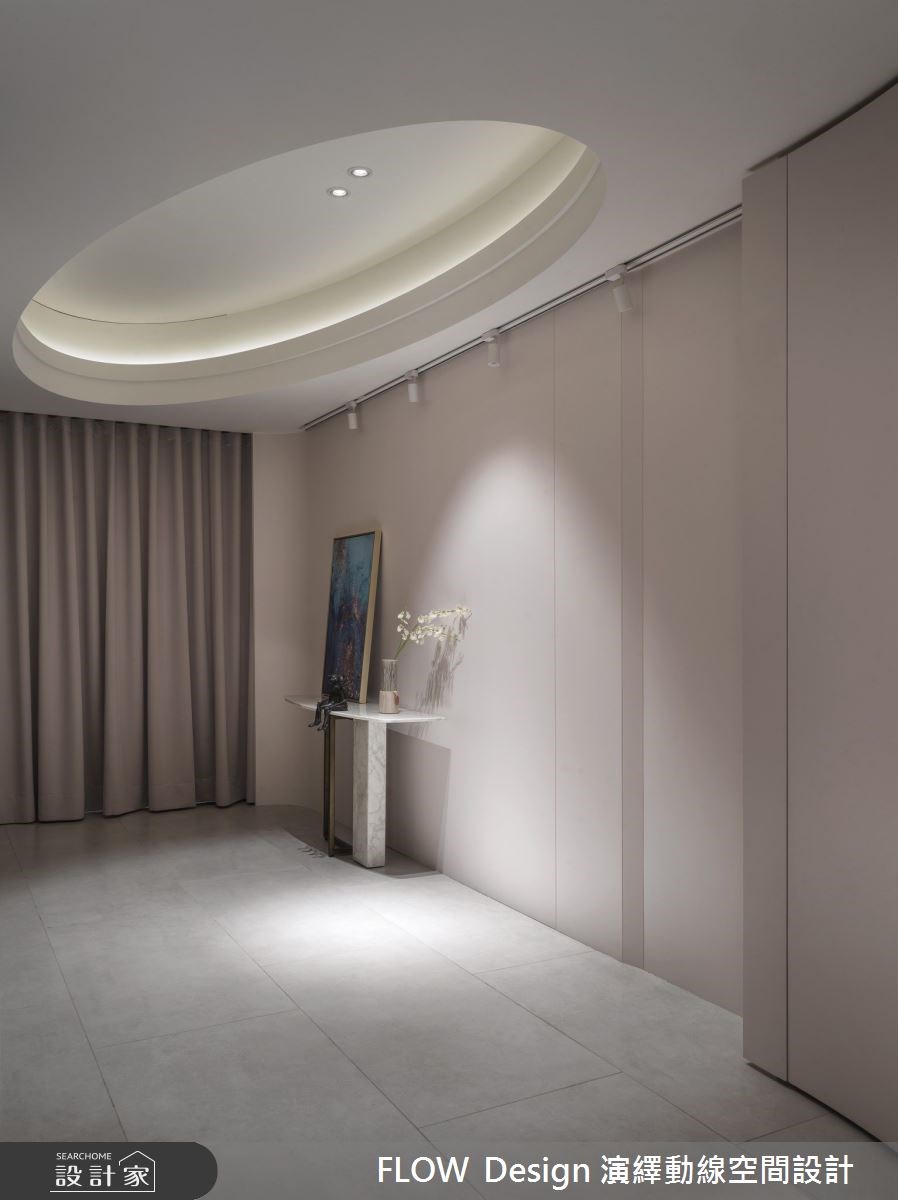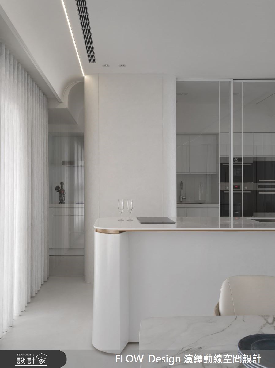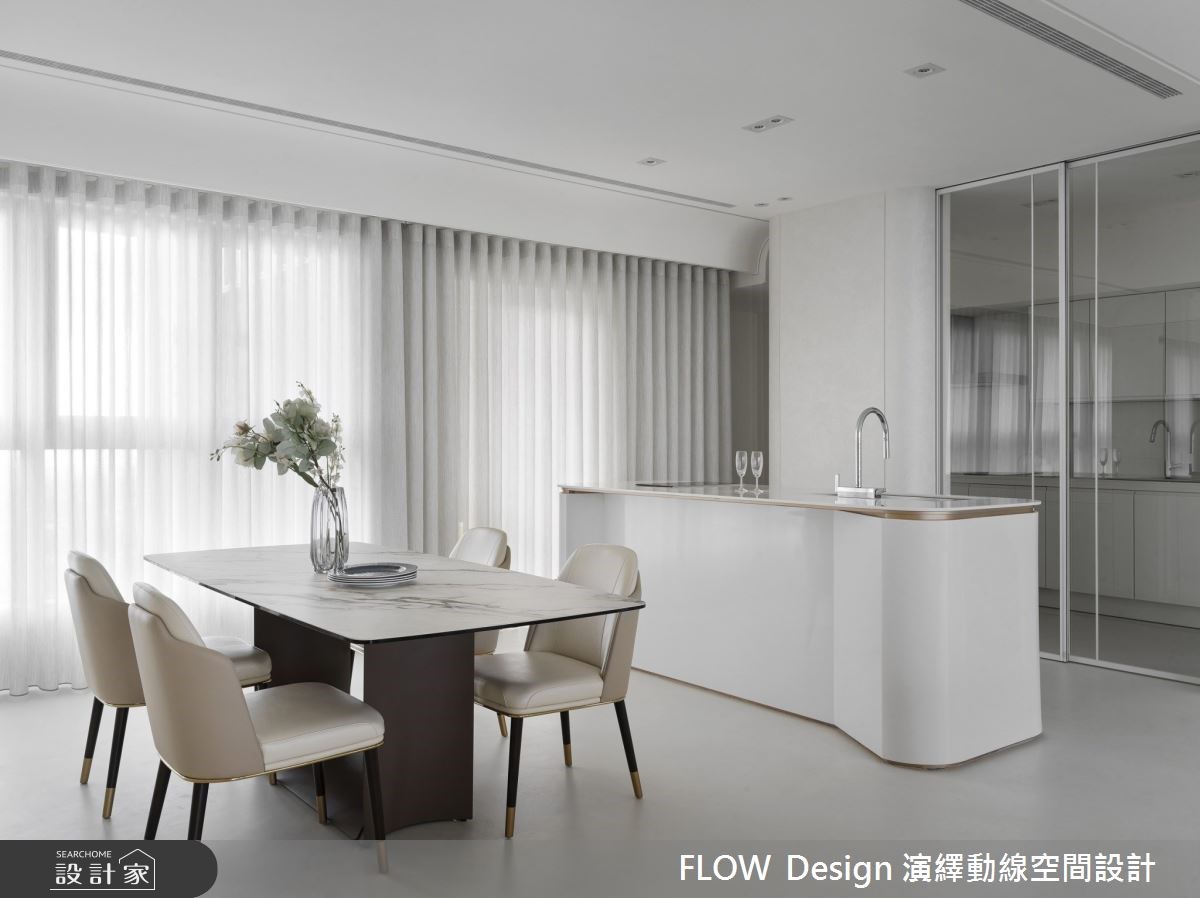 医师屋主面对忙碌与高压工作,最理想的纾压方式就是能打造一个能看得到绿意、能展示艺术收藏的慢步调住宅。面对 75 坪宽敞的室内空间,设计团队以拱廊和弧形取代隔间,创造出开阔公共空间;简约灰白搭配淡粉色调,衬托住宅的窗景绿意,也让屋主的画作藏品成为空间焦点。 推开大门进入玄关长廊打造圆弧造型天花,大理石展示台摆放的艺术收藏与植栽,衬着淡粉墙面界定出优雅的落尘区。漫步入室内的路径中,规划了精巧置物平台与穿衣镜,并利用曲面屏风与灯带营造出舒适的动线、亦解决穿堂煞的风水疑虑。为了凸显住宅环景优势,开放式厅区以自由的艺术陈列方式编排机能空间, 客厅简约现代的双面沙发,能饱览 360 度窗景;利用可收折的投影布幕取代电视,空间中的收纳统一规划於梁下,以柜墙方式设计不仅收纳量大、形式丰富,也能隐藏通往其他空间的门片,创造整体优雅的视觉。另外,设计团队还特别以吊隐式除湿机来解决先天地理上潮湿的问题,赋予一家三口极致的居住体验。 小编的最爱 以白铁玻璃拉门将热炒区独立出来,避免油烟飘散到客厅,并在外厨规划一座弧形中岛,大理石台面与优雅的弧线造型,让家人可以在此享用轻食早午餐、夜晚也能成为夫妻放松小酌的静谧空间,将生活与艺术用设计体,真实呈现欧美杂志款令人称羡的居住空间。