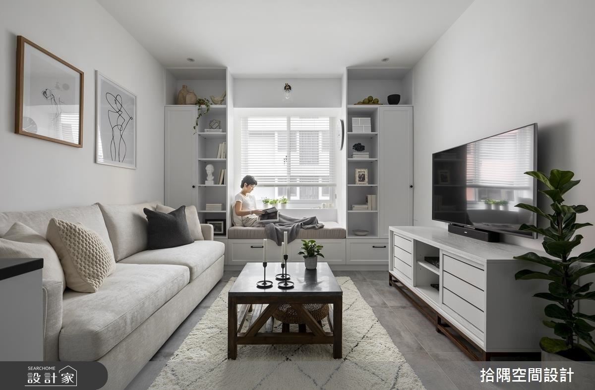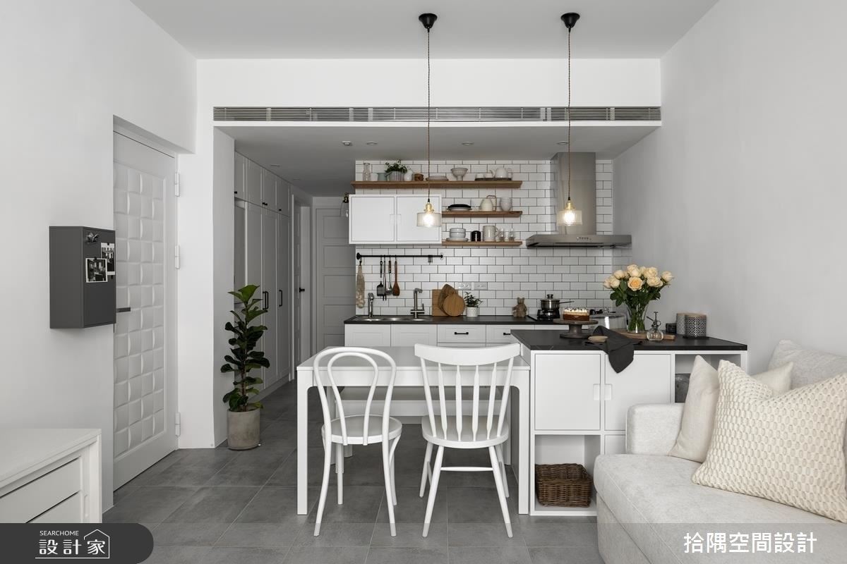Project 02 仿清水模磁砖 x 美式线板 构筑气质女性小确幸 对於乡村风带古典风格的旧宅里过渡繁复的装饰有些厌倦,加上第三次换屋的女屋主搬到市区生活後空间缩小许多,刘玉婷设计师梳理屋主过去居住经验并加入对未来的期许,将义大利进口仿清水模磁砖作为盛装新生活的基石。简化繁复的雕饰後以经典美式线板设计刻画简约线条,并添加风格地铁砖与仿石纹薄板於厨房空间,在白色为衬底的 14 坪小宅中展现耐人寻味的设计。 义大利进口仿清水模磁砖渐变的纹理与略带粗糙的质地是客厅的主角,墙面与柜体则以大面积的白色油漆搭配;厨房在白色调中延续磁砖主题,黑色填缝的地铁砖搭配保留木头自然边层板形塑女屋主喜爱的清新厨房。在灰白色单纯配色下,磁砖的纹理、餐椅的造型以及柜体的分割丰富了空间,诠释简单却富饶的生活意趣。