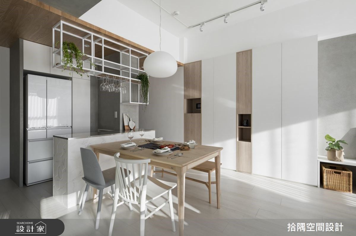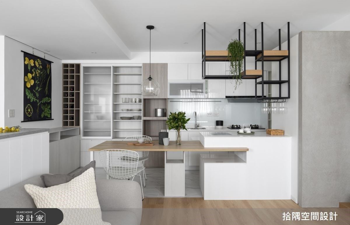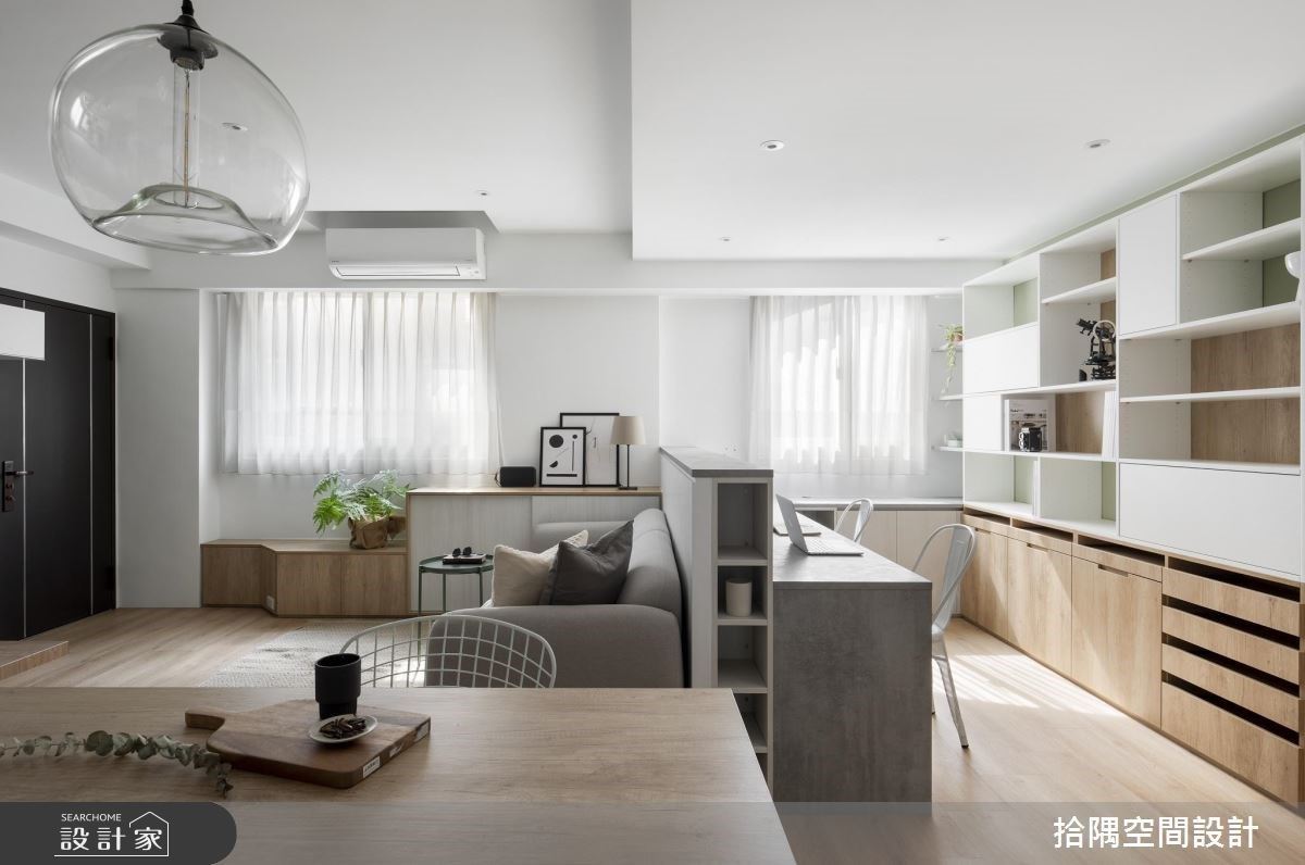 Project 03 水泥粉光 x 实木地板 共创夫妻相处的恬适宁静 材质混搭或许没有一定的数量限制,但是要达到异材质共存的平衡感,建议空间内色彩与纹理择一表现。拾隅空间设计在夫妻共处的 21 坪空间中以木地板为主角,但在色系上挑选偏暖调的木质搭配建商配置的深棕门片以维持色调一致性。其他部分用到的木皮与木作柜体,则是依循暖调色彩计画挑选纹路与节眼相近的木质。 此案中水泥粉光的角色用来衬托木质元素,因此在涂抹方式与色彩调制上较为轻柔,而用来打造开放式办公区的系统板也选择清水模的灰,在同一种木纹下利用涂装的色彩深浅去堆叠出层次,只在中岛吊柜植入黑色铁件做局部勾勒,厨房其他材质则依循浅灰搭暖木的组合,用不同材质谱出同频设计。