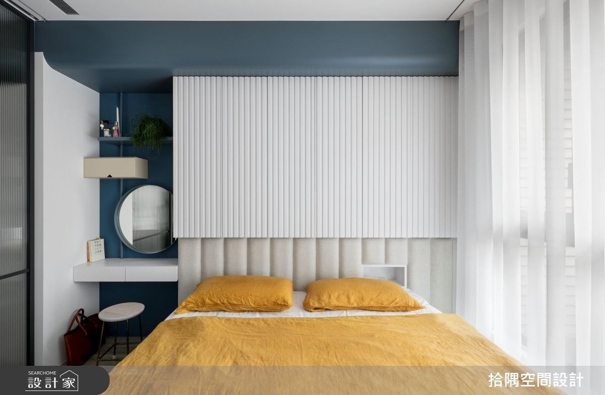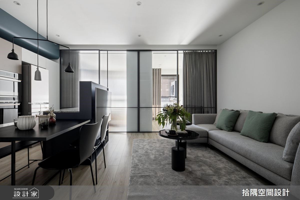 Project 02 玻璃隔间让小宅放光明!中岛与电视墙创造品味混搭风 13 坪的大套房里原始屋况没有隔间设计,从夫妻两最在意的采光考量为格局改造的核心,公私领域各自占比约二分之一,利用铝框玻璃门做出透光材质的隔间,让靠窗处的卧房与客餐厅区域都能共享自然光源,寝居空间的内侧有拉帘增添睡眠区隐私性。将衣物收纳集中在床尾,把特色设计聚焦在床头板,床头下方考量安全与舒适度选用浅灰绷布材质,上方利用格栅设计修饰单调的床头柜,略带弧型设计将化妆台安置於床头,衬着莫兰迪沈稳的蓝调,满足夫妻理想中的特色卧室。