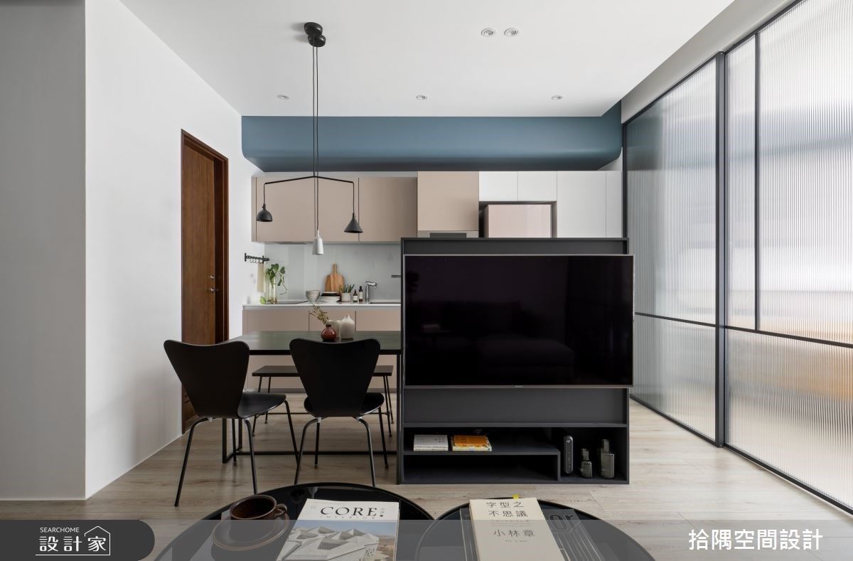 剩余的二分之一空间规划成客厅以及女屋主渴望的用餐空间,设计师将电视矮墙结合中岛,挑选一张大小适当的餐桌就完成屋主心愿。由沙发望去,黑色铁件形塑的精致电视墙满足生活休憩不可或缺的视听娱乐空间,电视墙的背侧利用父母装潢的大理石剩料延伸出宽敞的石材中岛台面,横跨客厅与厨房活用有限的空间打造出双向机能。为了体现小坪数的灵活度,选择可移动式餐桌与电视墙中岛并列;挑选两盏丹麦设计品牌 Menu Cast Pendant Light 金属垂挂吊灯平衡垂式了空间的比例,其他立面则用淡雅的莫兰迪粉与蓝,搭配原木材质混搭出理想的生活样貌。