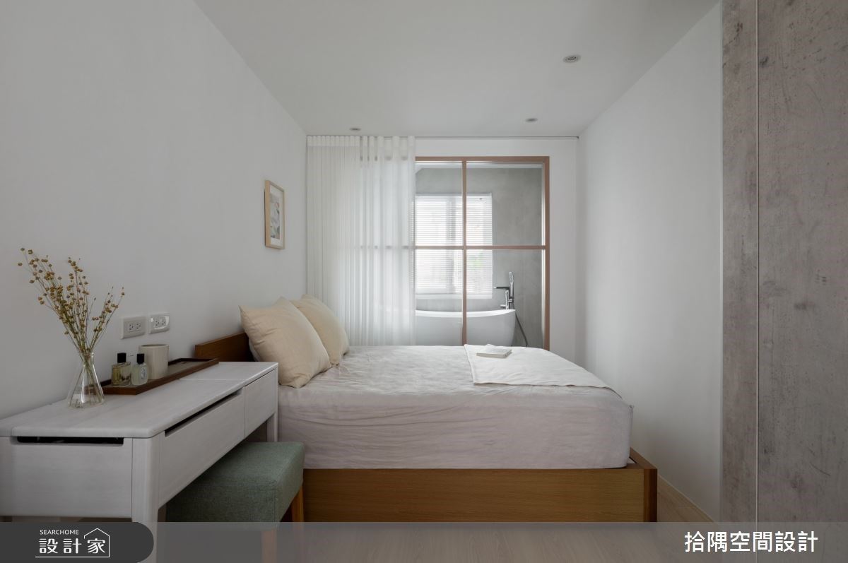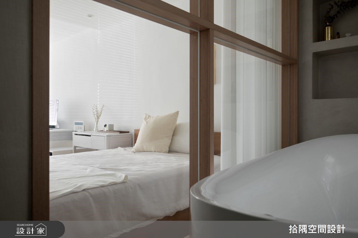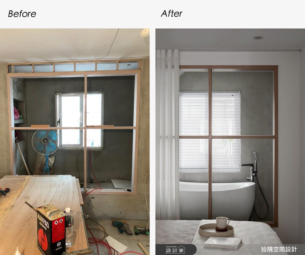 Point 03 三房改两房、放大主卧放置浴缸 请建筑师评估过後拆除其中一房的隔间墙扩大主卧空间,打造卧室内的开放式书房,另一侧原本配置的淋浴间将地坪垫高後埋入管线、增设浴缸;浴室与主卧的实体隔墙改成木框玻璃隔间,用浴帘保护隐私,优化长型空间的采光与视觉感受。浴室必备的三合一暖风机安排在靠墙处避免压迫到太多屋高,维持在使用上舒适的空间感。另外,多数老房子都是安装窗型冷气,因此在更换冷气时也一并修改了排水孔与管线,并挪用一些阳台空间延伸厨房尺度。
