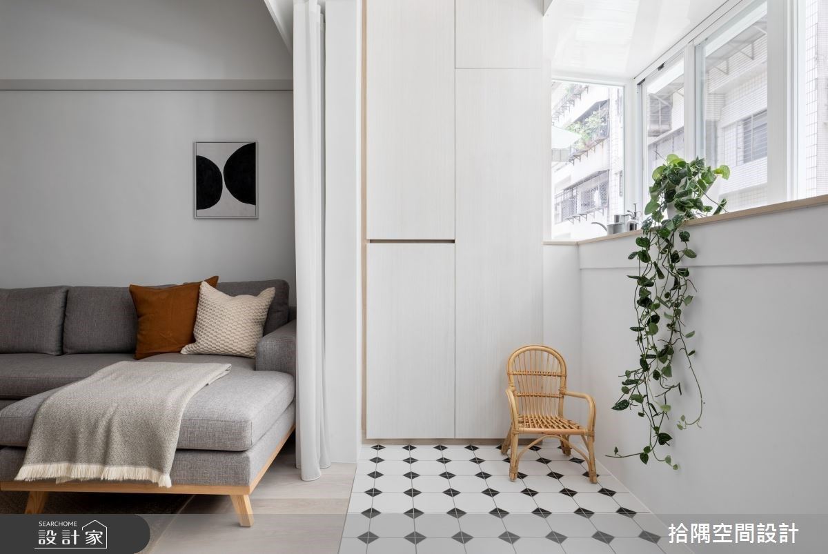 老公寓的阳台透过老屋翻新,将原本的阳台纳入室内,保留窗户在女儿墙上方,将铝窗改为气密窗,并以木质感打造室内阳台的台面,靠墙处规划鞋柜满足收纳需求,地面采用黑白色的地砖,一开门就感觉俐落简约,黑白分明凸显视觉焦点,但又与整个空间不显突兀。