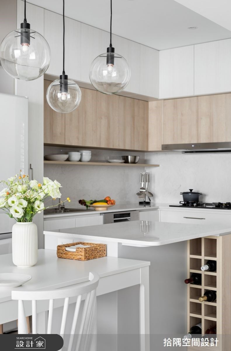 屋主的需求为色彩明亮的居家,以浅色调为主,但由於老公寓屋高不高且仅单面受光,设计师通盘考量後把整个厨房和书房隔间都打开,成功引光入室,开放式厨房增加一整排的收纳空间,餐厨区的柜体以白色和木纹质感交错不显压迫,吊柜下方规划开放式层板,丰富线条感,整面餐厨柜体部分门板、部分开放,视觉也不呆板。从玄关、客厅灰色电视墙,到餐厨区白色、奶茶色及木纹质感,整体色系和比例相当协调,令人惊艳!