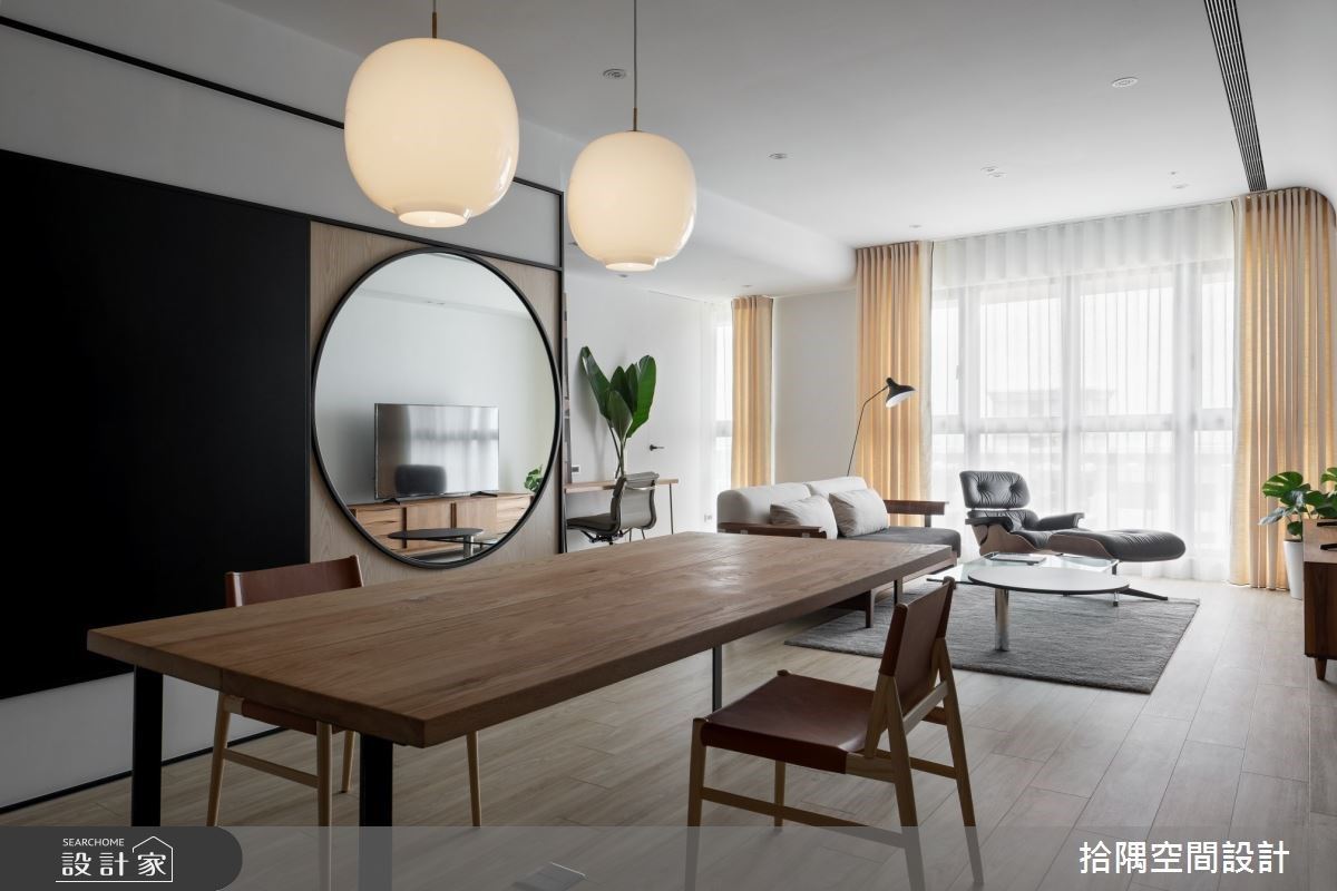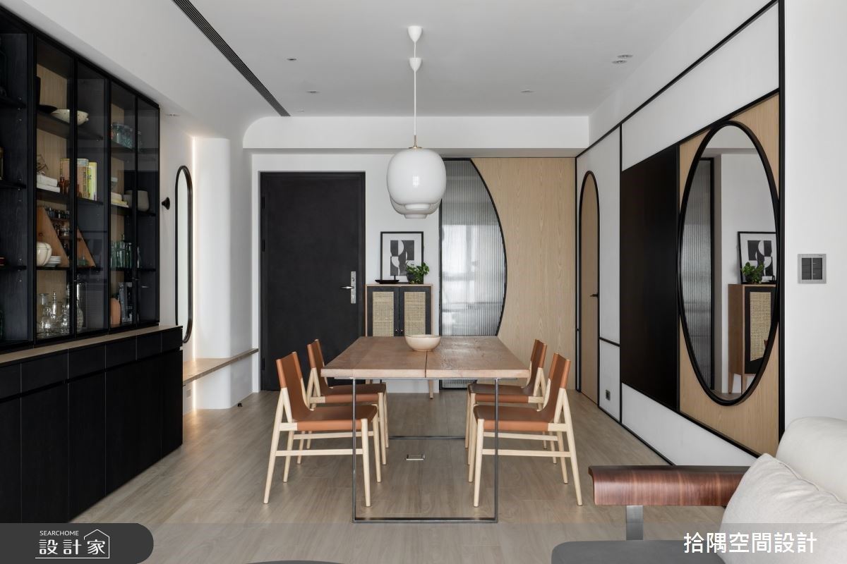 21 坪混搭风的屋主喜爱黑色、几何、镜面、老物件这些元素,看似简单的线条、图块,其实壁面的曲度、线条比例和角度的拿捏,都需要高度专业的设计师讲究细节、精密计算,才能达成屋主的梦想宅邸。餐桌旁的墙面一方一圆,与拱门一同串联到厨房的弧形推拉门,厨房门片结合玻璃具穿透感,即使屋主在厨房做菜,也能与公领域的家人互动。