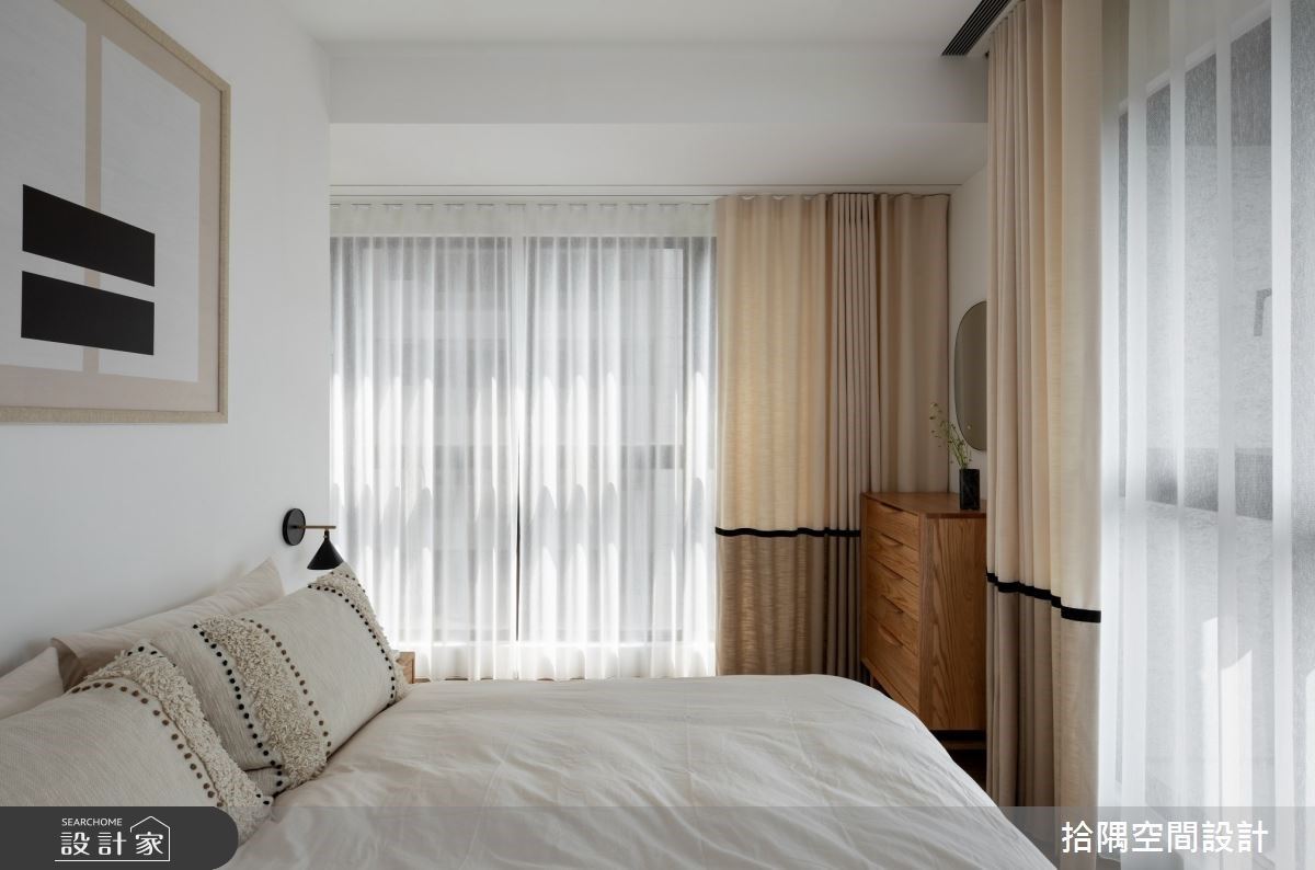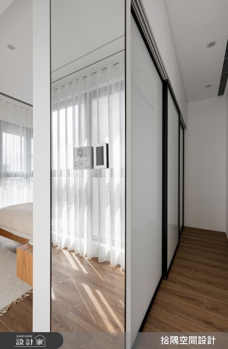 此屋宅位於边间采光好,屋主对梦想中的家已有想法,个人也颇具品味,设计师规划时在软装和立面上都有综合考量,主卧的窗帘上方有黑色腰带,增添视觉活泼感,主卧墙後方规划更衣室,门片采用烤漆玻璃,透过反光材质看起来较没有压迫感。