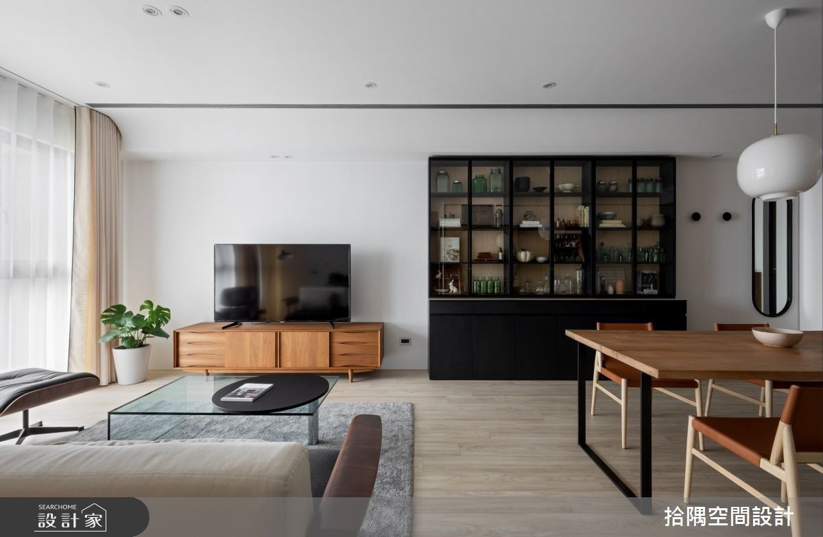 由於居住地较为潮湿,客厅地板特别采用石塑地板比较防水,石塑地板也有仿木的视感,电视墙旁的木作黑色柜体,陈列屋主心爱的收藏品,也是视觉焦点。