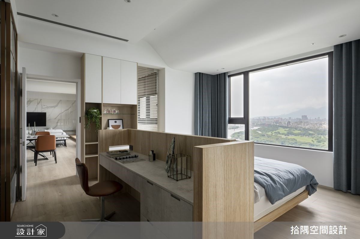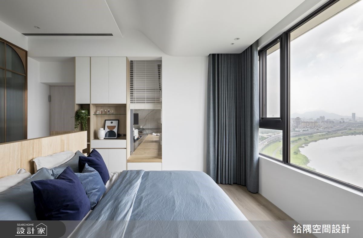 此案为 65 坪的混搭风宅邸,享有开阔舒心的河岸景观,是一家三口最爱的亲子宅。 为了享有窗外景致,主卧床头采木作半高、面窗不靠墙方式,床头两侧利用局部镂空,收纳生活小物件;床的两侧预留走道,形塑弹性的行走动线,背面则转为化粧台与书桌机能,并邻近更衣室。更衣室利用长虹玻璃、镀钛材质,下方仿大理石纹的拉门划分领域;更衣室内部以ㄇ字型规划整体收纳、展示动线,一目了然,中央则利用中岛收纳小型精致的风格配件。