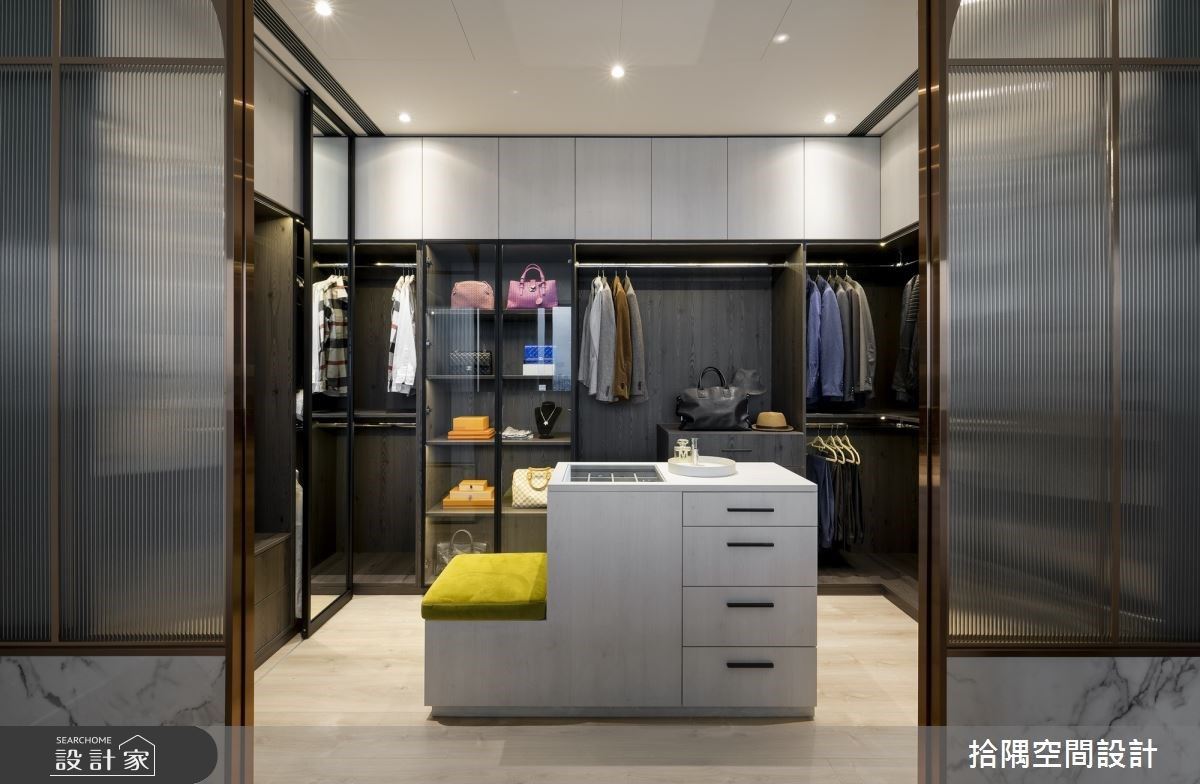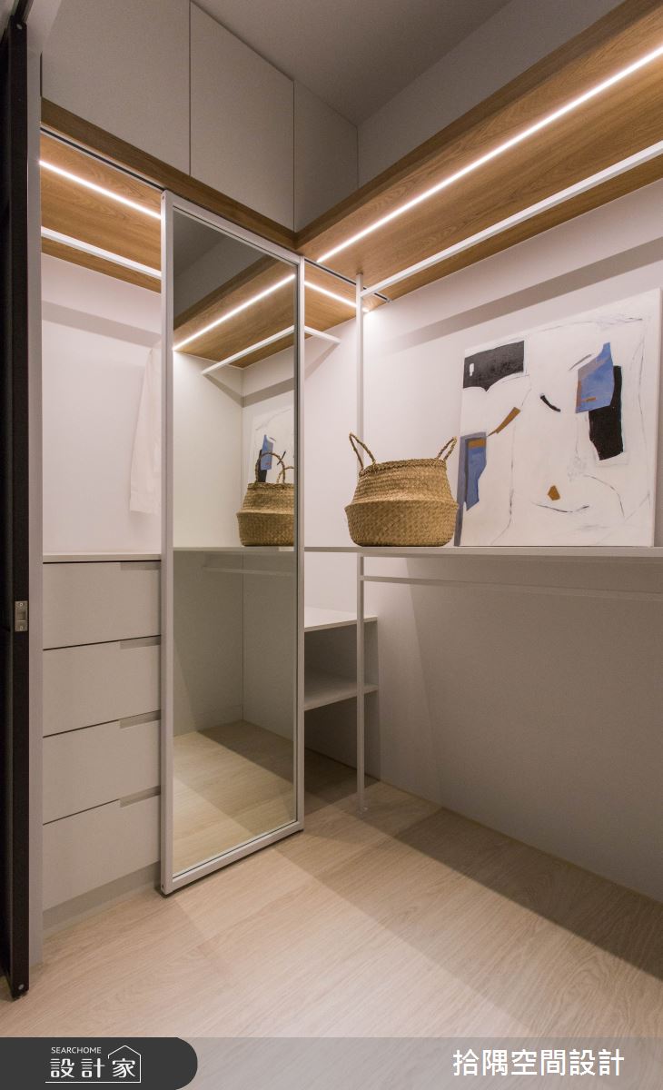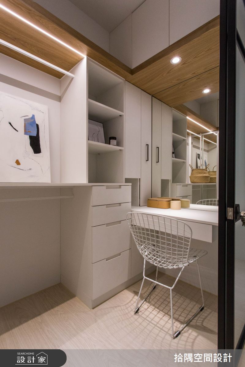 利用一旁利用铝框玻璃拉门界定更衣室,门片贴雾模的方式,可保有室内更衣的隐私性。内部规划ㄇ字型动线,串连梳妆台、收纳与展示空间;衣柜立面结合轨道落地滑镜,平时可拉出镜面清楚浏览穿搭细节;柜体上方木纹底部嵌入LED灯条,创造柔和、舒适的休憩氛围。