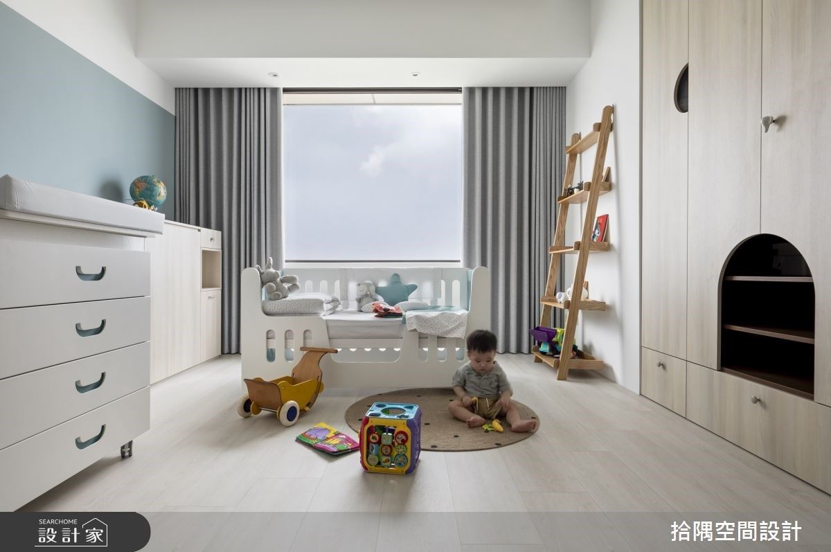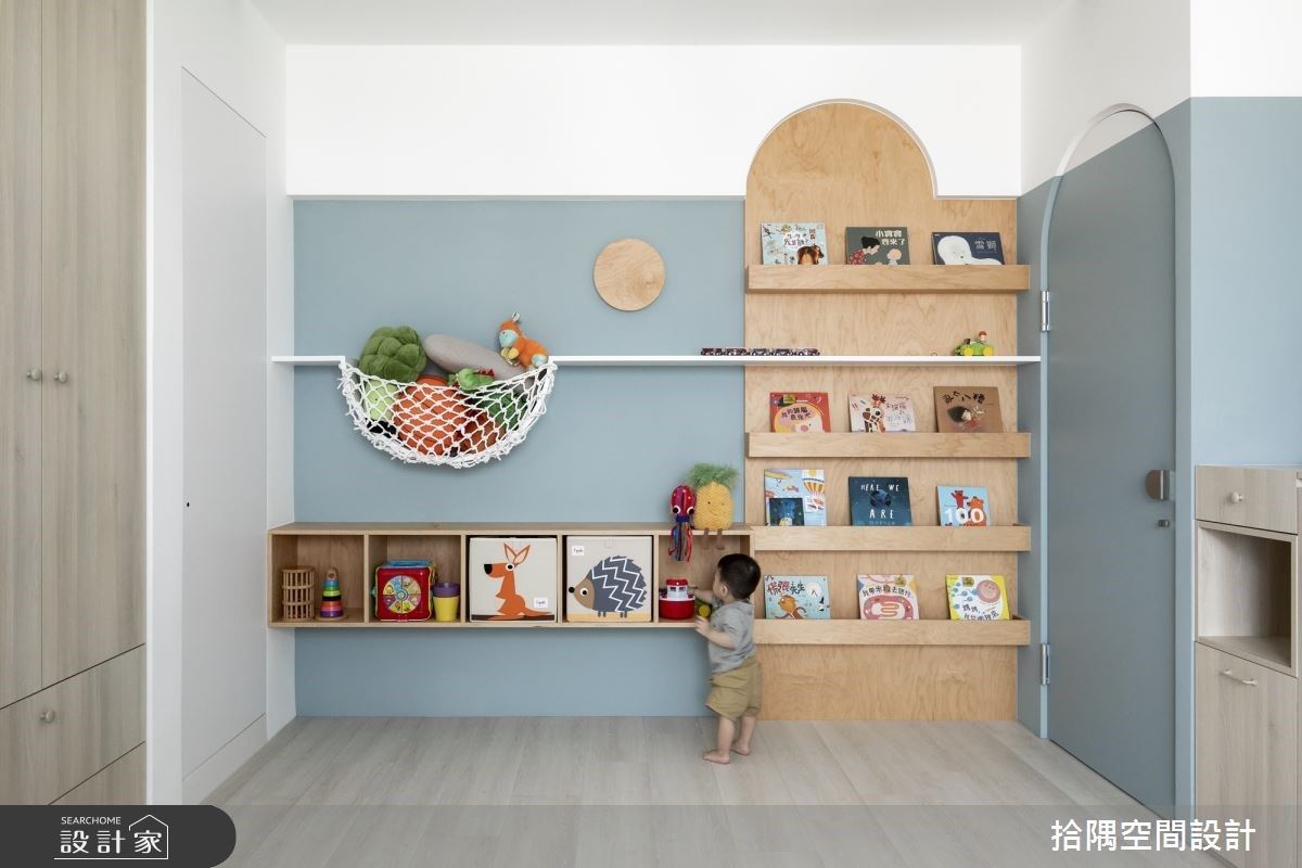 小孩房利用系统柜满足造型与收纳设计,局部镂空安排,避免压迫感;白色木工导圆型层板串连网子,营造灌篮意象,下方木作柜体陈列小朋友的玩具与书籍。