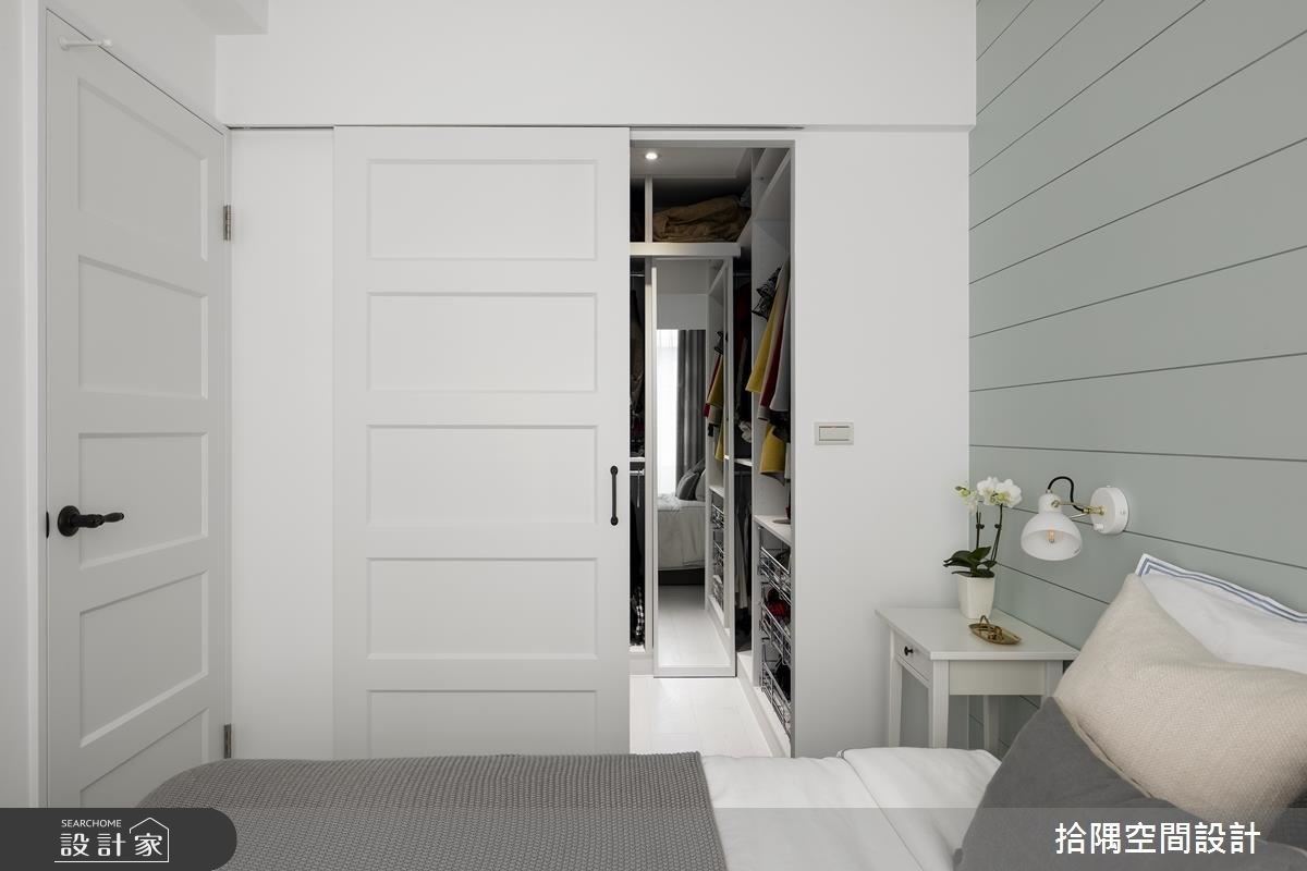 此案为 14 坪老屋翻新的质感美式宅,卧室空间里藉由色彩、窗边空间、壁面展示收纳与灯饰等细节,交织轻盈、简约的动人美式风质感。 主卧床头墙饰以浅绿色、木板沟缝拼接的原始质感,植入清新气息;墙头搭佐对衬白色壁灯,倾注精致美感。利用与入口门片同造型的白色线板拉门区隔更衣室,对称造型呼应美式风格质感,并善用领域置入收纳机能,同时让睡眠区更显宁静。