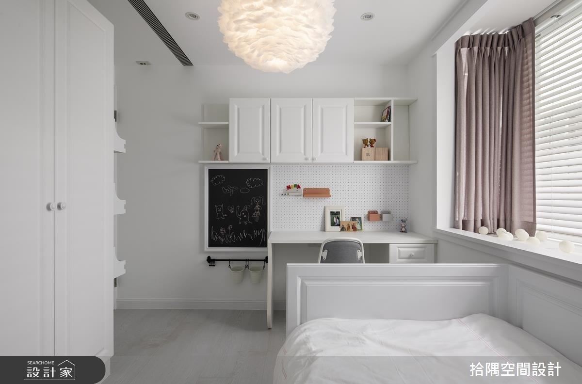 小孩房持续延伸公领域的白色美式风格,并善用壁面空间佐入展示、收纳机能,且善用老屋独有的结构窗台作为收纳展示区;书桌结合冲孔版提升收纳量,一旁融入小型黑板,满足随意涂鸦的生活乐趣。