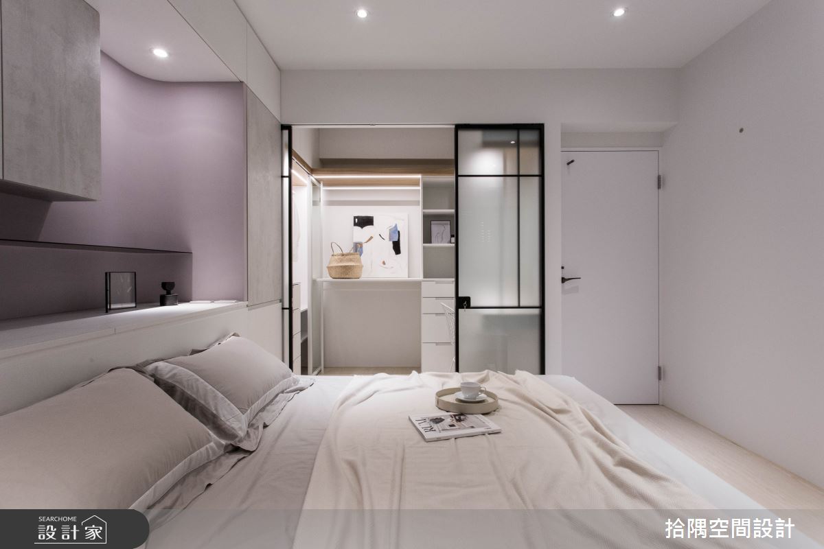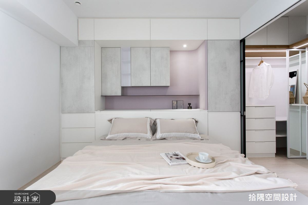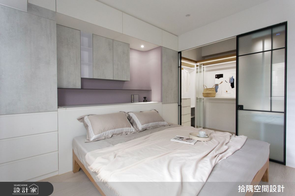 此案为 28 坪、融入日系质感的现代风场域。有别於公领域大量使用木纹质感,主卧空间使用屋主喜爱的紫色调,并善用有限坪效,提升收纳机能,并置入更衣室、梳妆台空间,体现美感与机能兼备的优质卧室 由於主卧坪数有限,透过灰紫白三种浅色调为基底,提升视觉明亮度,避免空间压迫疑虑。浪漫的紫色床头墙导弧角,串连清水模造型壁面;为了争取更多收纳空间,床头融入上掀柜,壁面拉出更多深度,置入漂浮感柜体,并一路延伸到天花板的白色柜体。