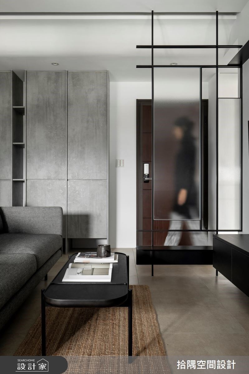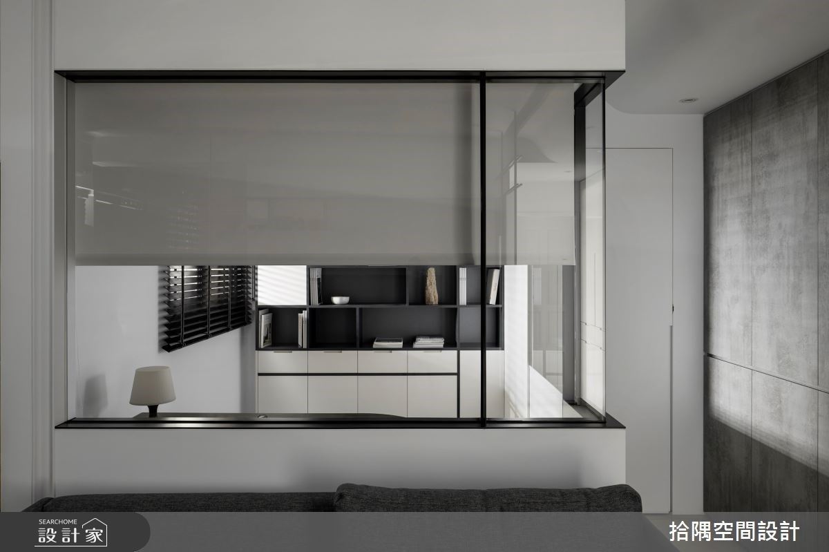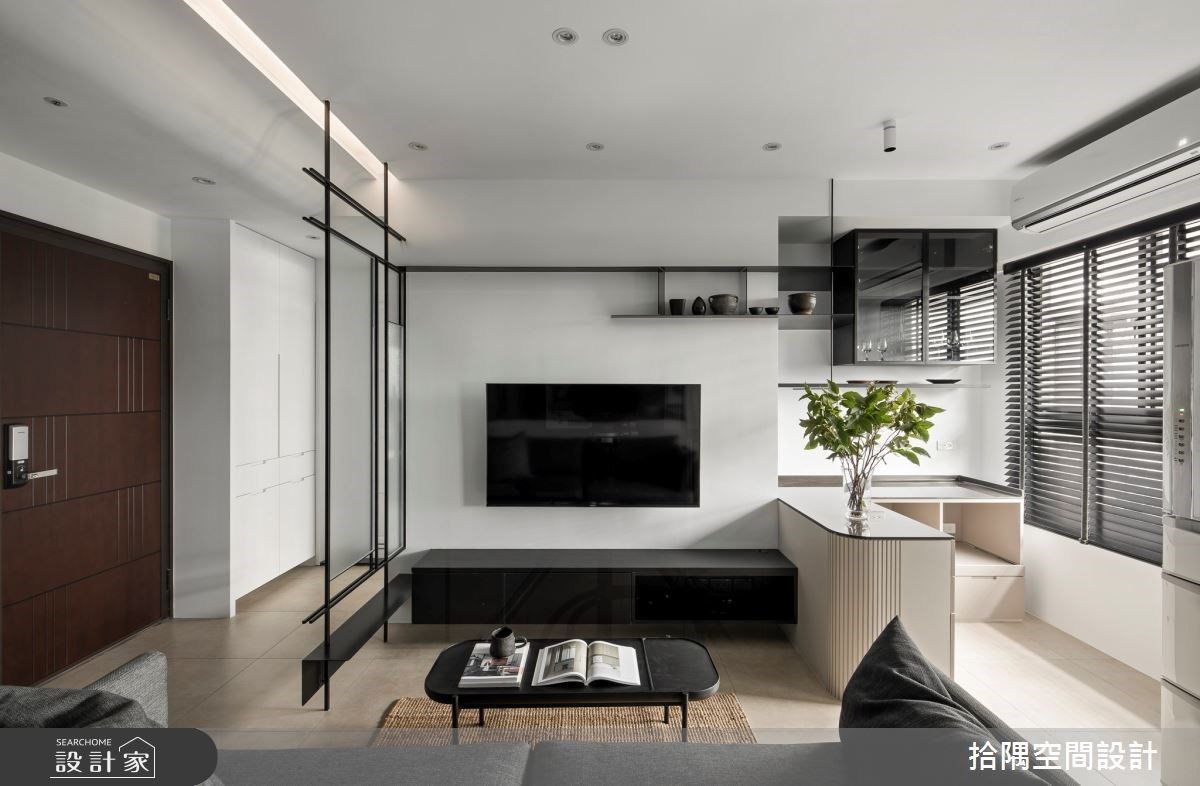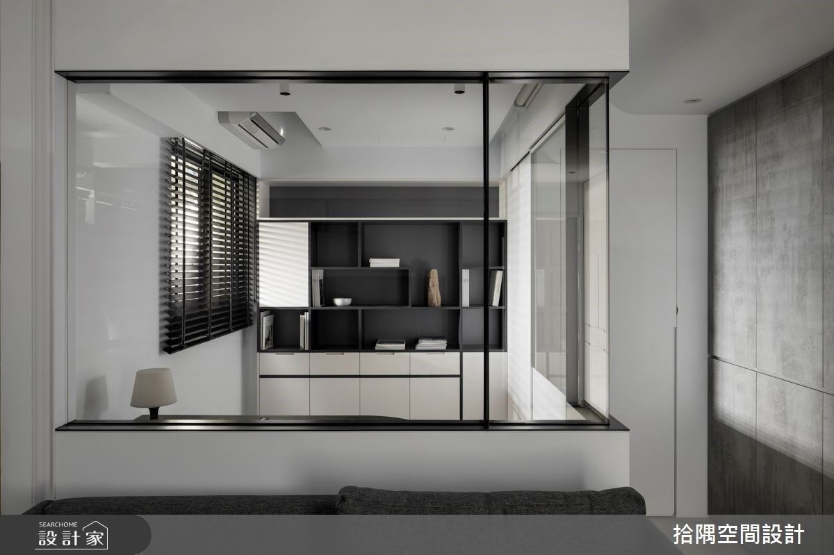 此案为 13 坪 2 房混搭风单身小宅,整体空间透过黑白灰色系打底,呼应男屋主中性化风格。玄关利用铁件与玻璃隔屏,划分内外场域,通透立面特性,延伸室内情境。善用电视墙侧边的凹槽创造餐厨区,安排工作台面、下方收纳柜,及镜面悬空柜体与收纳,让坪效发挥到最大。书房融入玻璃隔间,通透视觉及开放书墙设计,让空间延伸、放大;当亲友需暂时投宿时,将卷帘放下,成为独立休憩空间。