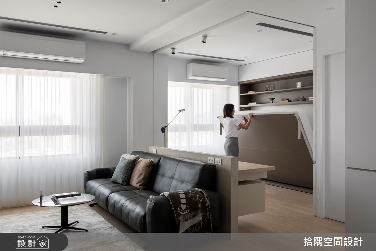 22 坪简约风退休宅里,以白、灰色系延伸空间基底,木纹地坪铺设出温润质感。入口收纳机能延伸至客厅,开放玻璃展示柜衔接电视墙,让空间更延伸。浓缩原有客厕空间,在餐厨区打造一座 L 型中岛,成为屋主平时泡茶、聊天的休闲场域。为了强化夫妻间的互动,书房舍弃隔屏墙,与公领域形成开放空间感;若亲友临时入住,可拉出壁面嵌入的下掀床,及侧边大滑门,形成独立休憩空间。